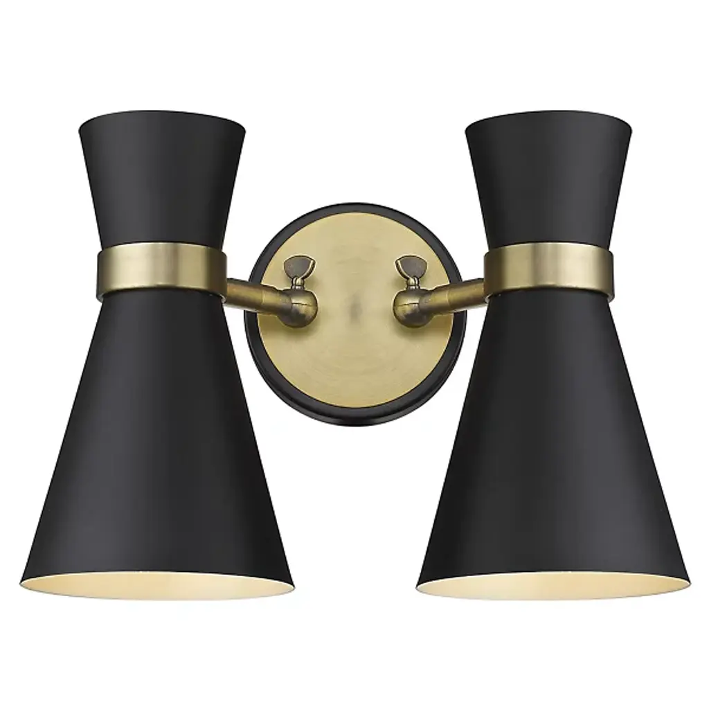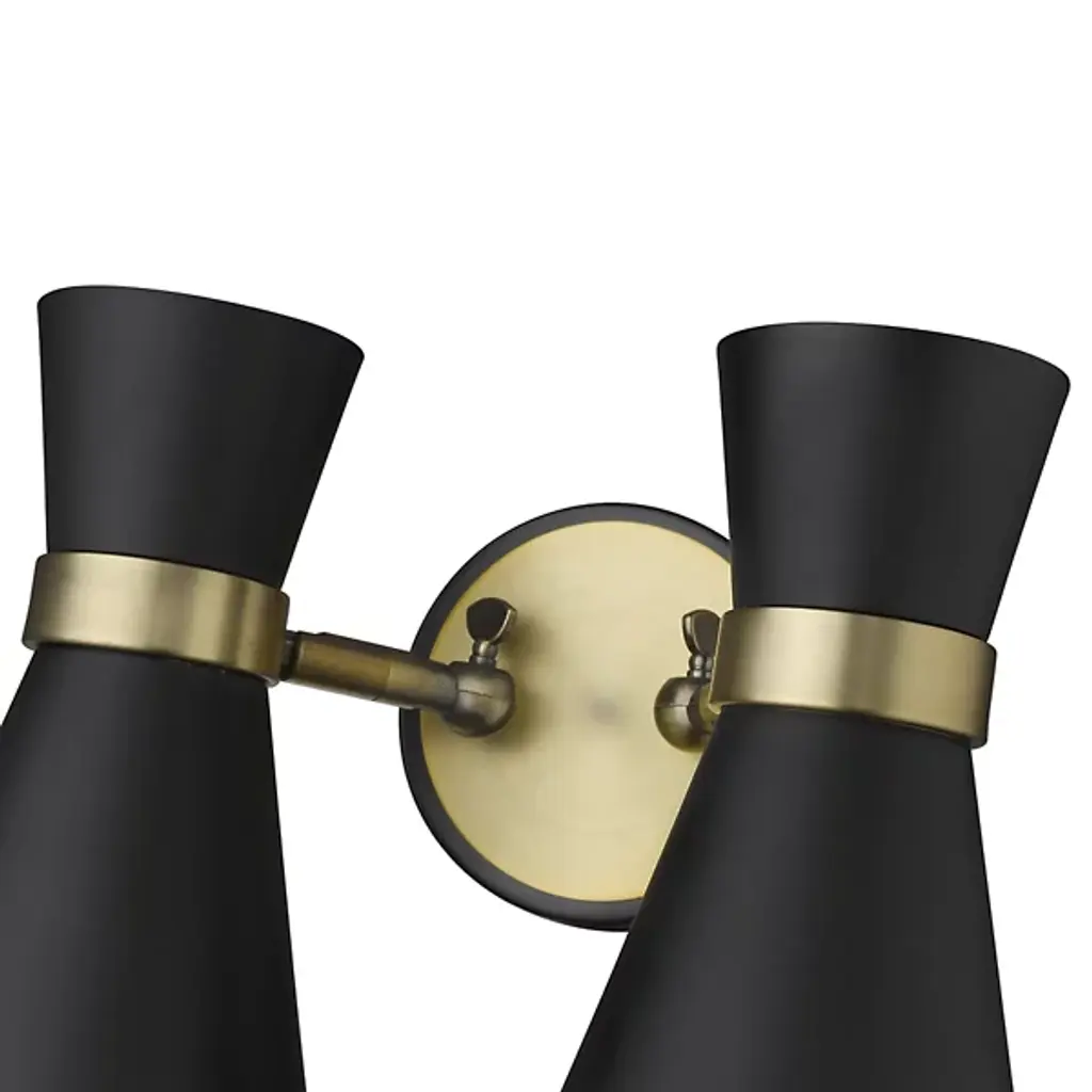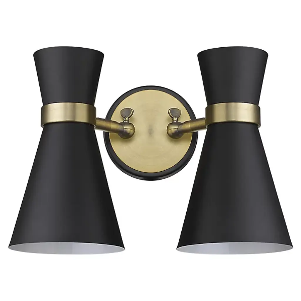 The most beautiful things often come in pairs, as shown by the high-style Milton Double Wall Sconce from Alder & Ore. The sconce fuses industrial and mid-century modern influences. It looks tidy on the wall with a compact circular backplate. A pair of jointed arms adjust the angle of the shade, making it a great simultaneous wall-washing and reading light. This light streams out the tight openings of the tapered shades with minimal glare. The double-sided shades pair with contrasting rings for a prominent silhouette.