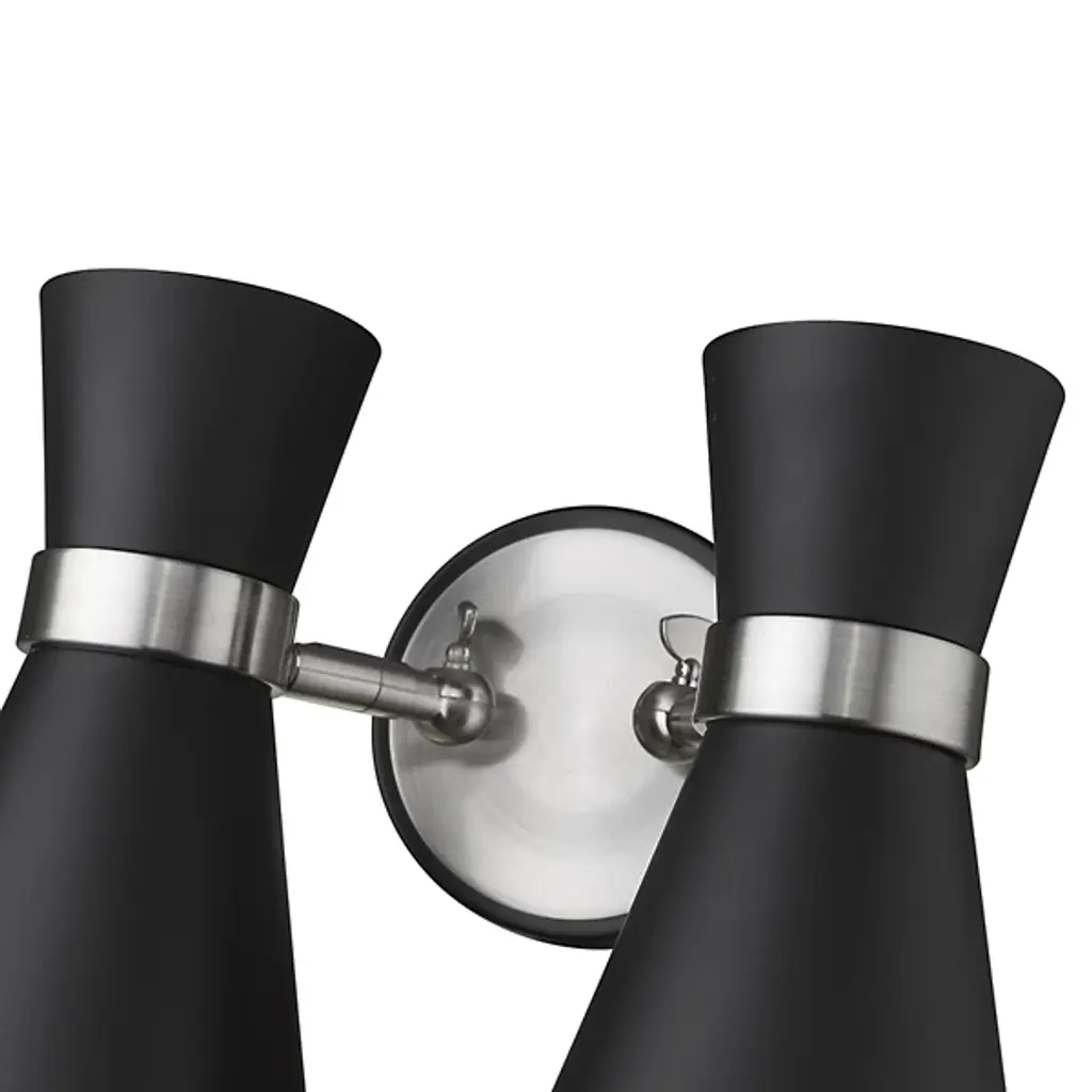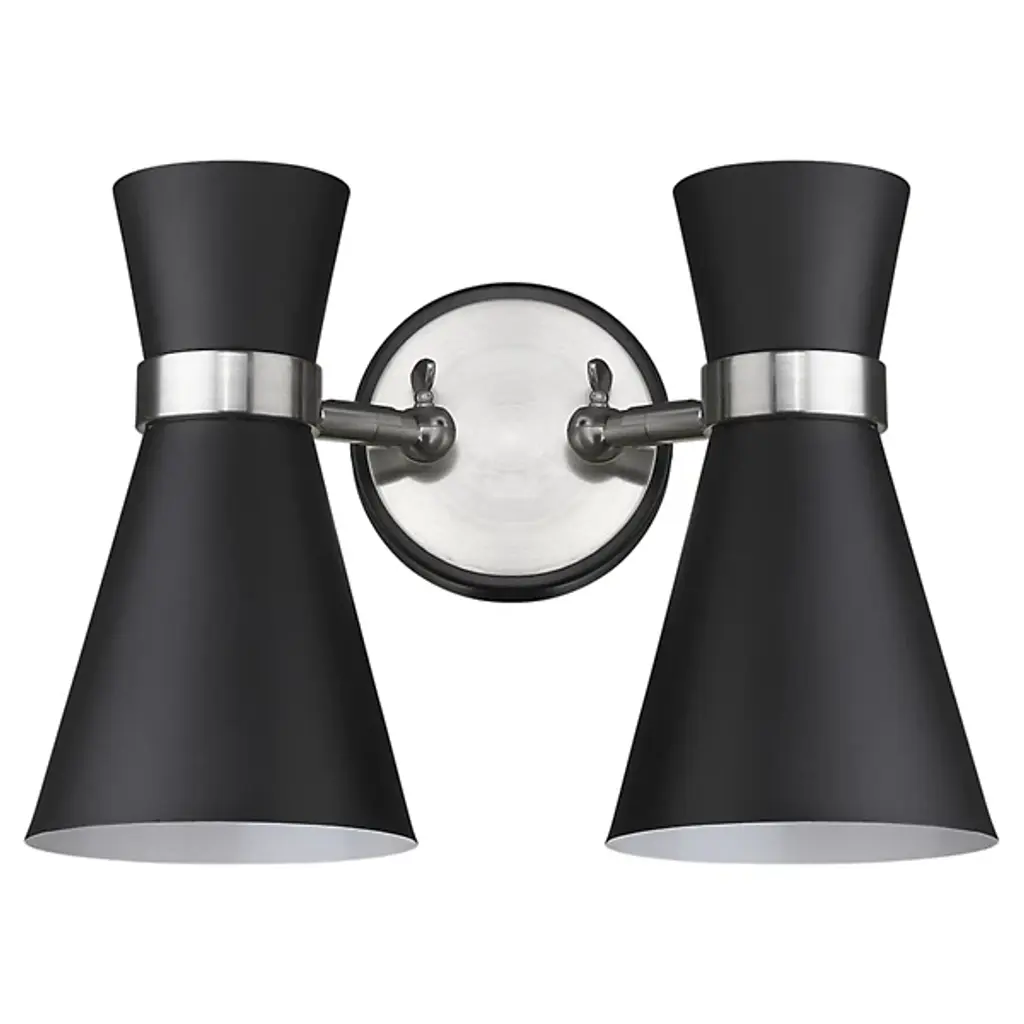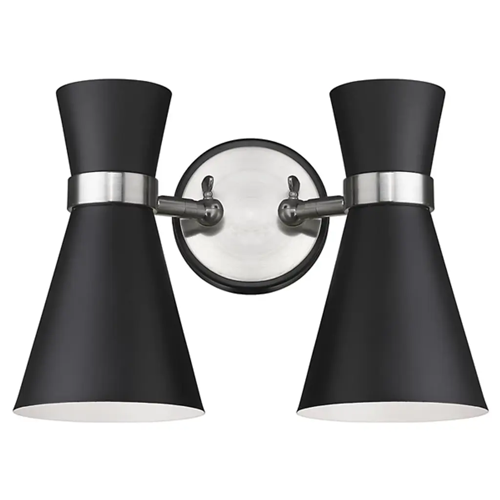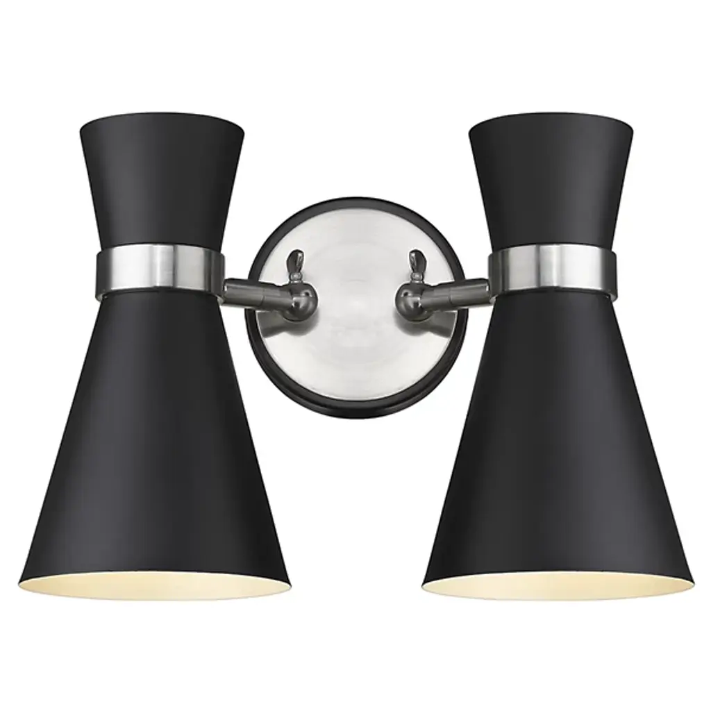 The most beautiful things often come in pairs, as shown by the high-style Milton Double Wall Sconce from Alder & Ore. The sconce fuses industrial and mid-century modern influences. It looks tidy on the wall with a compact circular backplate. A pair of jointed arms adjust the angle of the shade, making it a great simultaneous wall-washing and reading light. This light streams out the tight openings of the tapered shades with minimal glare. The double-sided shades pair with contrasting rings for a prominent silhouette.