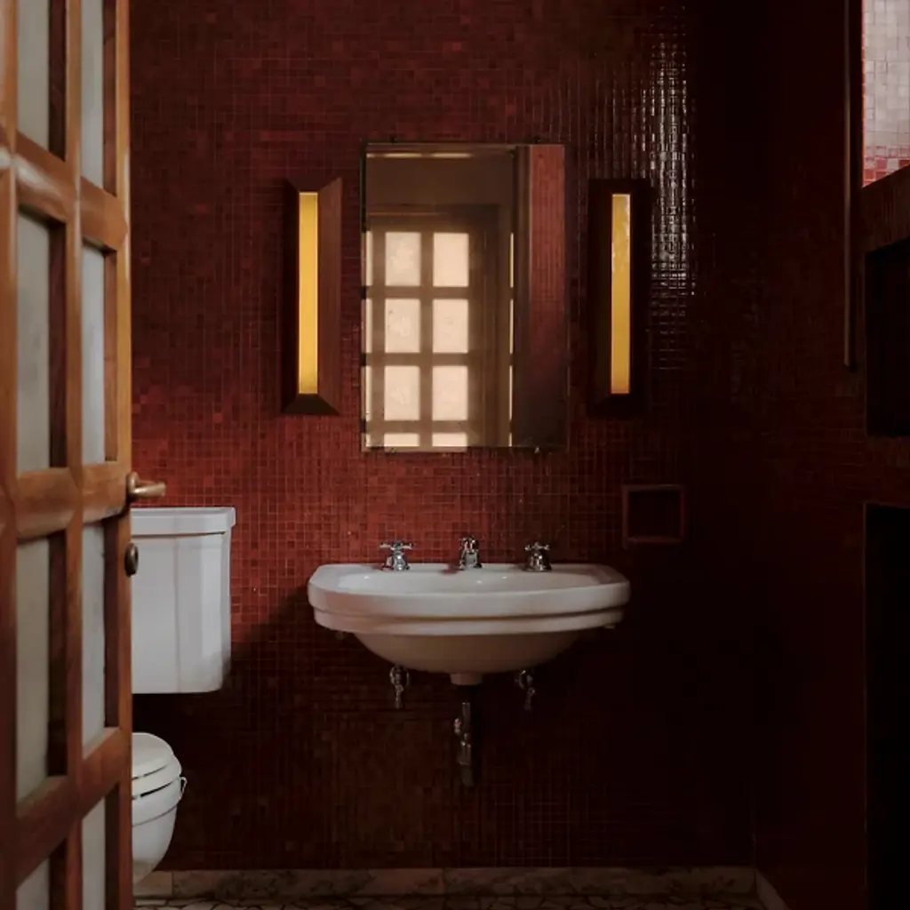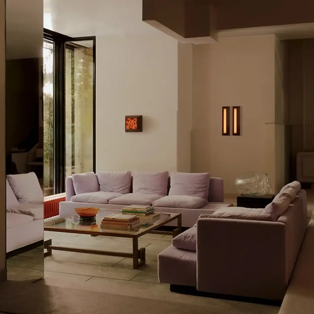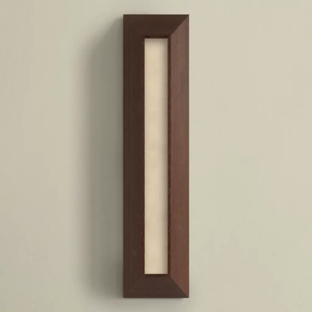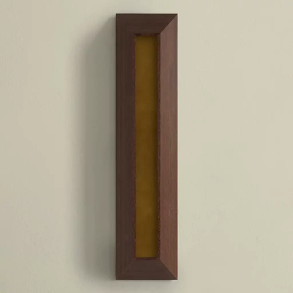 The Mira Linear LED Wall Sconce from In Common With dispatches warm light across its surroundings with an extended, rectangular profile that creates a bar of light. Made in the USA, it pairs an angular, beveled wooden frame with an inset pane of textured, patterned, and colored glass—each piece featuring unique details. A damp-rated LED rests within, sending a warm, even glow through the glass to highlight its surface variations. Optimized for both wall and ceiling use, it can function as lighting and as an artistic focal point.