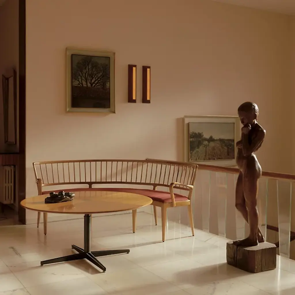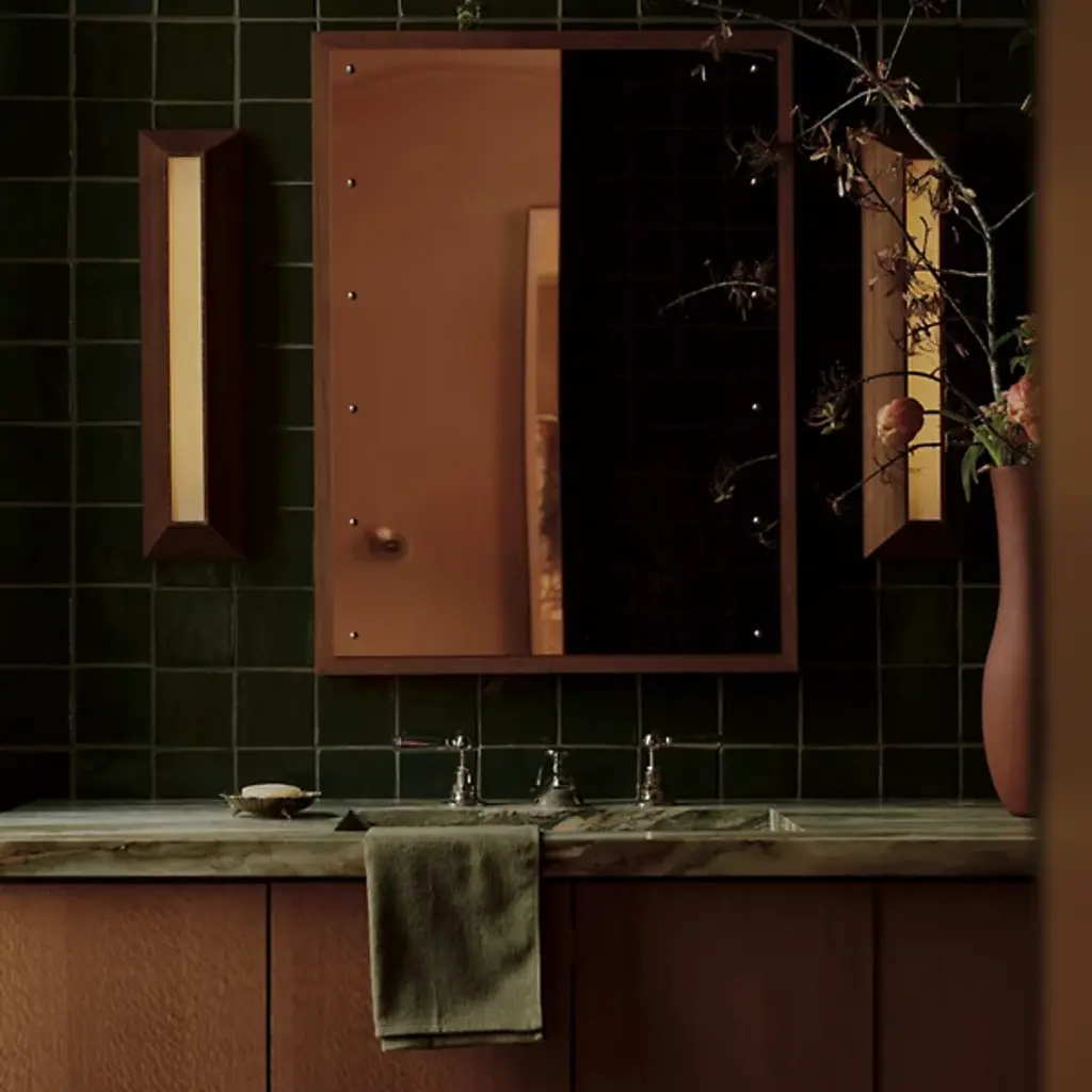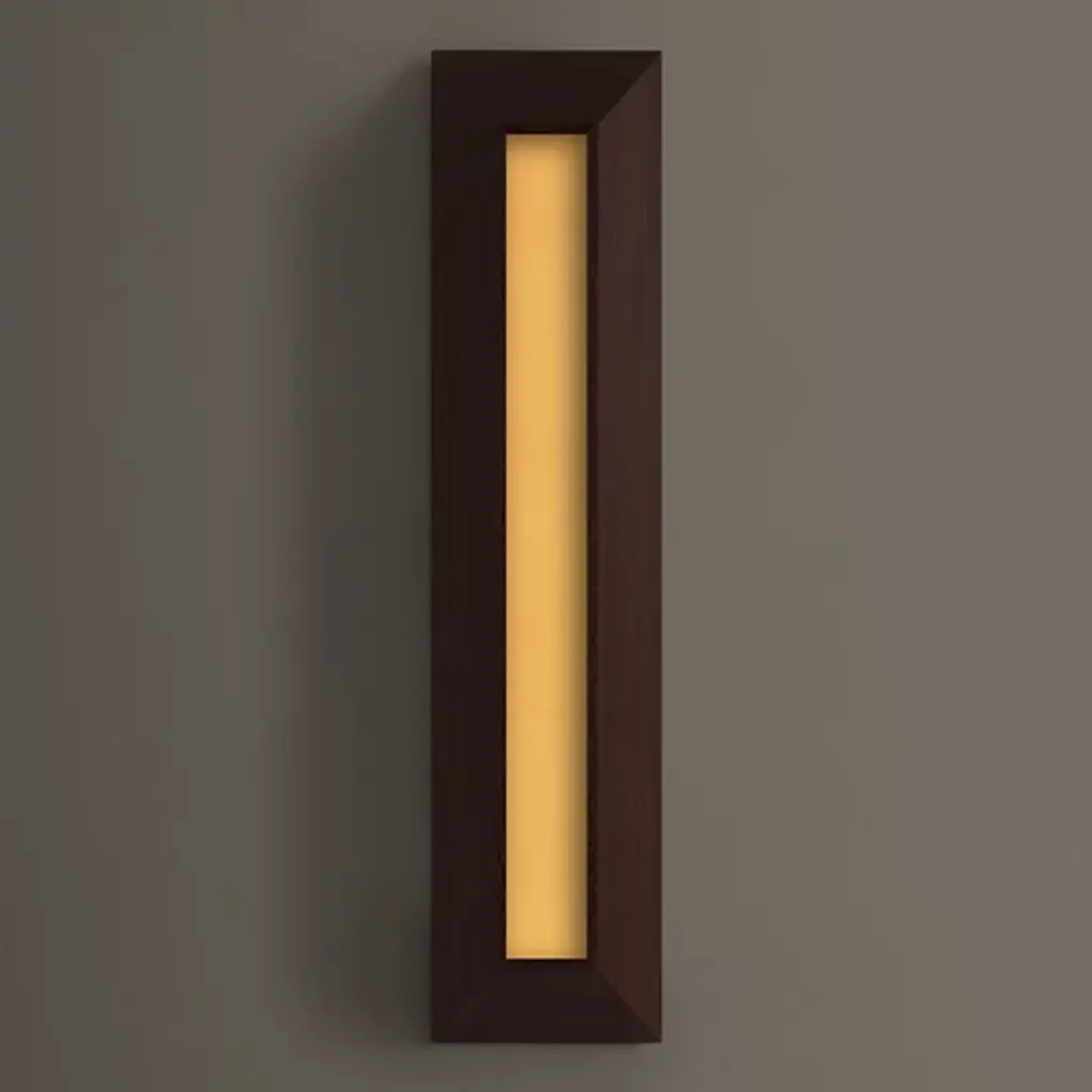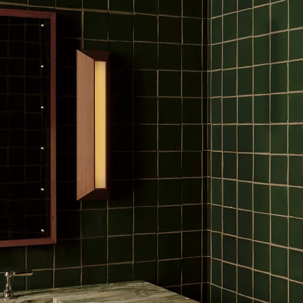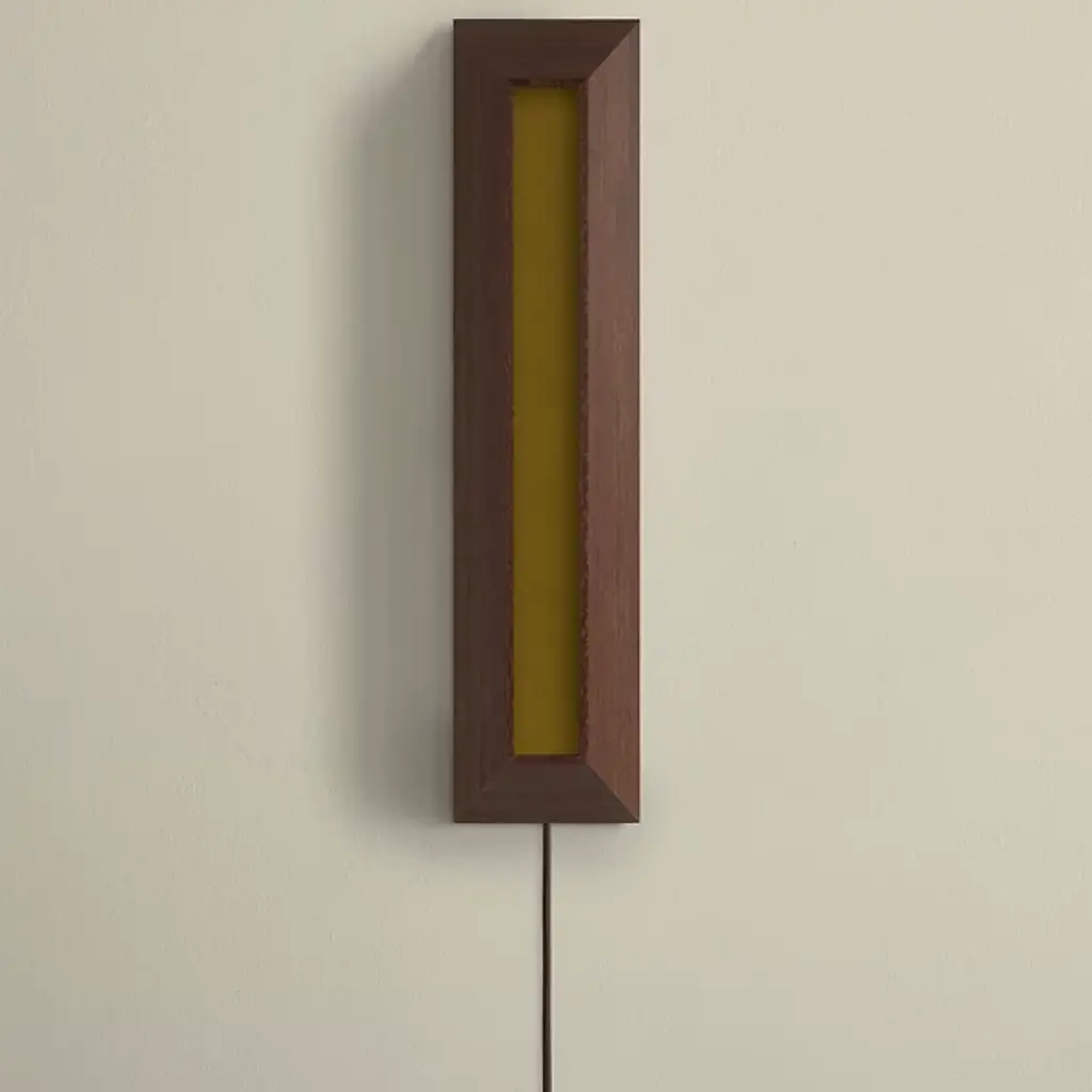 The Mira Linear LED Wall Sconce from In Common With dispatches warm light across its surroundings with an extended, rectangular profile that creates a bar of light. Made in the USA, it pairs an angular, beveled wooden frame with an inset pane of textured, patterned, and colored glass—each piece featuring unique details. A damp-rated LED rests within, sending a warm, even glow through the glass to highlight its surface variations. Optimized for both wall and ceiling use, it can function as lighting and as an artistic focal point.