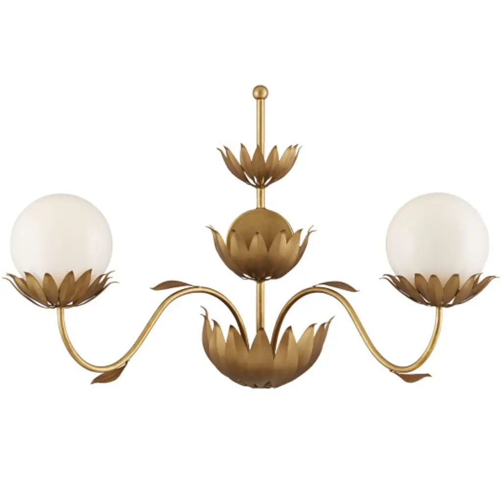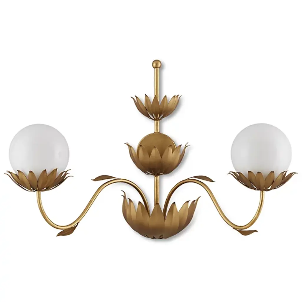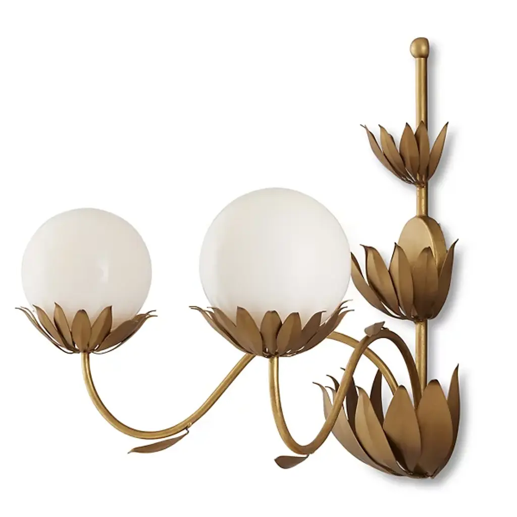 The Mirasole Wall Sconce from Currey & Company, designed by Tom Caldwell, evokes a sense of nostalgia inspired by the charming décor of classic American ice cream parlors. This fixture effortlessly evokes a sense of nostalgia. The milky glass globes rest gracefully on shapely stems that exude elegance. With its captivating design, the Mirasole Wall Sconce creates visual intrigue and charm. Delightful, whimsical details, such as the delicate single leaves that gently flutter from the stems, add a playful touch to the overall aesthetic.
