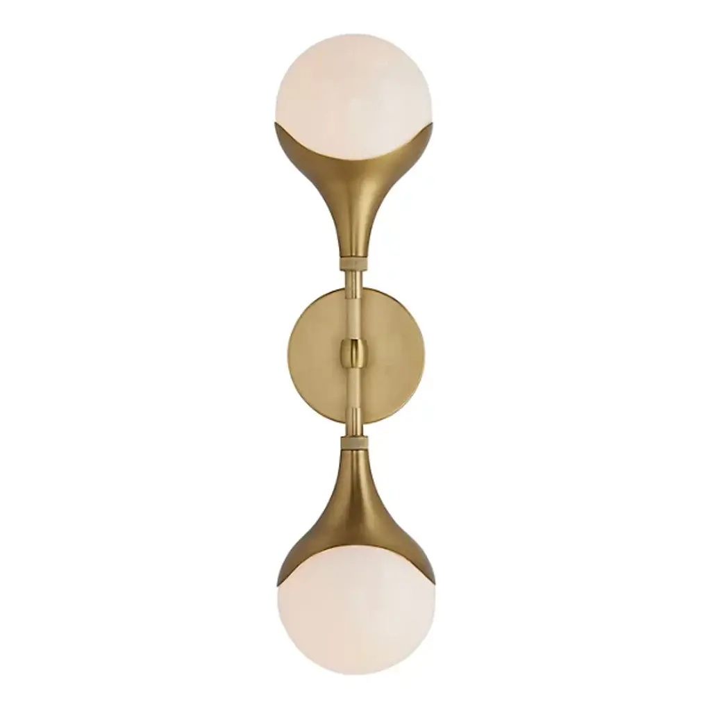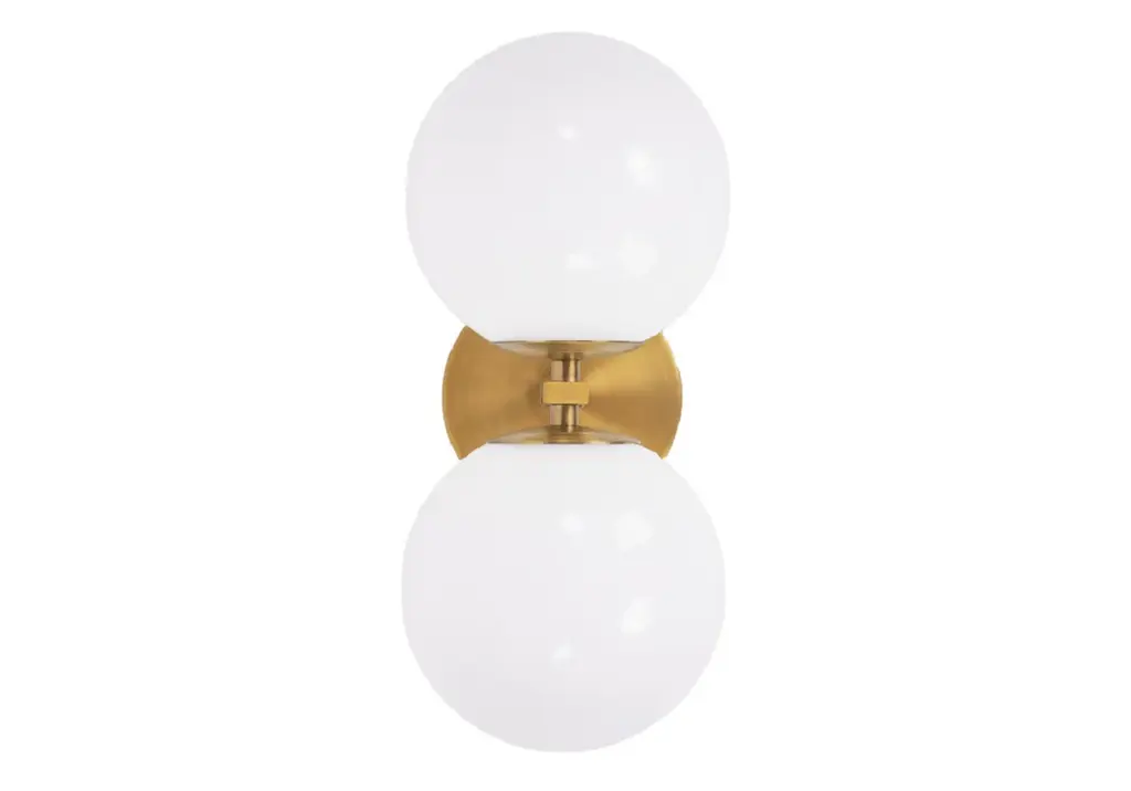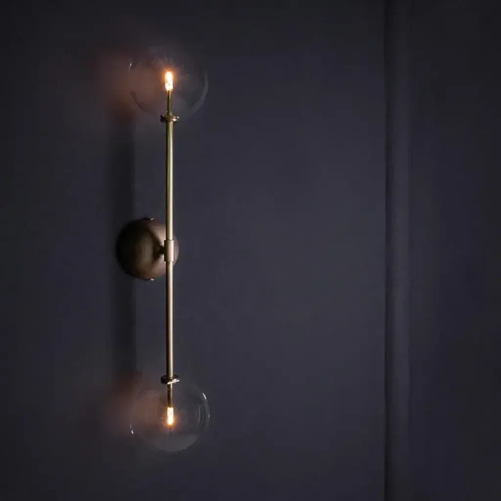 Miron brass wall sconce by schwung dimensions: w 15 x d 16 x h 79 cm materials: brass, hand blown glass globes finishes available: black gunmetal, polished nickel, brass schwung is a german word, and loosely defined, means energy or momentumm of a positive manner. Synonyms: verve, zest, panache, momentum. Mission: developing lighting fixtures through simple and timeless materials, sustainably; we are committed to creating quality products that last. Beginning with the design we are constantly refining aesthetic and function. Both in the lamps themselves and throughout the manufacturing process we pursue a holistic approach to efficiency, and the reduction of environmental impact. up to 250v (europe/uk standard).