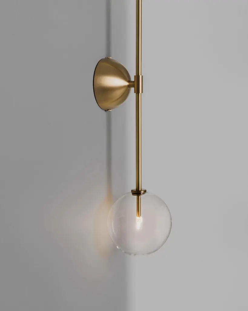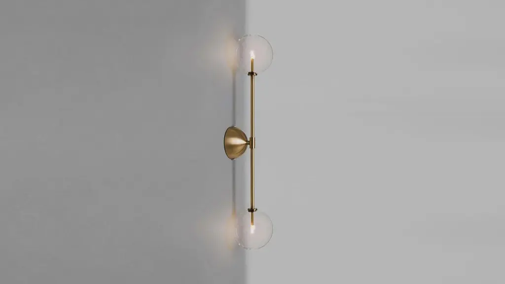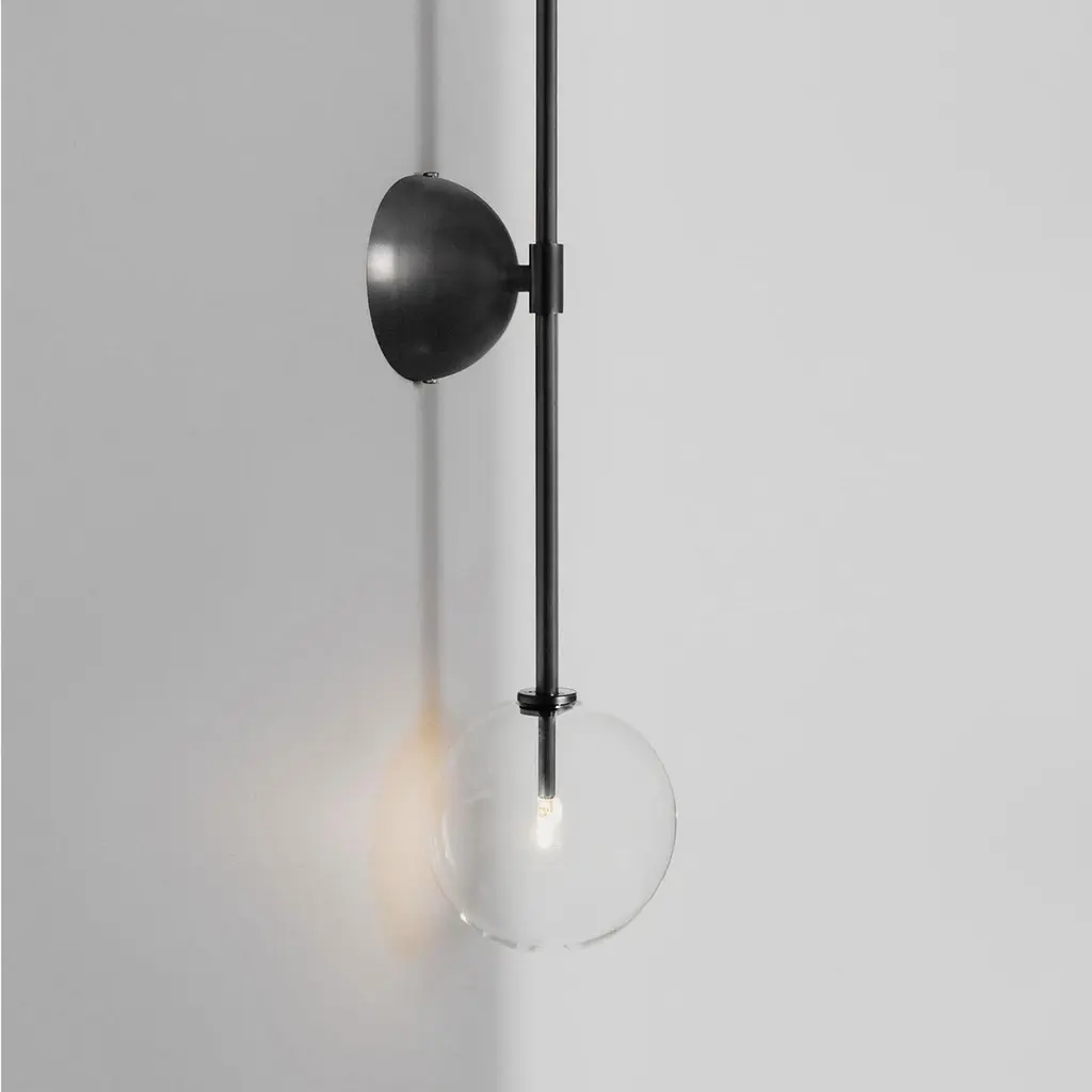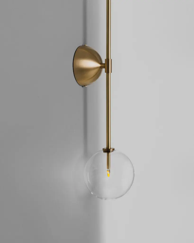 Two glass globes balance on either end of a single vertical arm, poised upon a conical brass mount. This stylish linear composition creates a balanced and minimalist impression.Available in our three signature finishes: Lacquered Burnished Brass (LBB); Black Gunmetal (BGM); Polished Nickel (PN)Schwung ClassicsClassic is a concept, a family of lamps inspired by the visual nature of glass and electric light. Rather than a collection, the Classic concept comprises an array of signature pieces realized with “soap bubble” glass and exposed bulbs. Striking illuminated arrangements, the Schwung Classics are constellations of brass and glass. Carefully crafted in Poland, the precision of shape and material amplify their arresting crisp quality of light. Made in the tradition of Bohemian glass, with its lineage in Central Europe for over a century; highly durable borosilicate glass is blown into thin, durable transparent globes, intensifying minimal brass fixtures with an irresistible sparkle.Dimensions:Width: 150 mm / 5.9”Depth: 157 mm / 6.2”Height: 790 mm / 31.1"Weight: 1.9 kg / 4.2 lbLight sources available:LED Bulb (included) 2 x 1.6 W