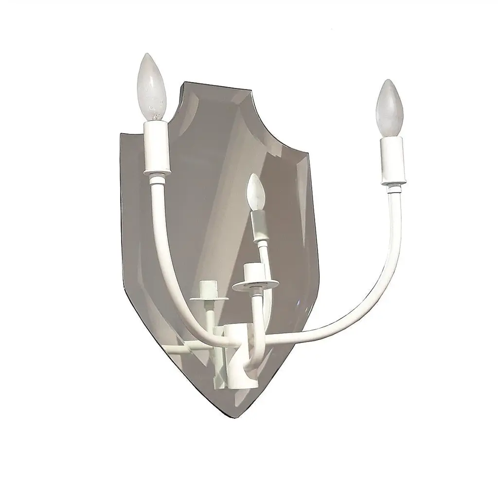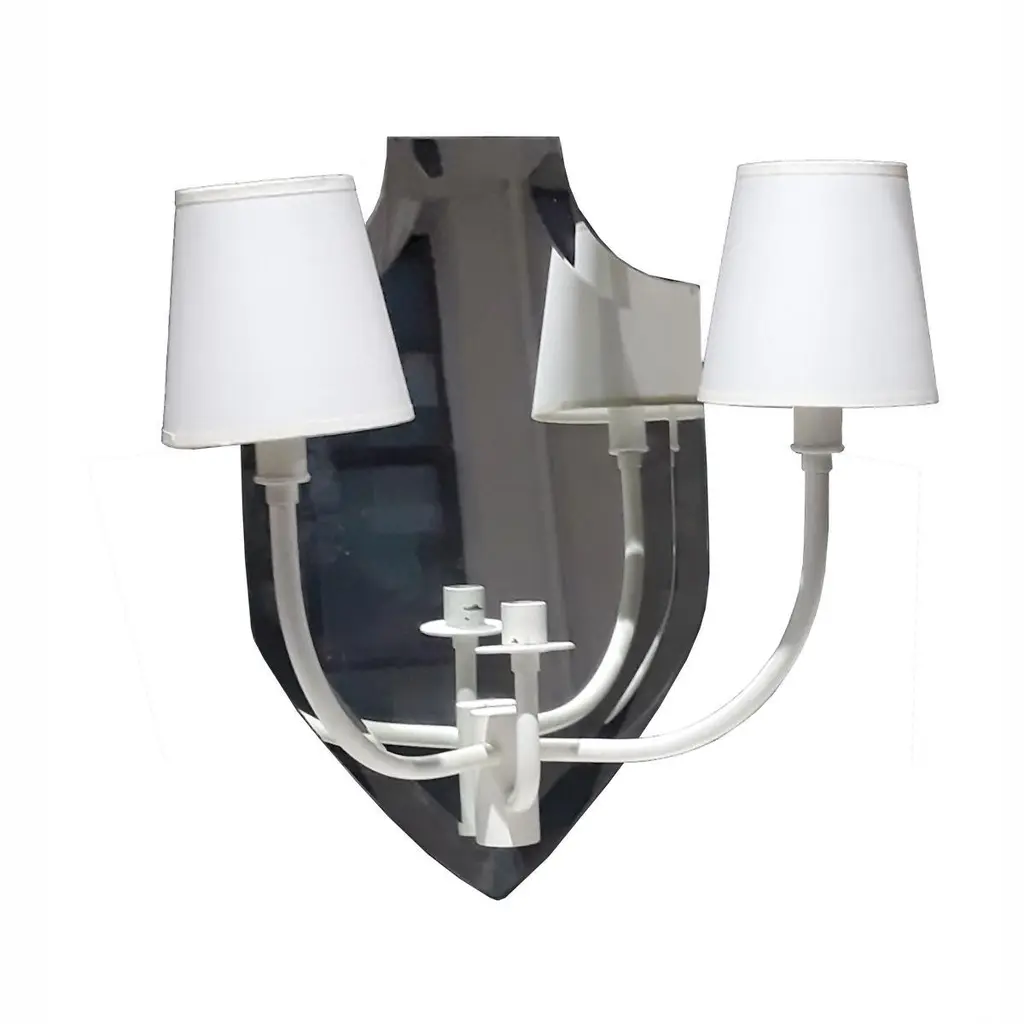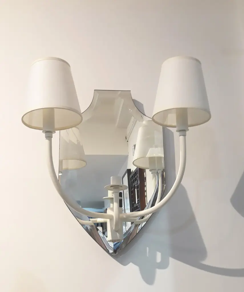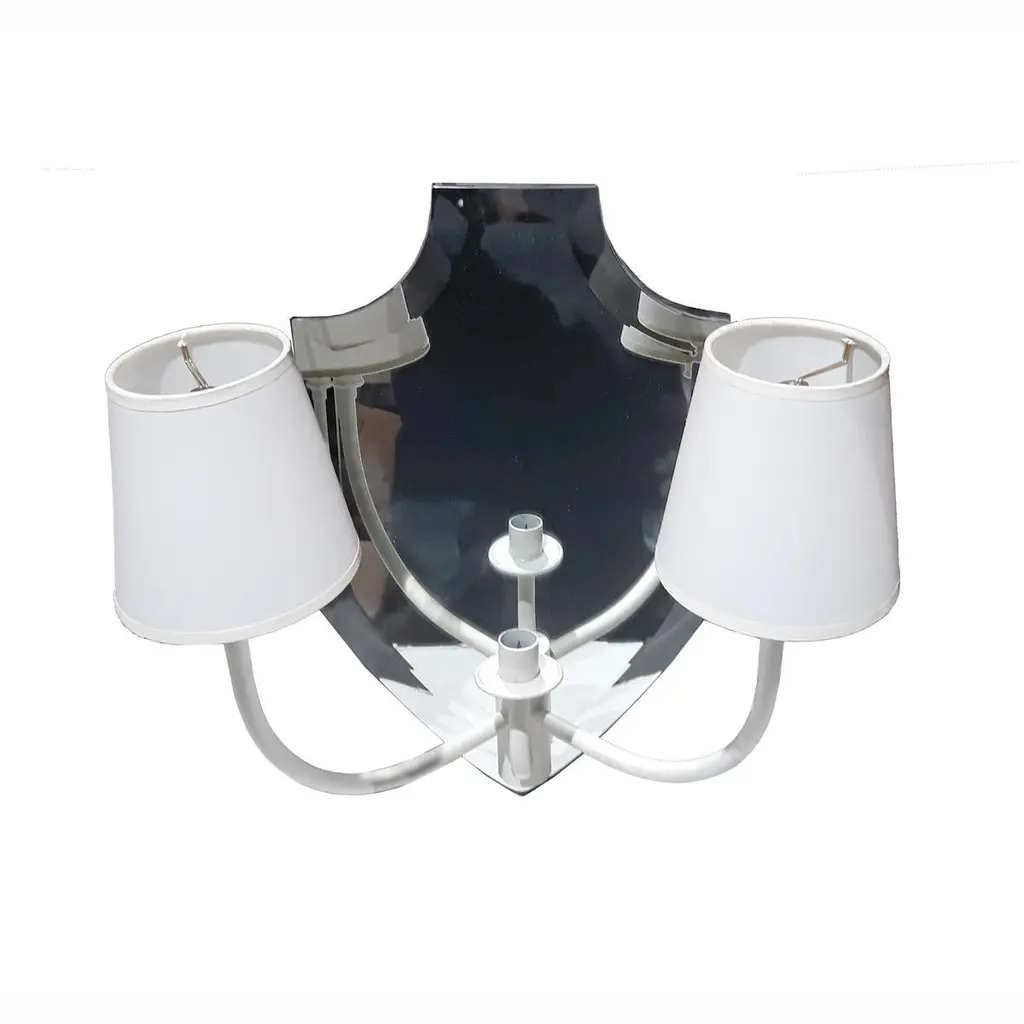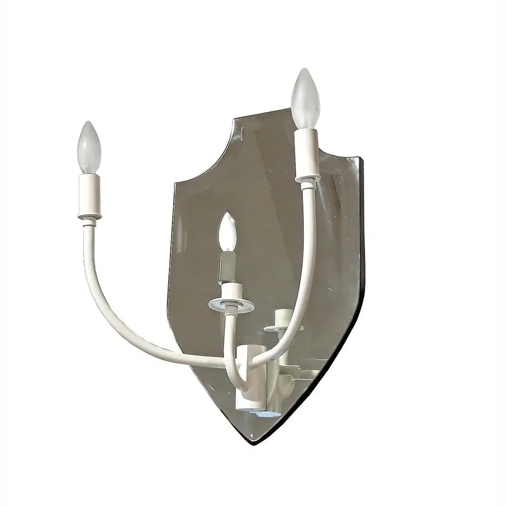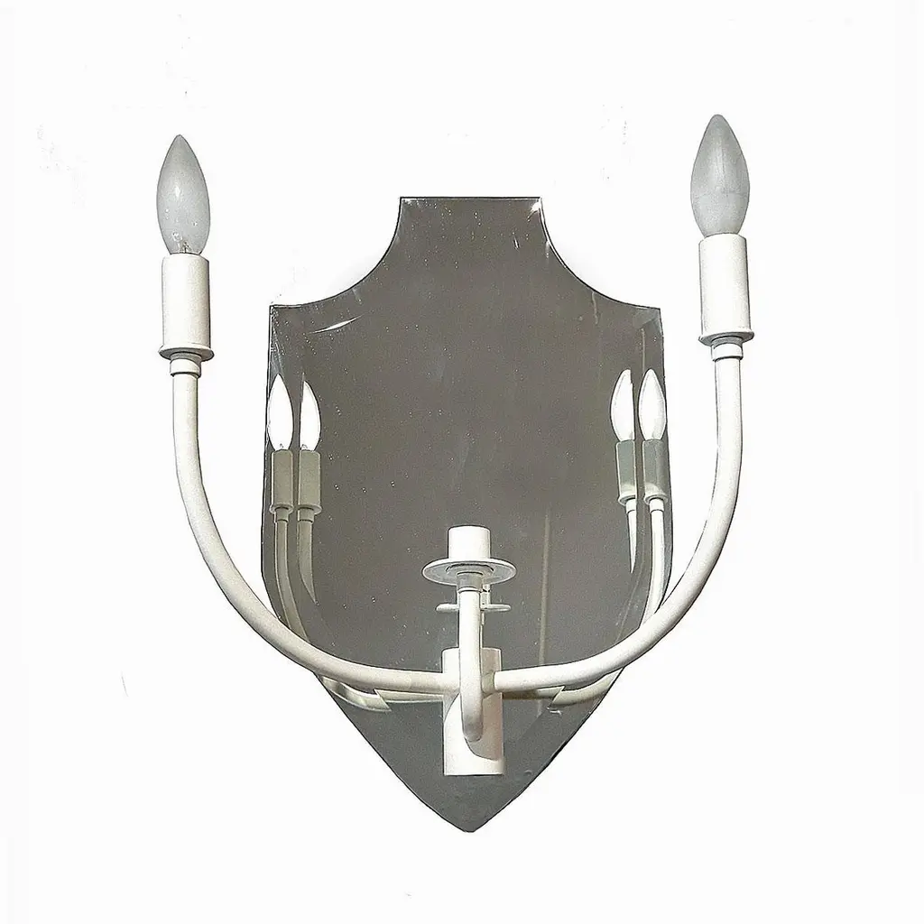 A semi-gloss white 2-arm wall sconce with a center candle holder. Mounted on a clear beveled mirror on a wood base. Supplied with 2 white paper translucent shades.