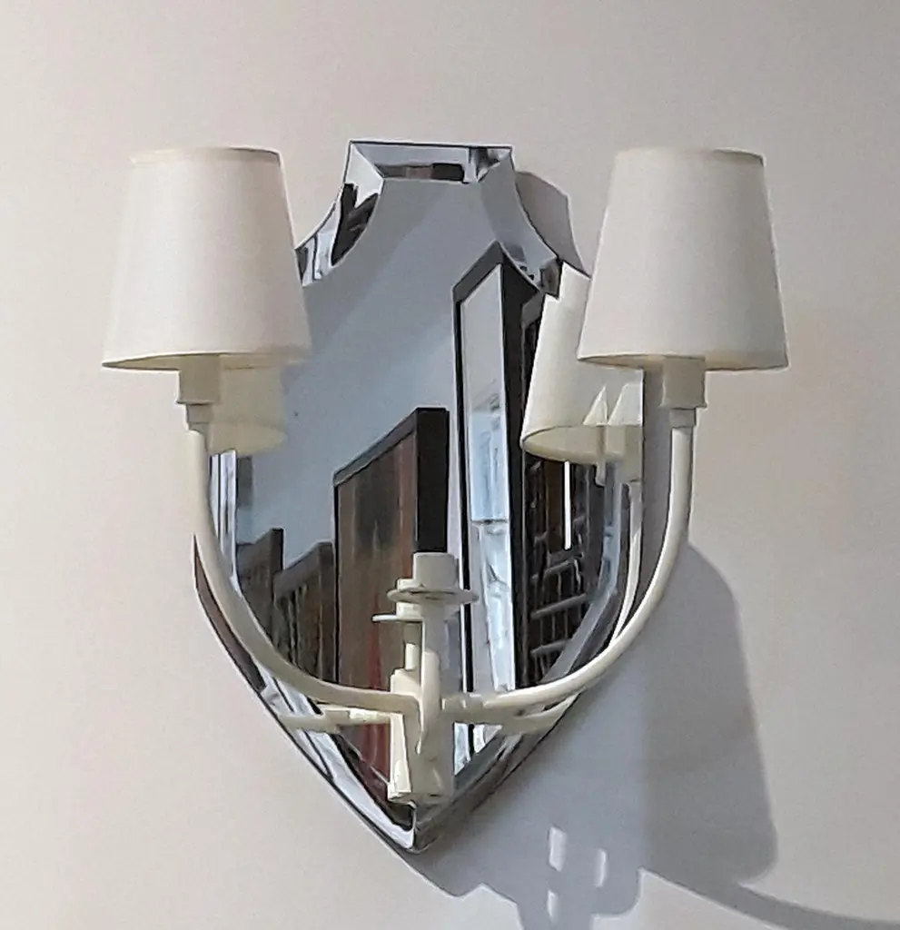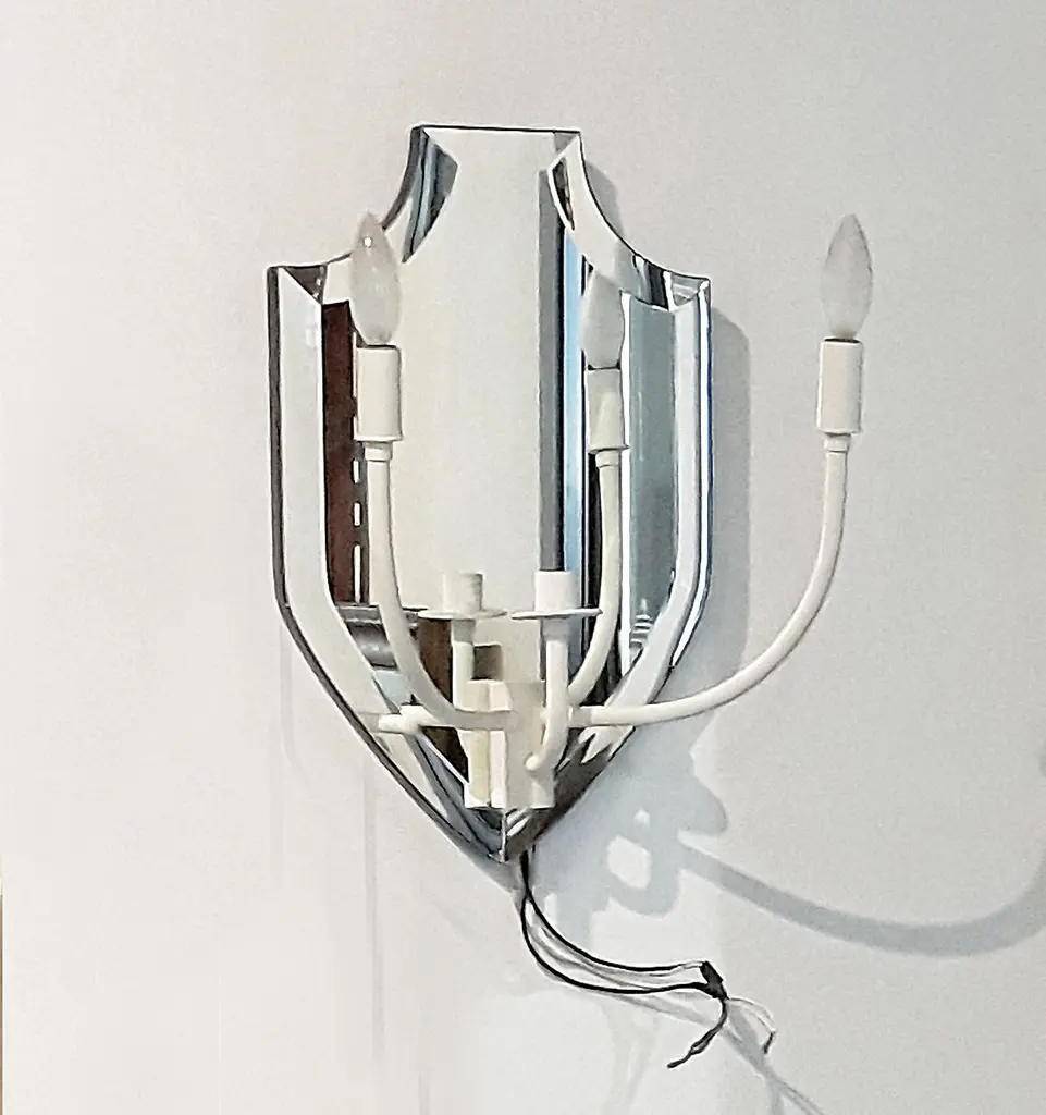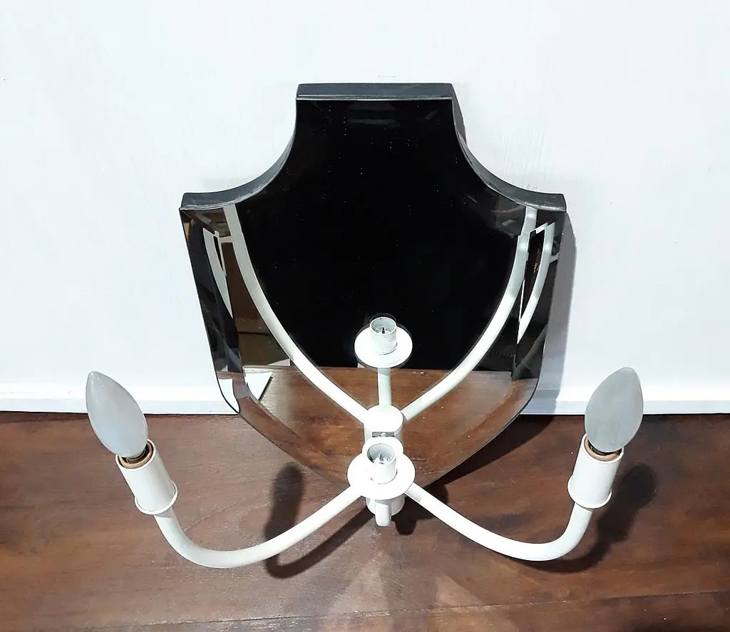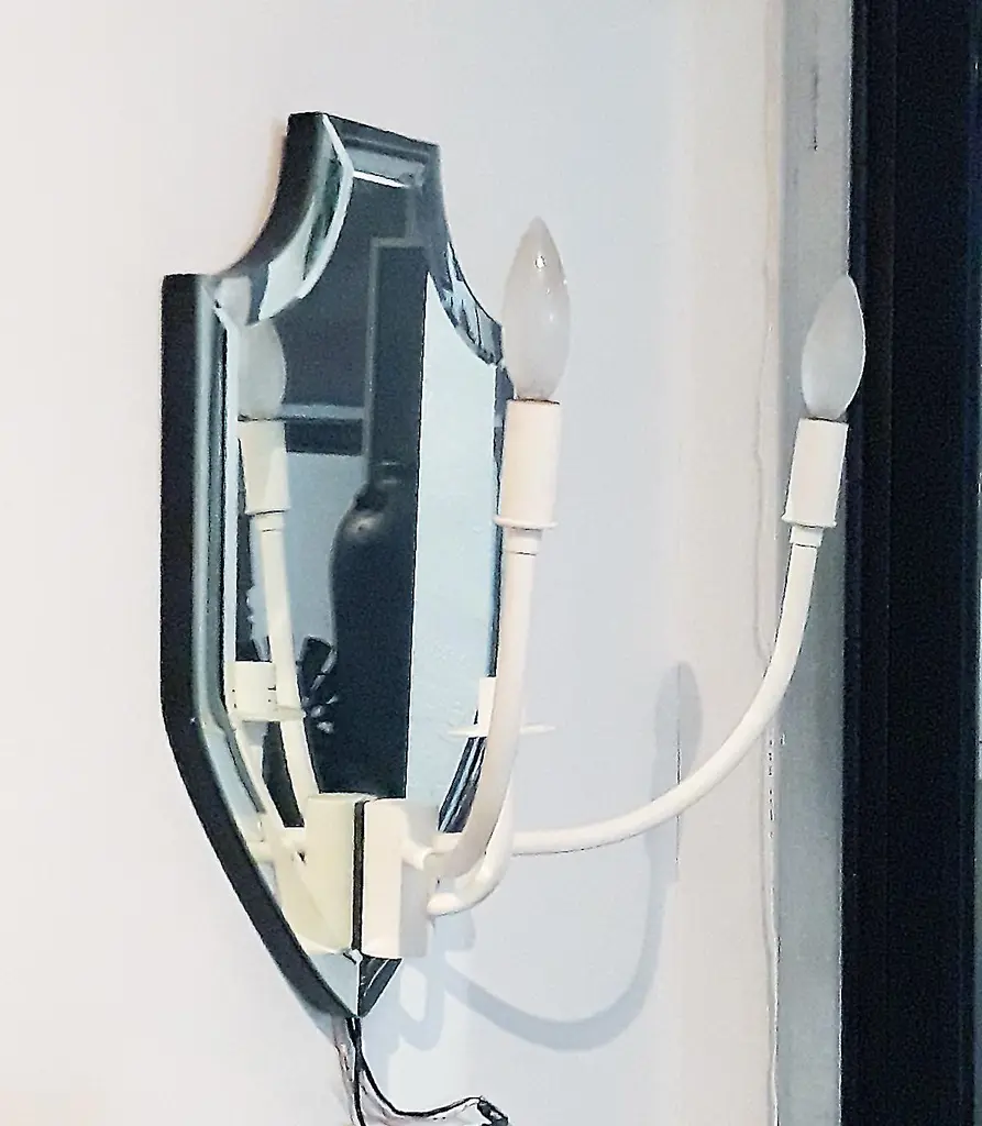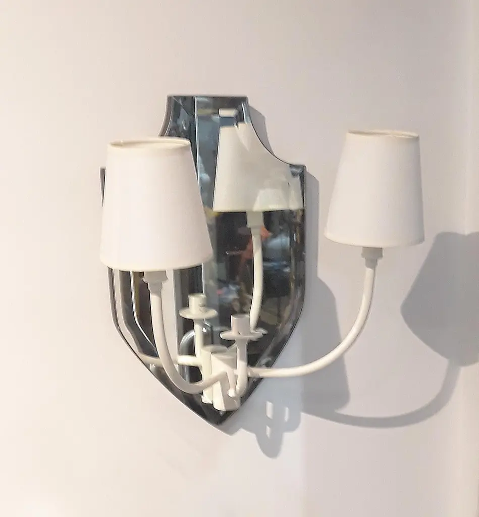 A semi-gloss white 2-arm wall sconce with a center candle holder. Mounted on a clear beveled mirror on a wood base. Supplied with 2 white paper translucent shades.