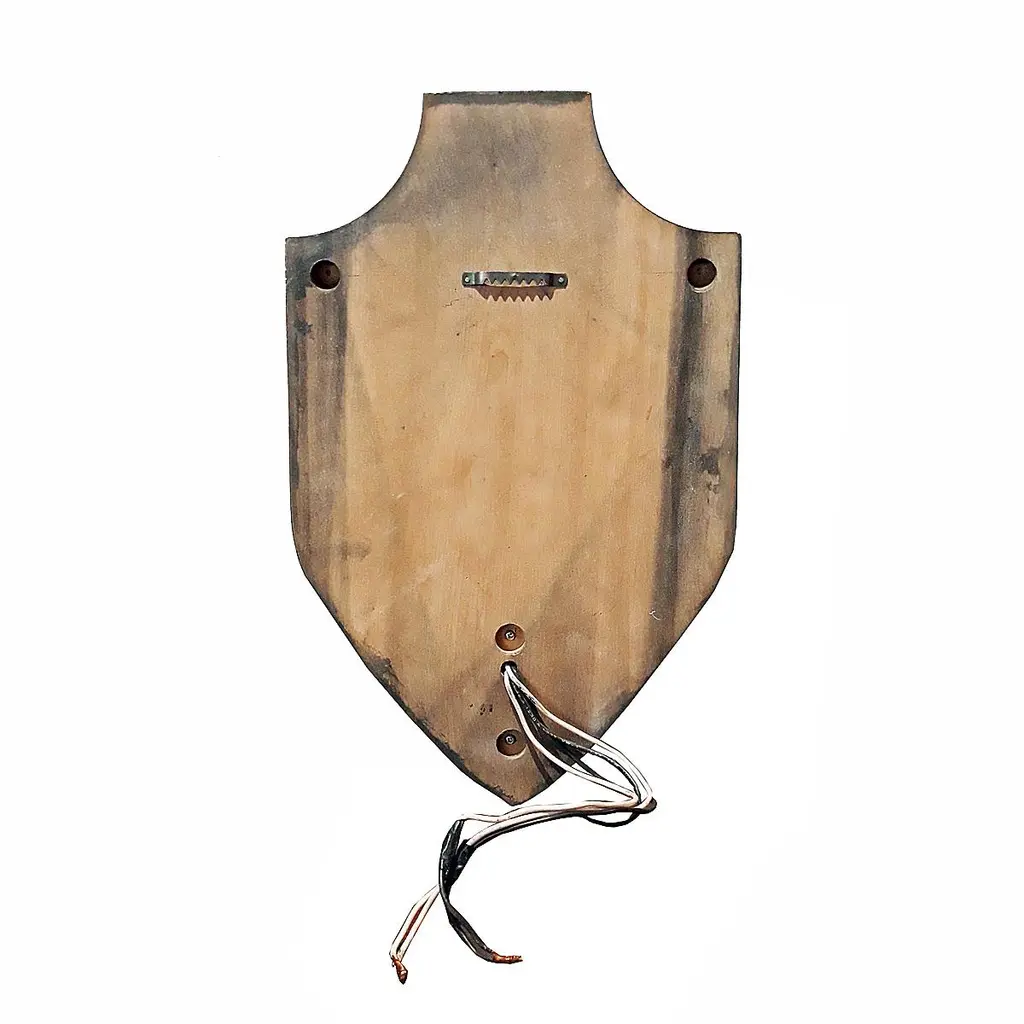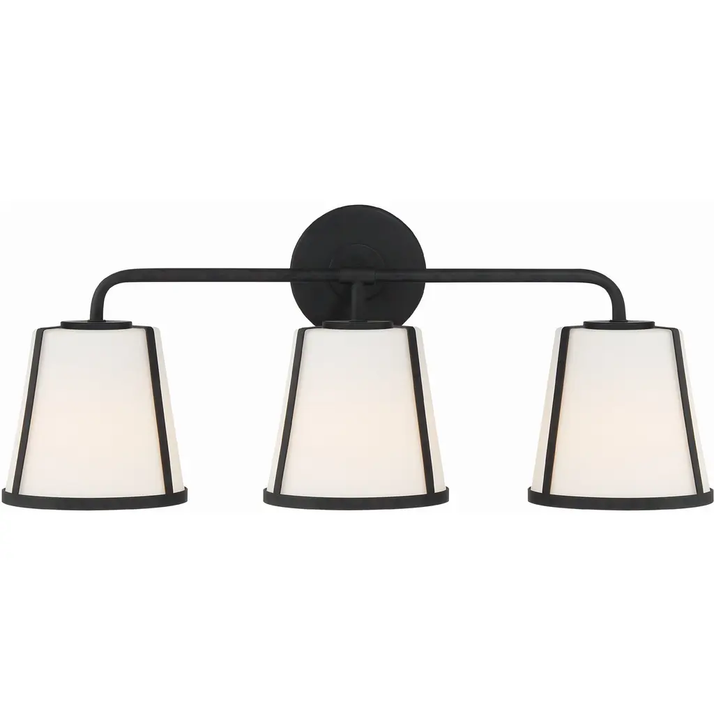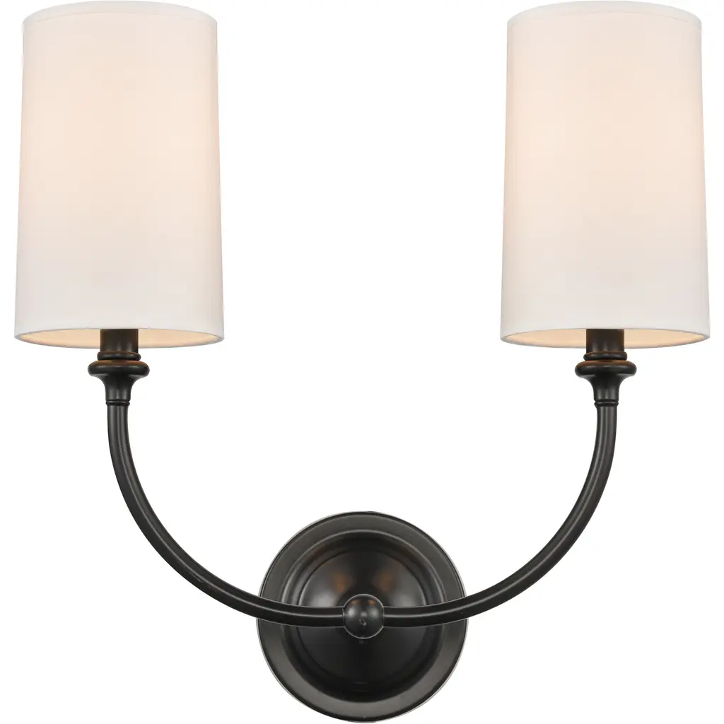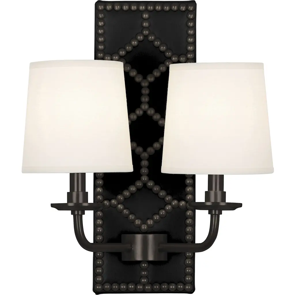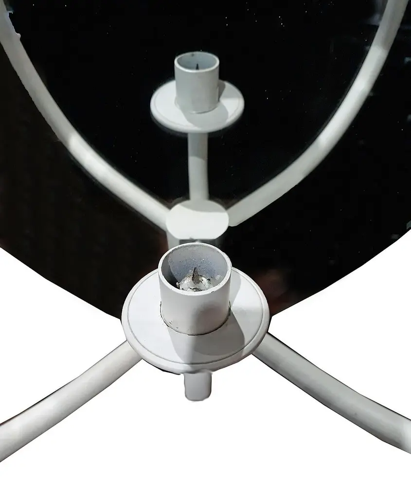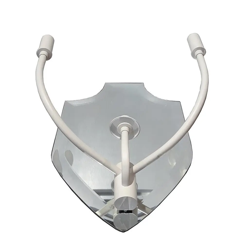 A semi-gloss white 2-arm wall sconce with a center candle holder. Mounted on a clear beveled mirror on a wood base. Supplied with 2 white paper translucent shades.