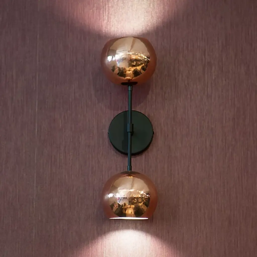 Bring a slice of Morocco to your walls with the Mishal Dual Globe Wall Sconce from Dounia Home. The fixture holds 2 globes with a smooth finish at the top and bottom of a round metal stem that juts from a circular wall mount. Handcrafted from locally-sourced metals by Moroccan artisans employed on a humane schedule for fair wages, each piece is a labor of love, sealed with a top coat to preserve the color. Utilizing powerful LEDs, the sconce sends warm, ambient glow up and down the surrounding walls of your home.