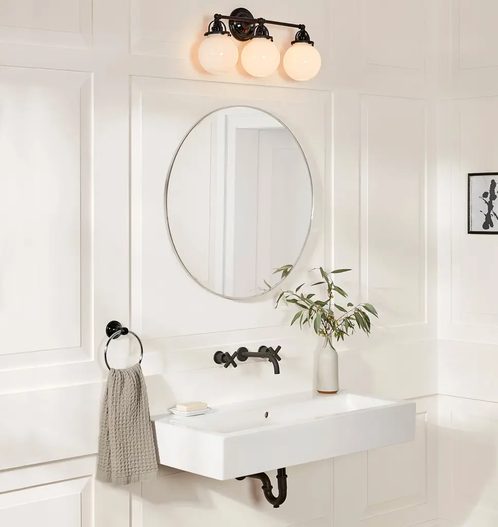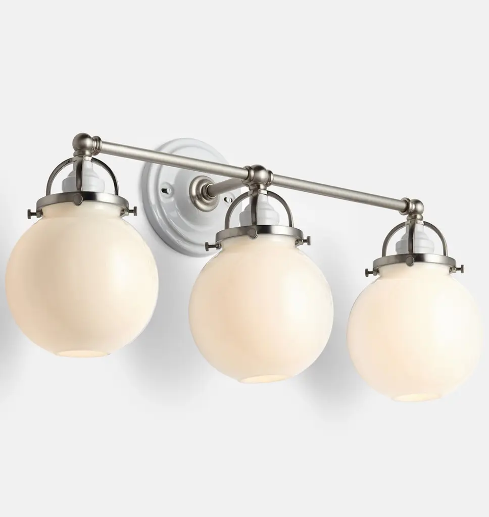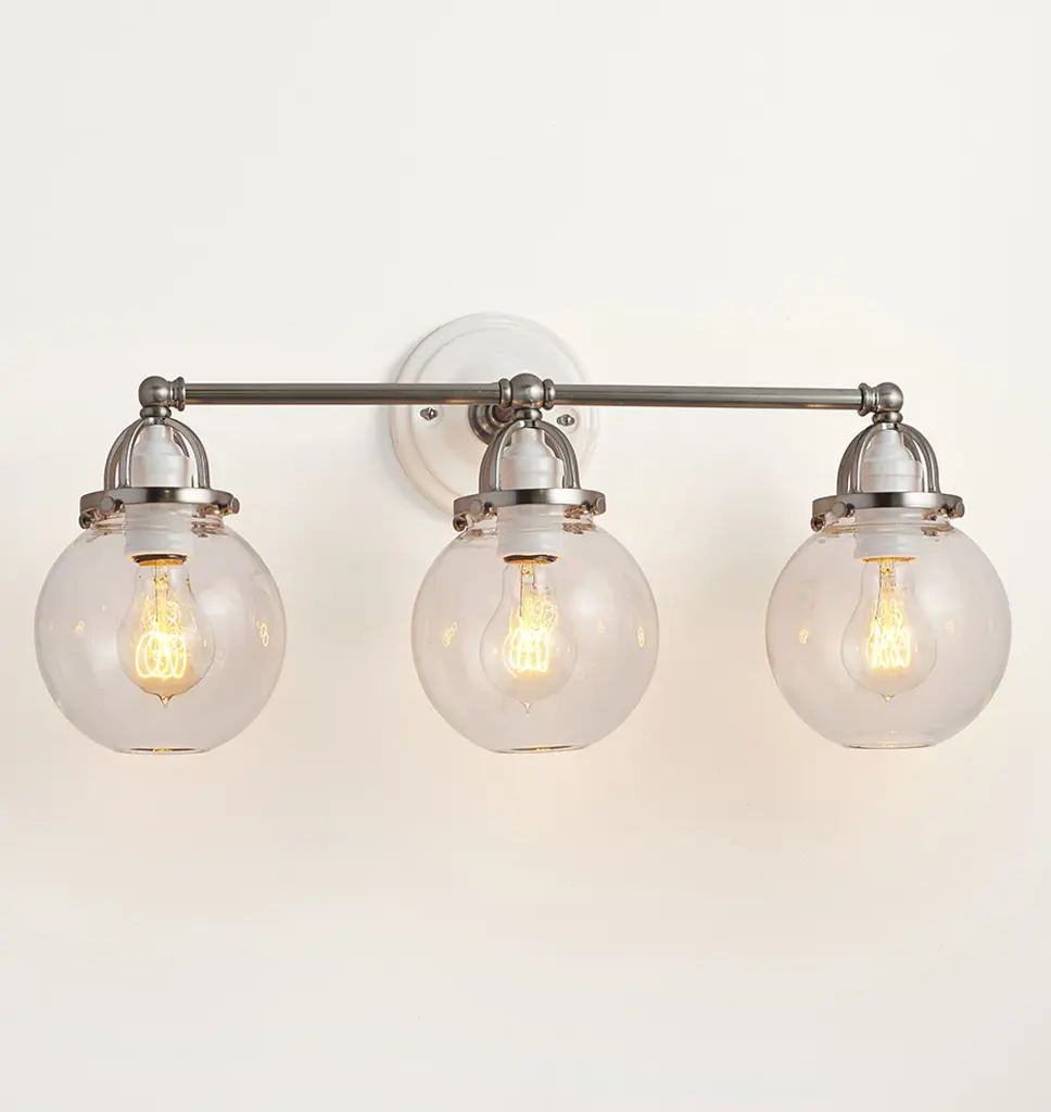 Our Mist Triple Sconce combines porcelain canopy and sockets with brass. The Mist's understated elegance pairs perfectly with our Dunbar bath basics. Porcelain and brass Assembled to order at our Portland, Oregon factory American Classics style Hardwired; professional installation recommended Suitable for indoor and covered outdoor use (UL rated damp) Assembled in U.S.A. of imported and domestic parts