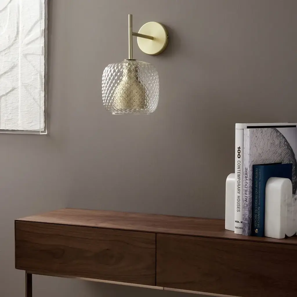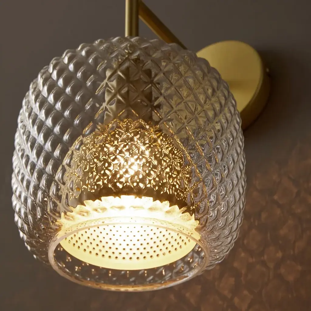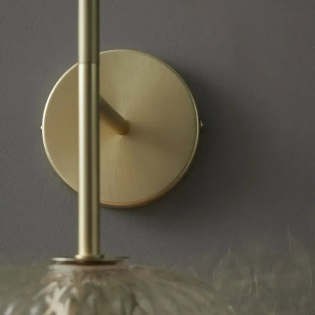Mistinguett wall light, an Emmanuel Gallina creation, exclusively for AM.PM. The combination of brushed brass with chiselled glass is inspired by the art deco movement where the elegance of the line emphasises the nobility of the materials. Between the perforated metal diffuser and glass globe, a play of light emerges with sweet and timeless notes.E14 lamp holder for 40W bulb (not included).Compatible with energy class A, B, C, D, E bulbs.