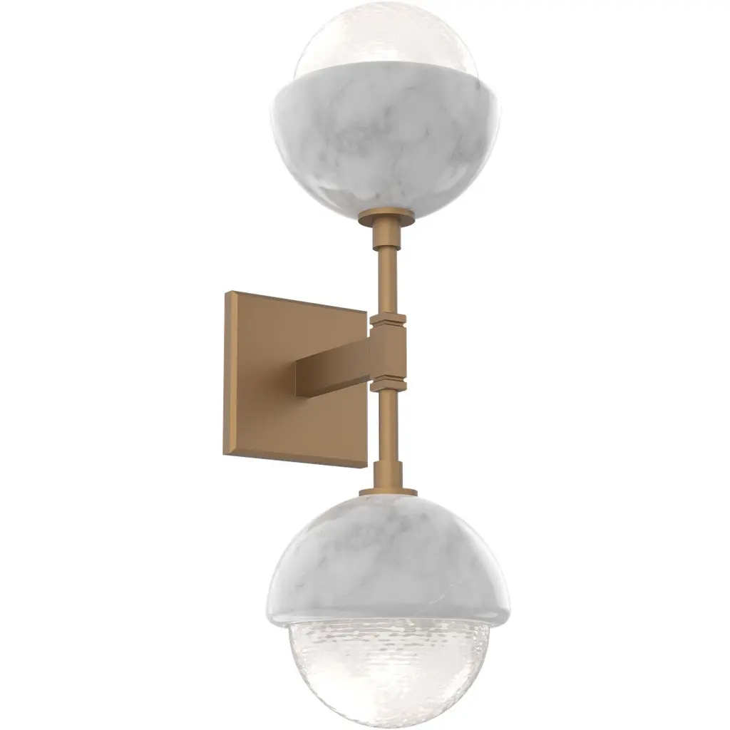 Two Light Wall Sconce from Paola collection in Aged Brass finish. Number of Bulbs 2. Max Wattage 15.00 . No bulbs included. A pair of glass globes are set at opposite ends of a trio of White Terrazzo spheres to give this modern wall sconce an artful yet unexpectedly playful feel. The patterned flecks in the Terrazzo add warmth and work beautifully with the Aged Brass backplate. Paola can be mounted either vertically or horizontally, making it suitable for both smaller and larger wall spaces. No UL Availability at this time.