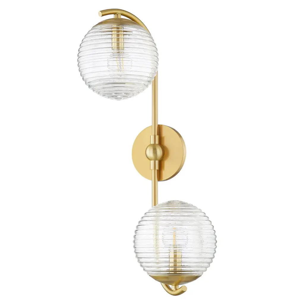 Two Light Wall Sconce from Sara collection in Aged Brass finish. Number of Bulbs 2. Max Wattage 8.00 . No bulbs included. Influenced by vintage Holophane style glass fixtures, Sara gives the classic look a modern update. The clear ribbed glass globes were designed for maximum light and refraction. Available as a flush mount, wall sconce or pendant light, style Sara in multiples down hallways and over kitchen islands or alone above coffee or dining tables to fill a space with bright light and sleek sophistication. The lamp''s ribbed ceramic base is similarly influenced and adds texture and a pop of color to any tabletop. Part of our Home Ec. x Mitzi Tastemakers collection. No UL Availability at this time.