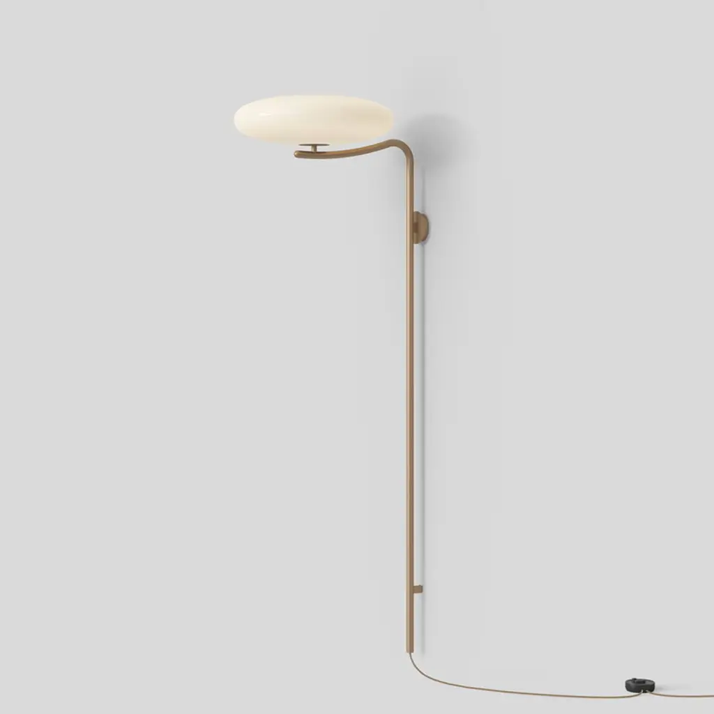 The Model 2065 wall light by the lighting brand Astep is a minimalist luminaire designed by Gino Sarfatti in 1951. At that time, the most common material in the lighting industry was glass, but Sarfatti got a chance to experiment with a new kind of material, methacrylate, which is significantly stronger and lighter than glass. The Model 2065 wall lamp is composed of two joined saucers that merge into a round, flat diffuser. Five LED lamps make the wall light bright enough for larger spaces as well, while the gracefully curved, wall-mounted aluminum stem adds a refined finishing touch. The luminaire has been manufactured in Italy. The champagne-colored lamp is a special 2025 edition, available for a limited time only. The lampshade is made from 100% recycled and recyclable Green Cast acrylic.
