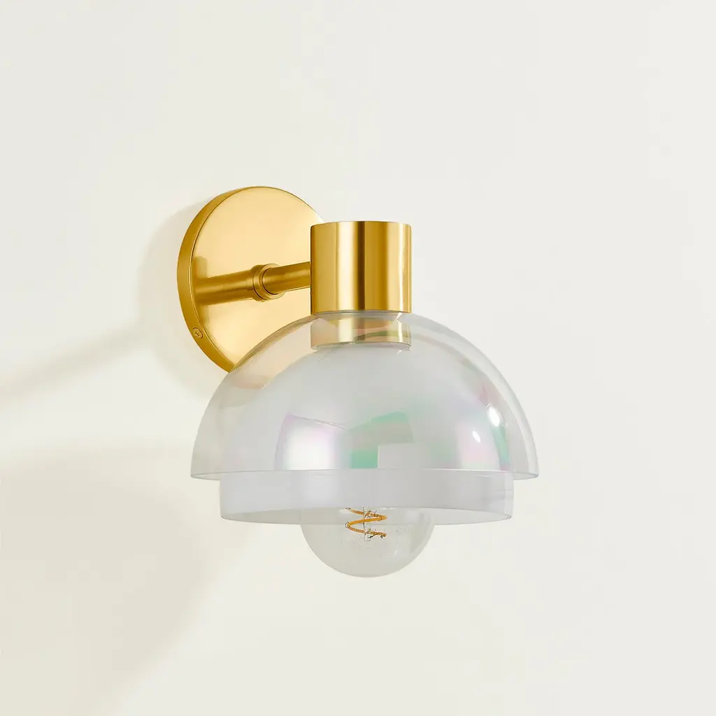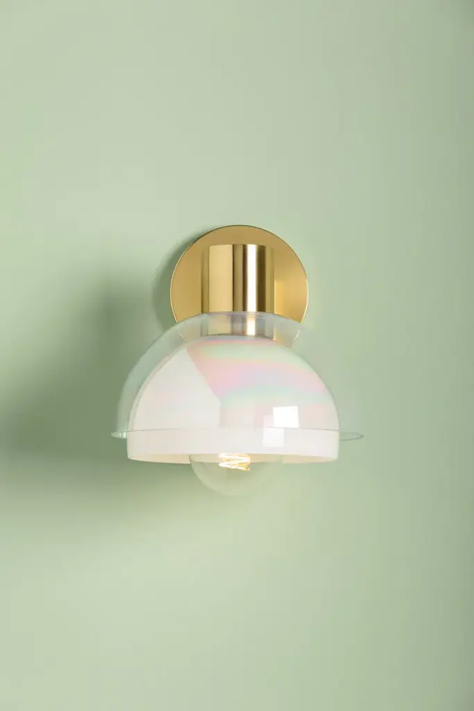 Playing with the layering of glass, Modena features two spherical shades that encircle the light source, creating a bubble-like halo. An opal interior shade is paired with an iridescent exterior shade, creating an ethereal interplay of light and shapes. The Aged Brass metalwork adds to the luxurious feel of the fixture as it reflects the light.