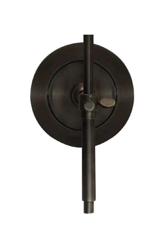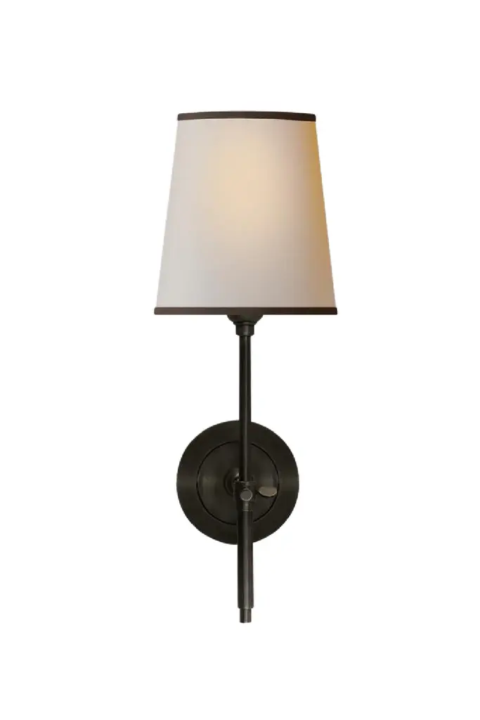 A small wall lamp with a natural shade that has a sleek silver trim. Crafted by iconic designer Thomas O'Brien, Bryant is perfect for a bathroom or hallway, adding subtle light and a smart finish to a wall.Download Specification Sheet: Gold Black