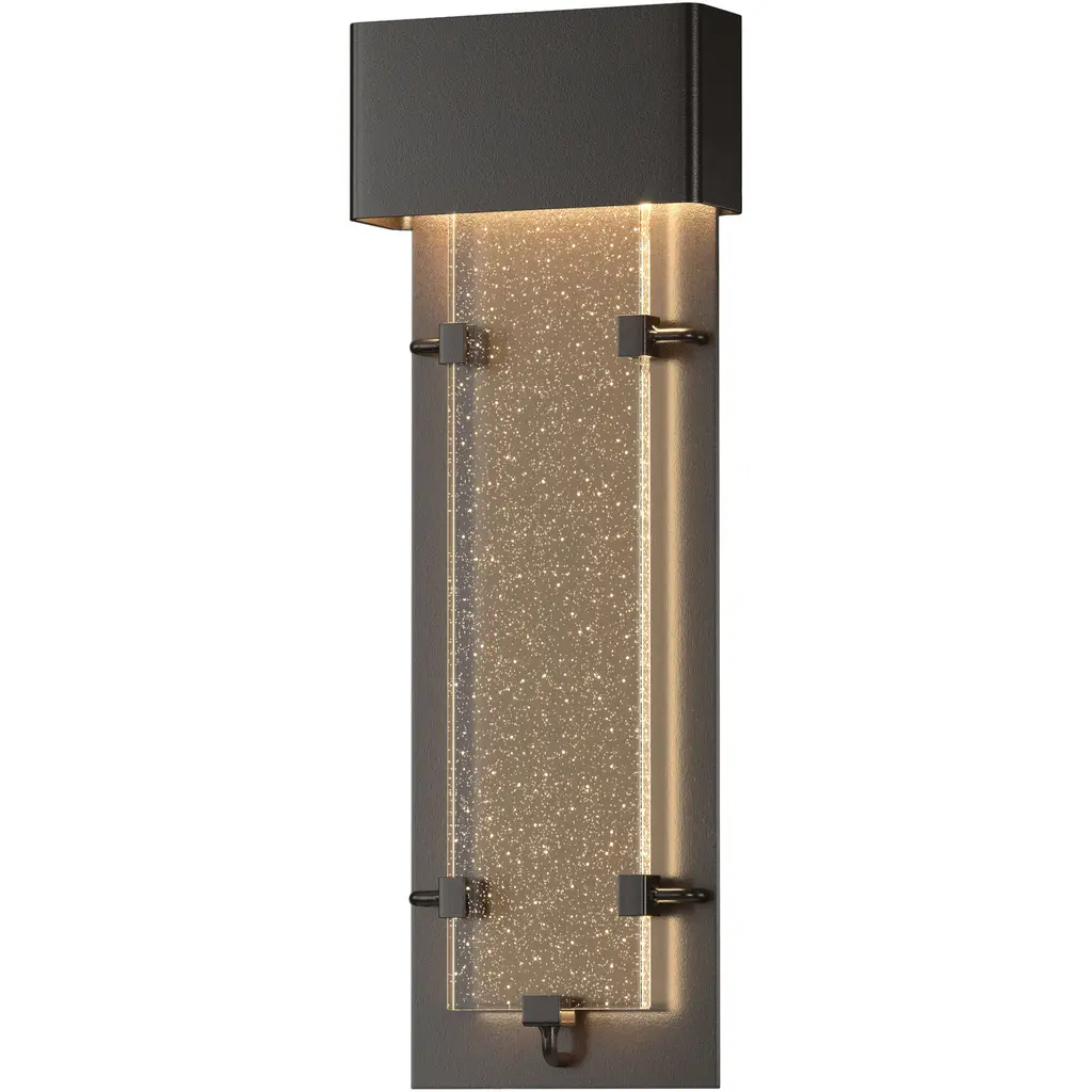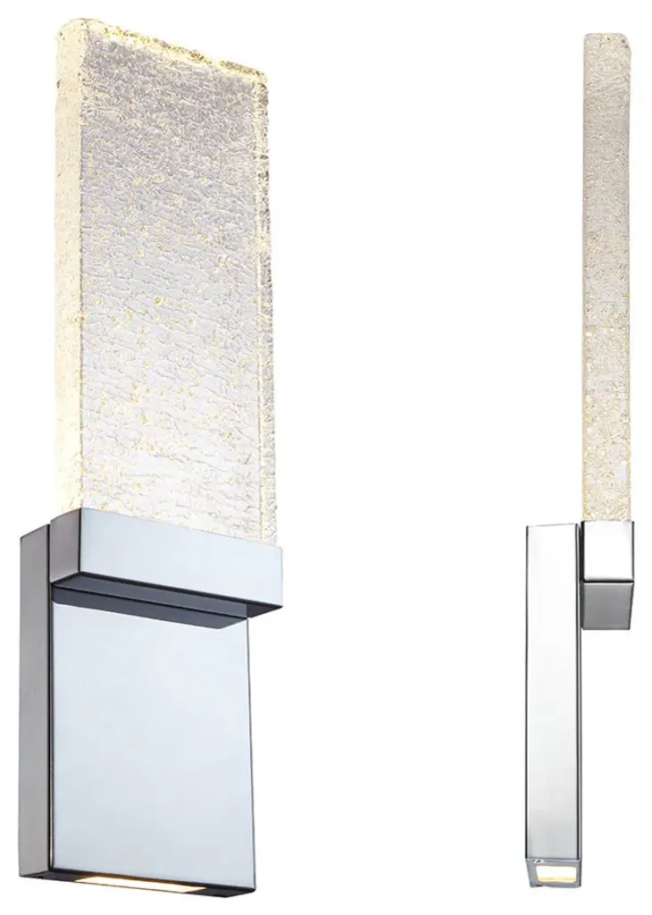 The beautiful brilliance of frozen ice and polar caps crystalize into stunning wall sconce luminaires as LEDs evoke a sparkle and shimmer with mesmerizing Piastra glass, hand crafted utilizing techniques discovered in the 13th century.Features:- Steel construction with beautifully crafted piastra glass.- ADA compliant, low profile design.- Smooth and continuous dimming with an electronic low voltage (ELV) dimmer.- ACLED technology, no transformer or driver required.- Replaceable High Powered LED Module CRI: 90, 50,000 hour rated life, Color Temp: 3000K.- Standards: ETL & cETL Damp location listed.Bulb Type: LEDBulb Base: LED ModuleNumber of Bulbs: 1Watts per Bulb: 10Total Wattage: 10Bulbs Included: YesDimmable: YesBackplate/Canopy DimensionsHeight: 6"Width: 8.25"Depth: 1.38"Shade DimensionsHeight: 13.25"Length: 6"Width: 1.38"Light assembly required on finials, back plates, and shades.