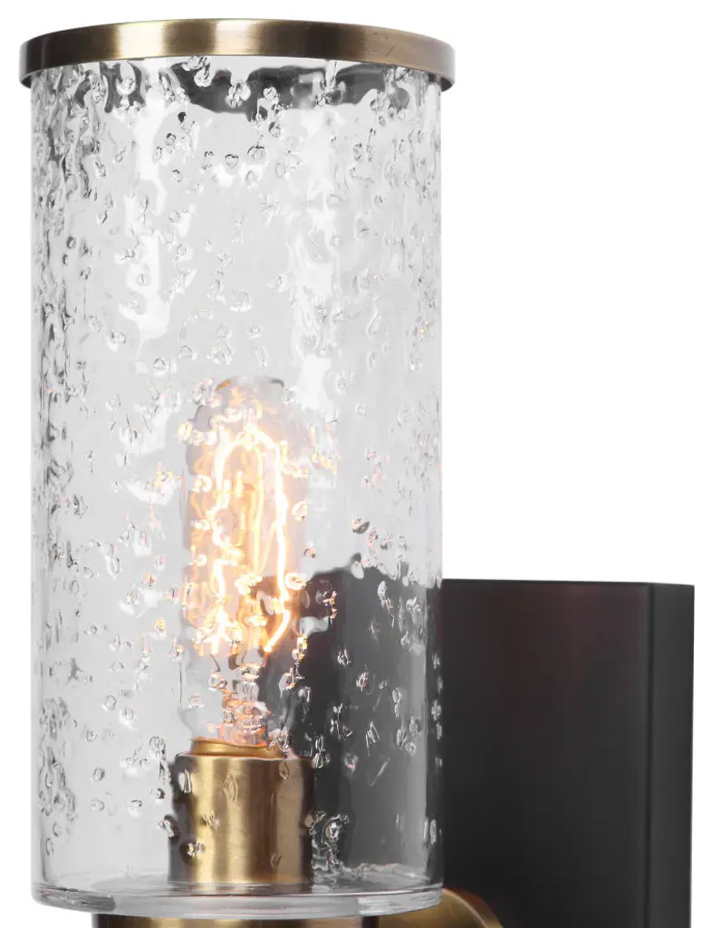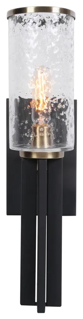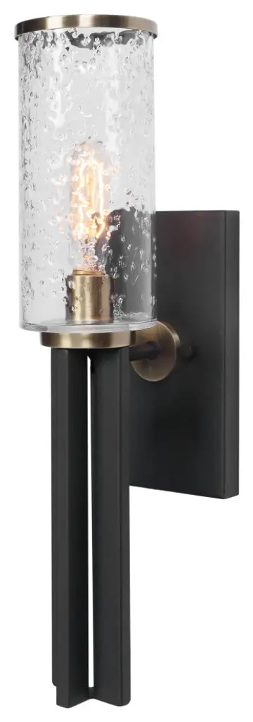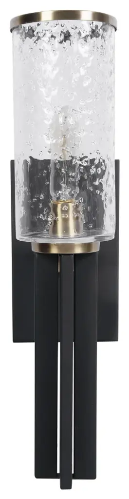 Refined Industrial With Clean Lines On Our 1 Lt. Wall Sconce Feature A Sanded Black Finish On The I-beam Style Frame With Refined Antique Brass Accents And Clear Meteor Shower Glass Shades. Includes 1-40 Watt Clear T10 Antique Style Bulb. Coordinating chandelier, island light, and mini pendant available separately.• 20"H; 7"L x 5.1" deep. Weighs 3.5 lbs.• Hand Finished Premium Steel and Glass• Uses one max 60W Type A bulb (not included). 1'' Wire. Hard Wired.• Heirloom Quality - Expertly hand crafted and hand finished. Due to the hand crafted nature of this piece, each piece may have subtle differences.