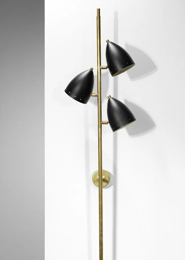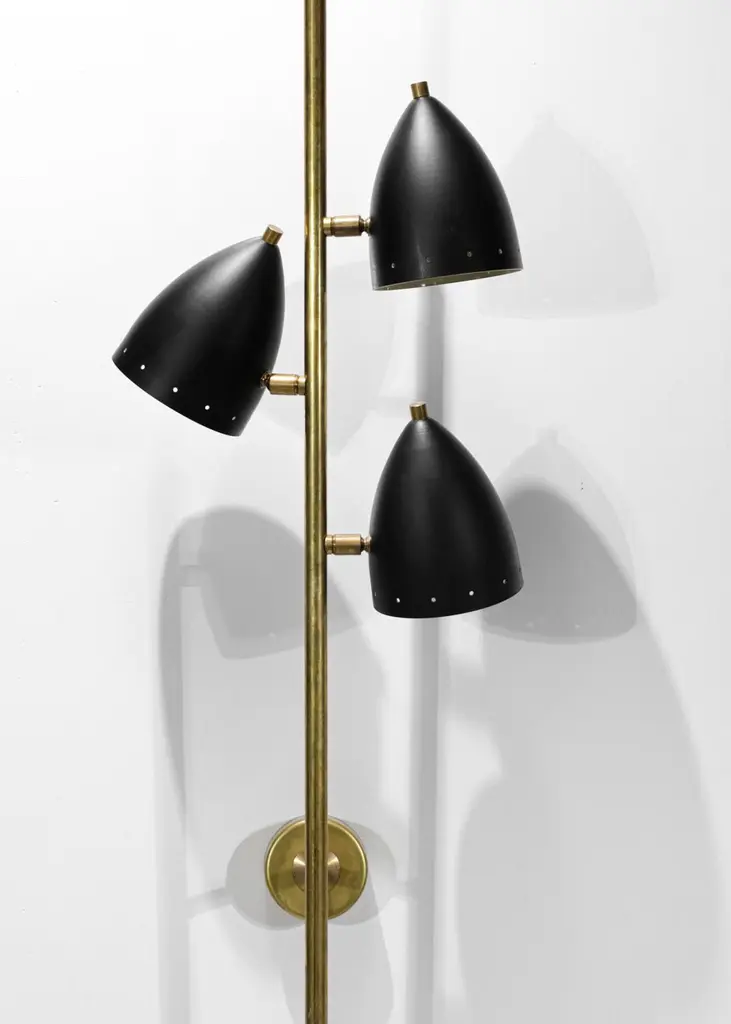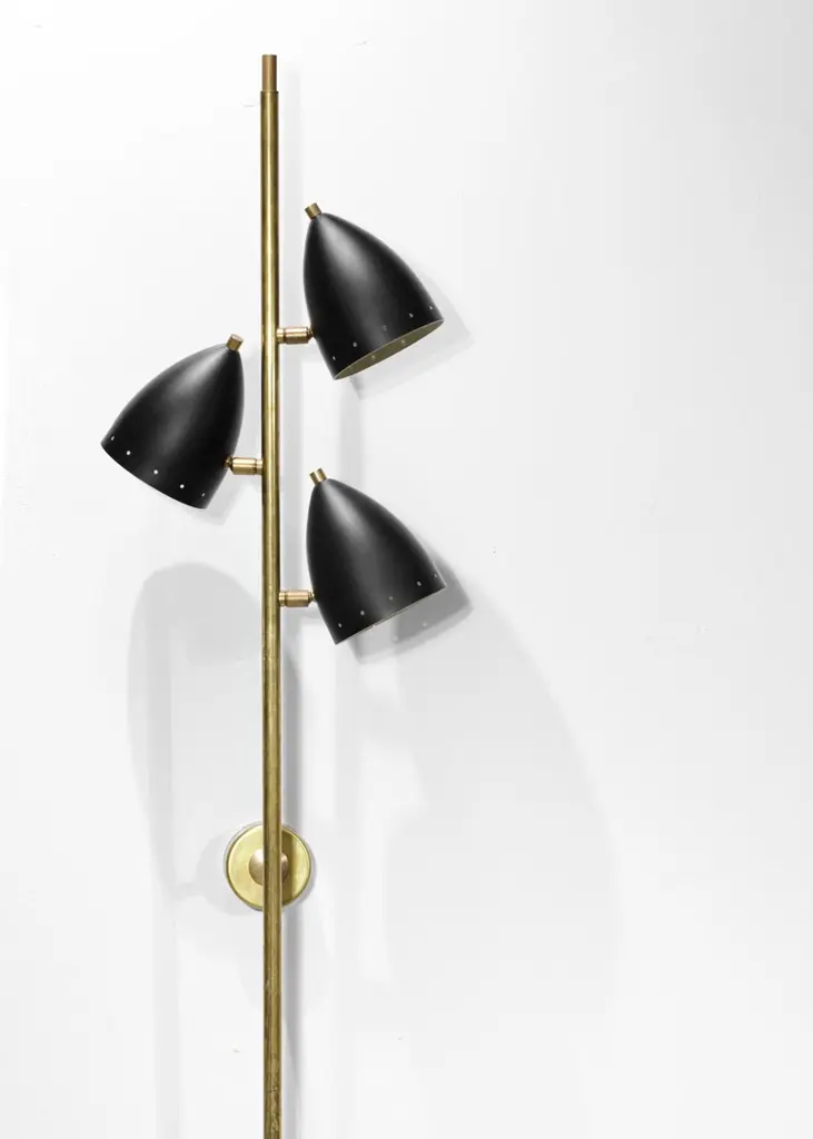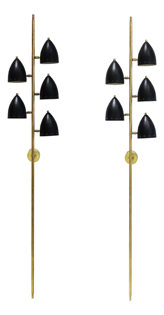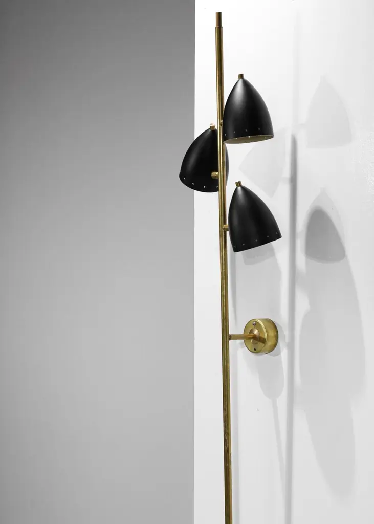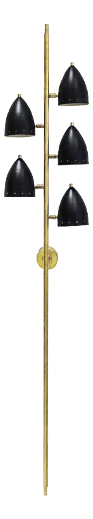 "Giulia" contemporary Italian wall lamp in the style of the 60s. Structure in solid brass and 4 black lacquered steel lampshades. Bulbs type E14 (total length cm / Depth 14,5 cm / Diameter of the base 12,5 cm). Modern Italian handcrafted re-edition.