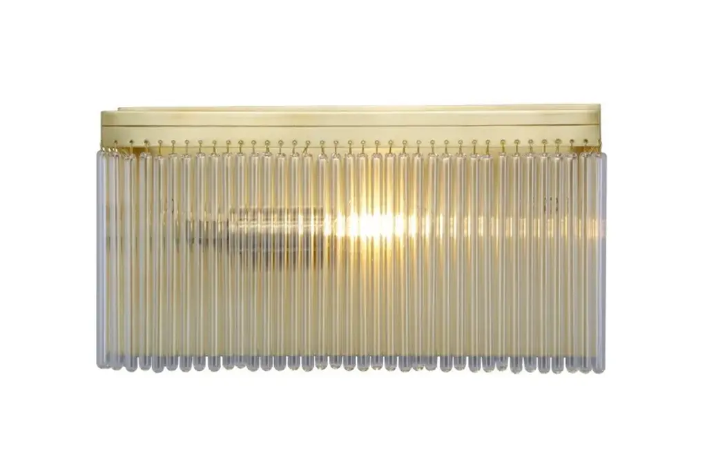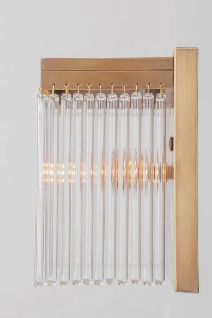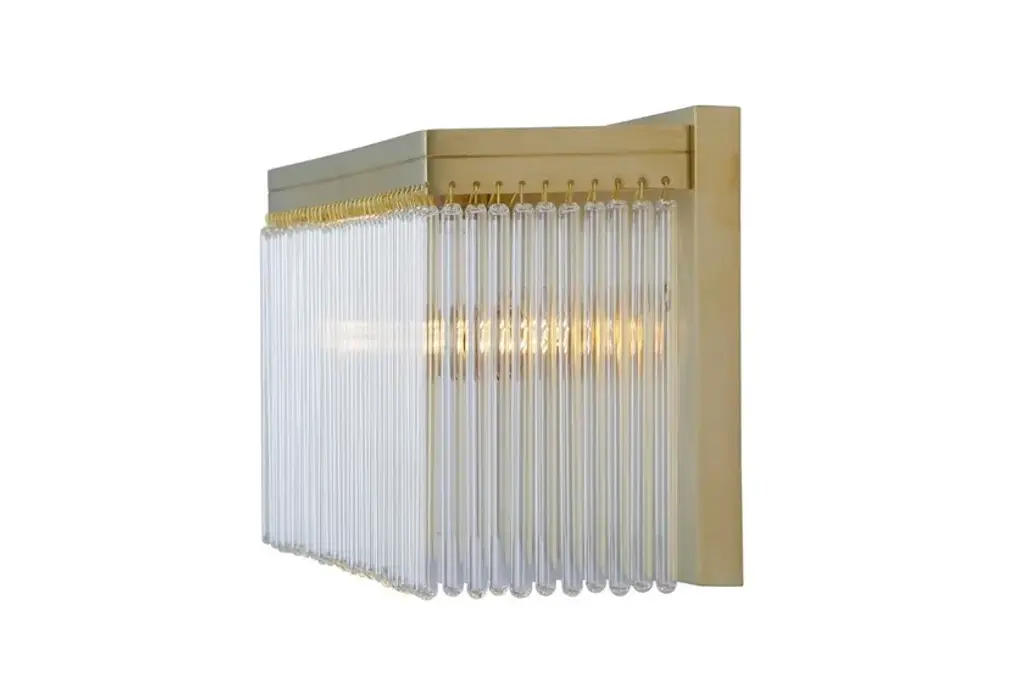 Monaco I is a wall lamp made of brass and glass tubes.Finishes: Antique, Shiny brass, Matt brass, Shiny nickel, Matt nickelCapacity : 1x60 W E14Monaco collection’s pieces are a mix of elegant square shape frames and crystal clear hand cut glasses. The majority of the lamps are perfect for average height spaces. Some pieces are fitted with more than 1000 glass tubes. Available in antique, shiny brass and nickel finish.