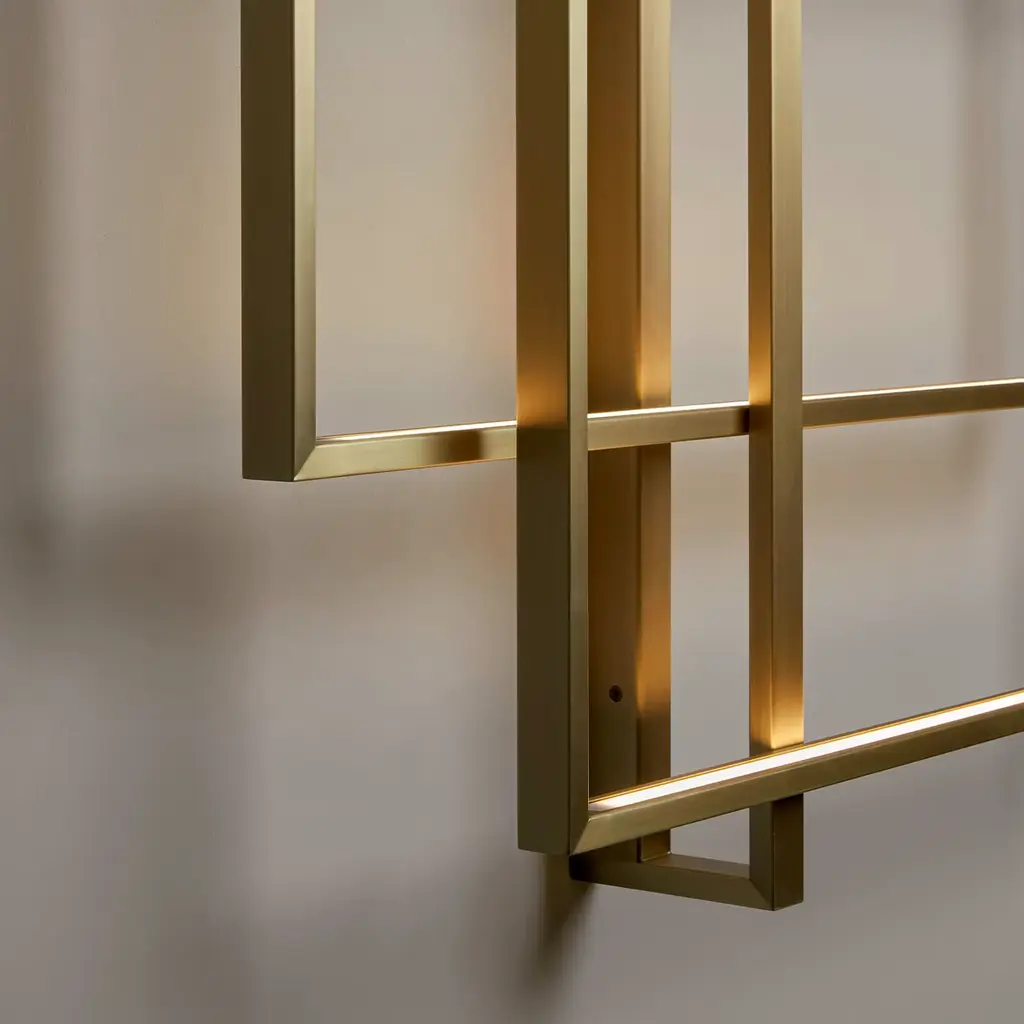 The Mondrian Double Wall Lamp light transforms a solid rectangular form into elegant lines. Three primary shapes intersect, creating precise geometric patterns that emit indirect light from built-in LEDs. It comes in a light-burnished brass finish. Additionally, the Mondrian LED is available in a ceiling-mounted version and different finishes.