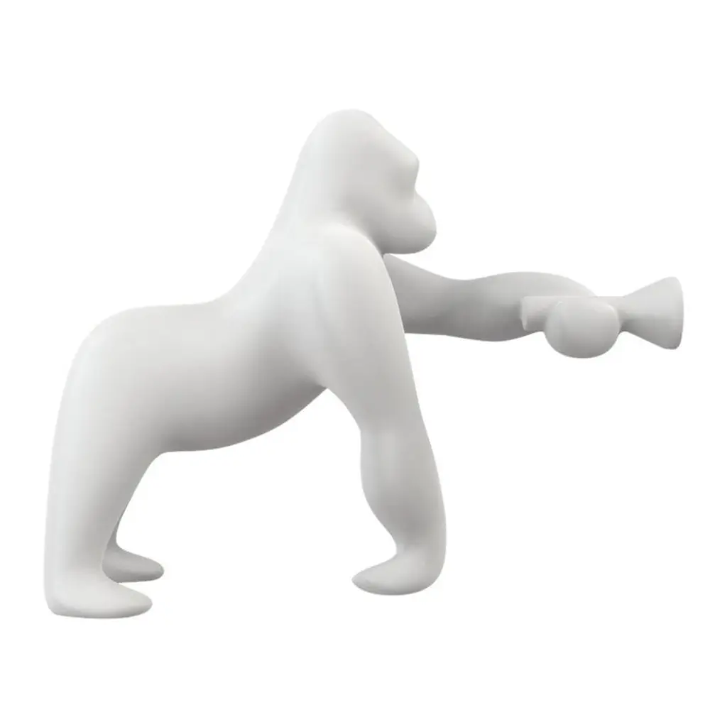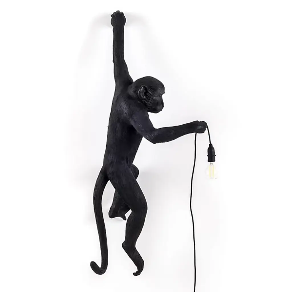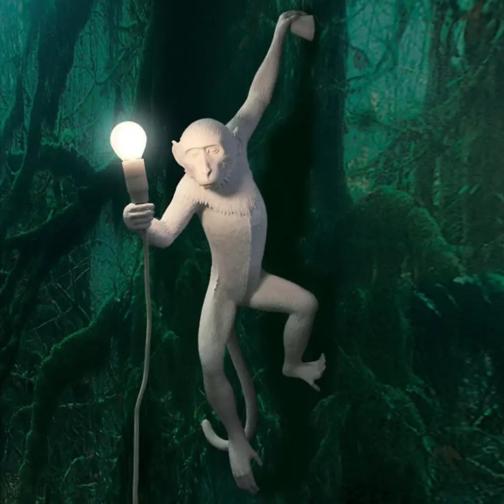 The Seletti Monkey LED Wall Lamp holds a bright torch for comfort and survival, grasping ledges and walls as a friendly curiosity. Composed entirely of resin, the primate has the statuesque quality of a wax sculpture, as if the creature was once very much alive and is now an exhibit in a natural history museum. The light source is hardly primitive—the socket includes a warm LED bulb, illuminating an allegory of innovation to the primal nature of the animal.