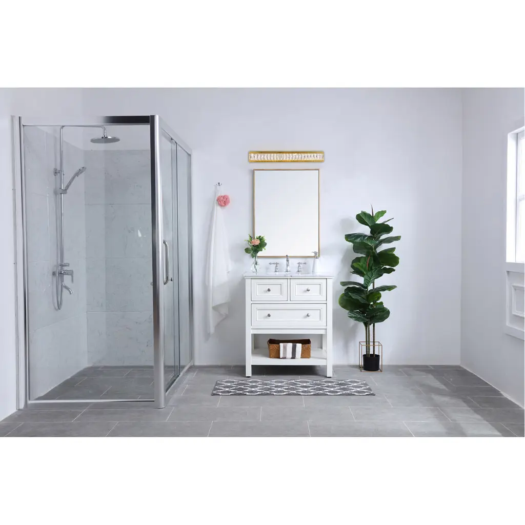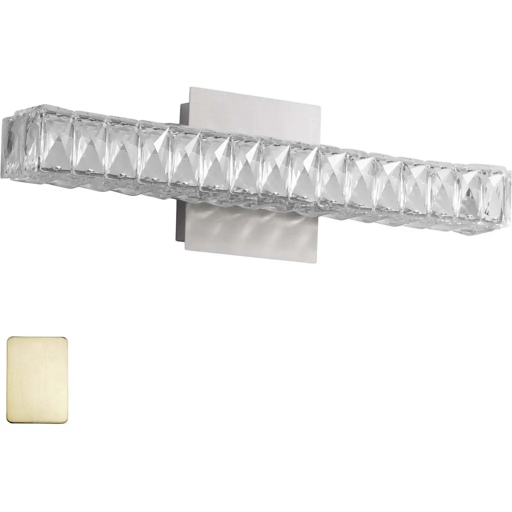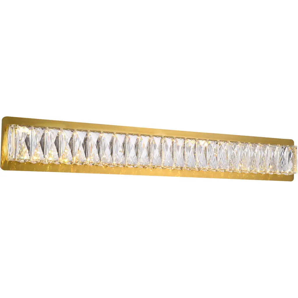 Monroe collection wall sconces dress up a bathroom, office, or bedroom without overwhelming the surrounding décor. A rectangular stainless-steel frame and backplate would seem austere if it weren’t covered by a row of shining rectangular royal-cut clear crystals. The gold-finished backplate is polished to a mirror shine and reflects the glittering crystals for additional sparkle. Available in three size options with a sleek gold finish that completes this modern look.