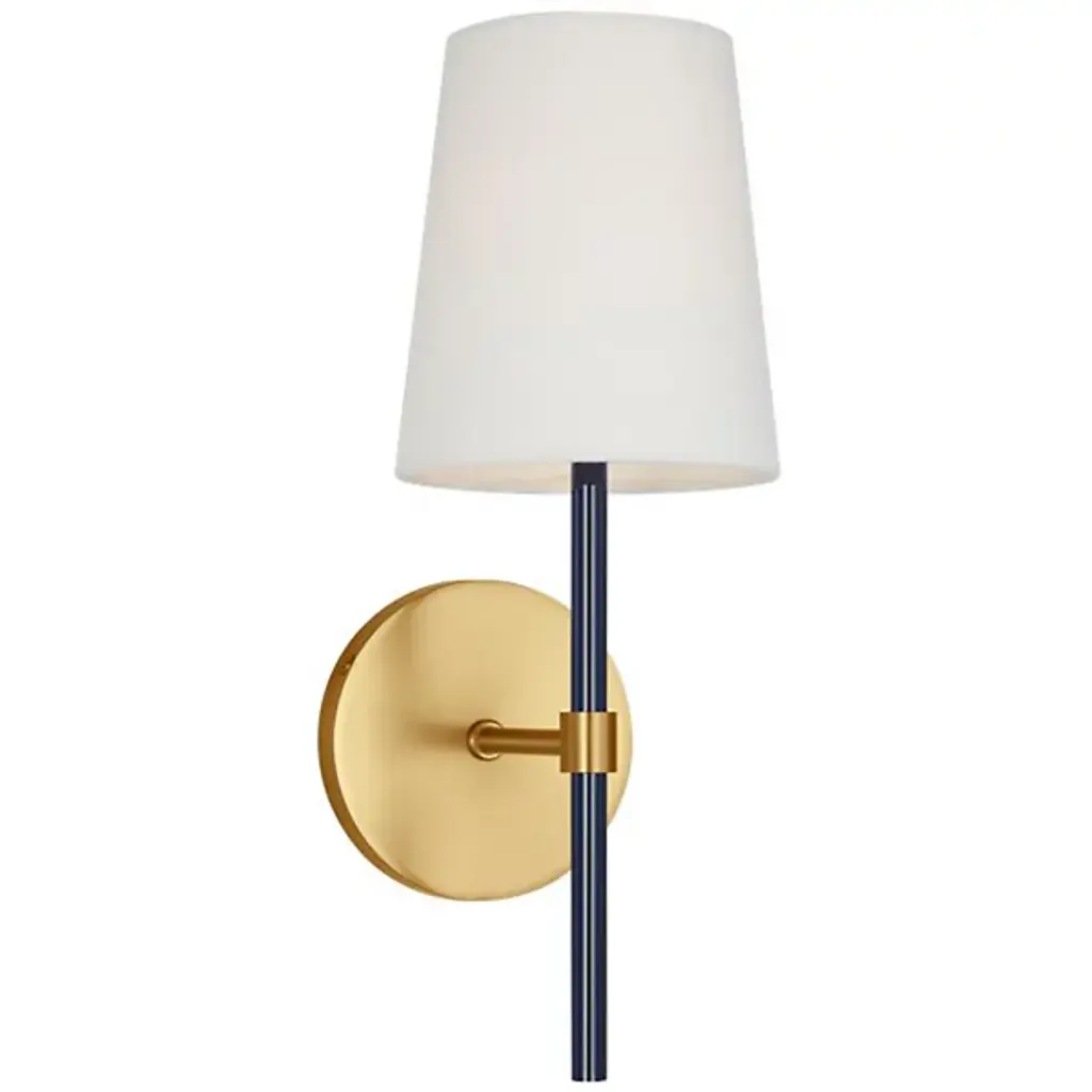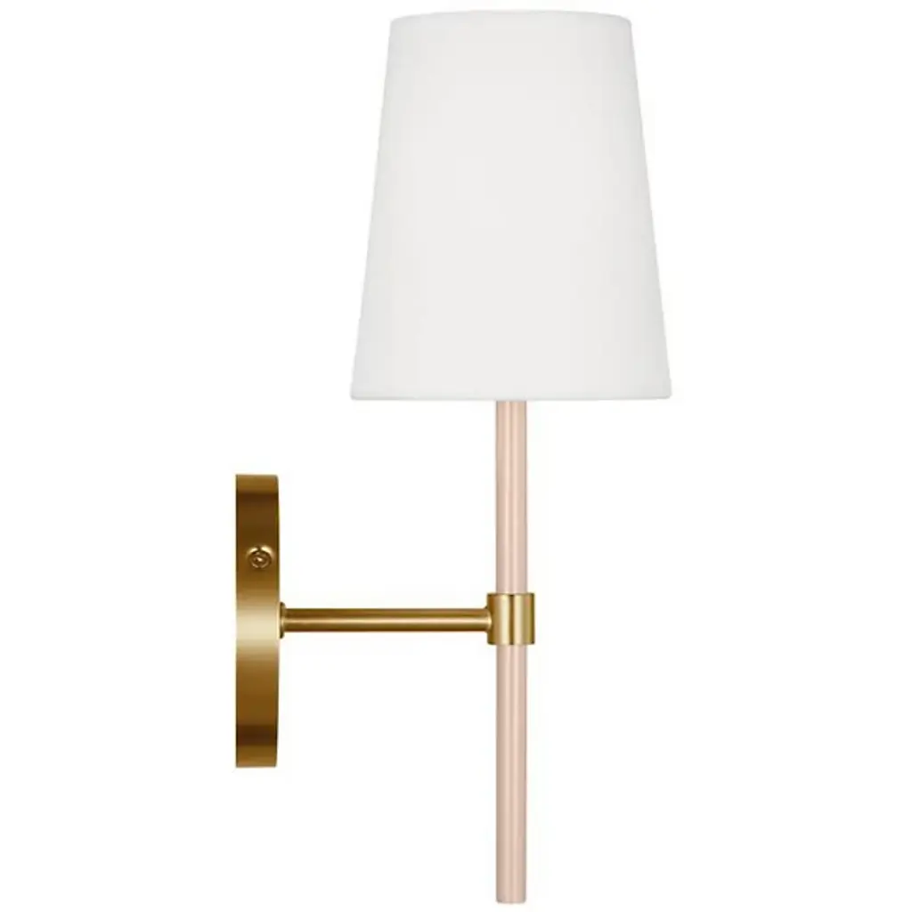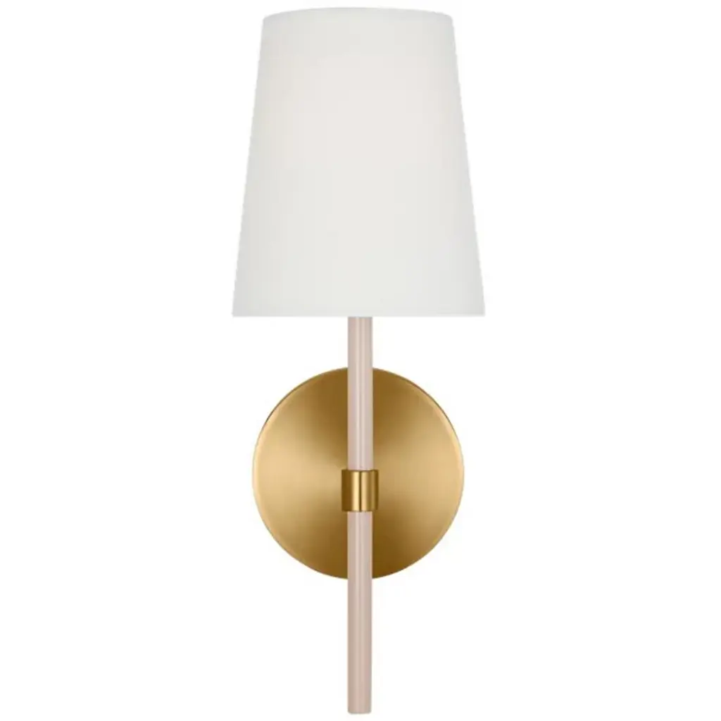 Brighten wall and hallway alike with the well-tailored design of the Monroe Wall Sconce from Visual Comfort Studio, formerly known as kate spade new york, A delightful modern fixture secured by a sleek circular wall plate, it seats a vertical cylinder with a glossy surface that rises to place a single bright socket beneath a flared linen shade. This translucent texture blocks the bright glare from the sides, splashing out a bright spot of light below that reflects off the metal structure below.