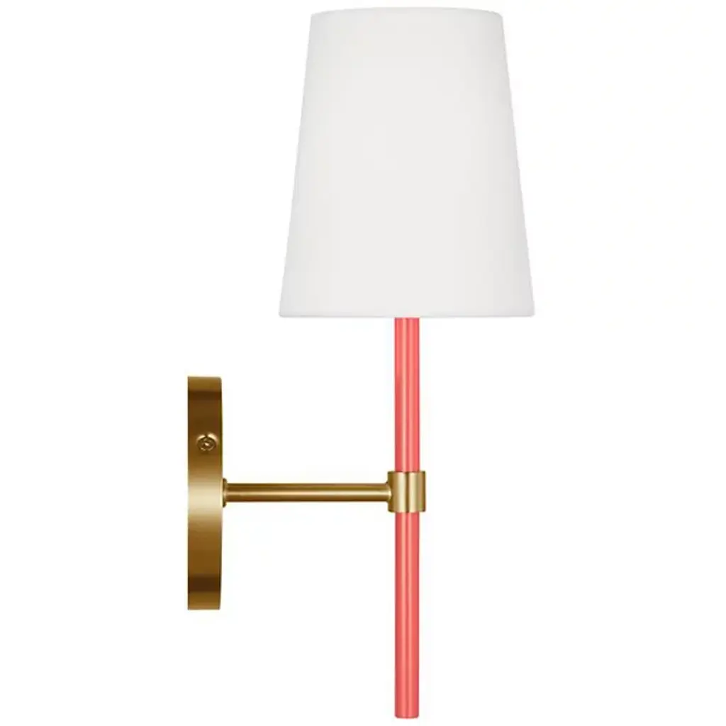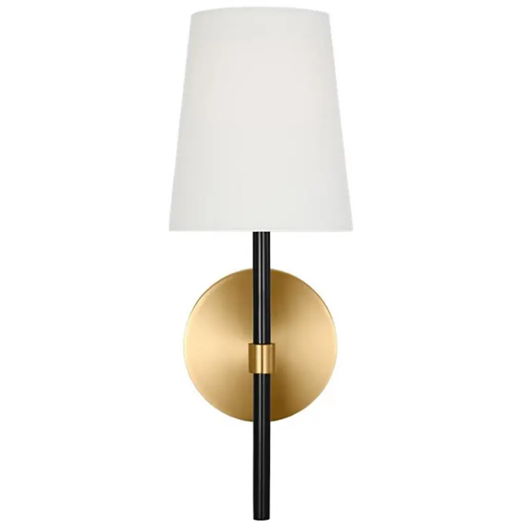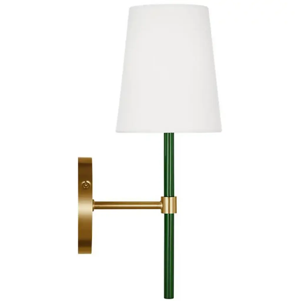 Brighten wall and hallway alike with the well-tailored design of the Monroe Wall Sconce from Visual Comfort Studio, formerly known as kate spade new york, A delightful modern fixture secured by a sleek circular wall plate, it seats a vertical cylinder with a glossy surface that rises to place a single bright socket beneath a flared linen shade. This translucent texture blocks the bright glare from the sides, splashing out a bright spot of light below that reflects off the metal structure below.