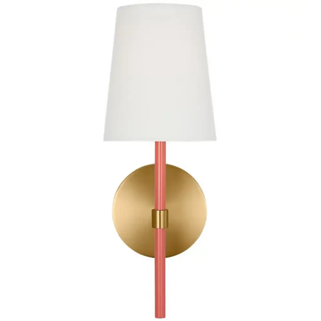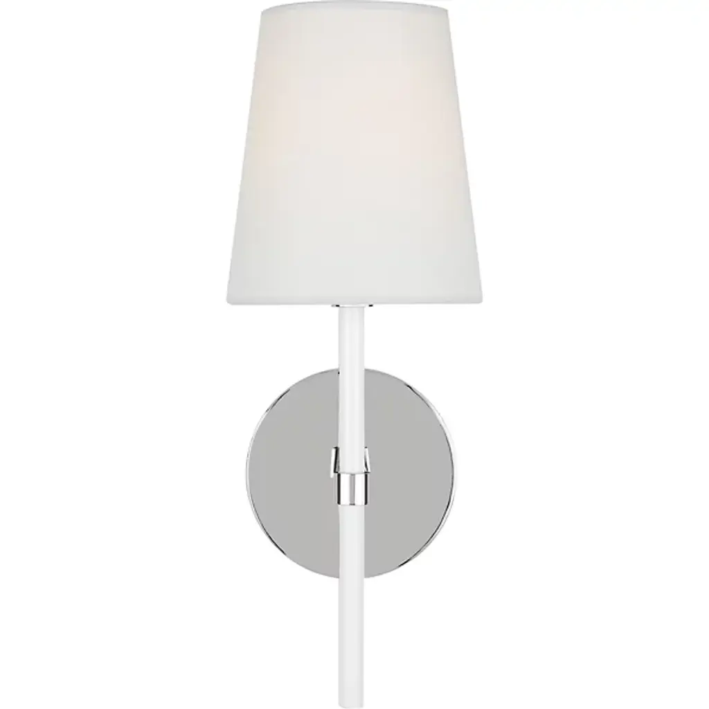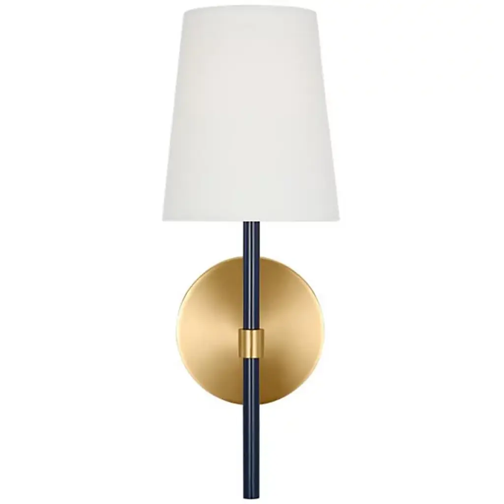 Brighten wall and hallway alike with the well-tailored design of the Monroe Wall Sconce from Visual Comfort Studio, formerly known as kate spade new york, A delightful modern fixture secured by a sleek circular wall plate, it seats a vertical cylinder with a glossy surface that rises to place a single bright socket beneath a flared linen shade. This translucent texture blocks the bright glare from the sides, splashing out a bright spot of light below that reflects off the metal structure below.