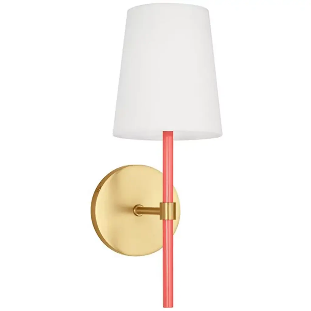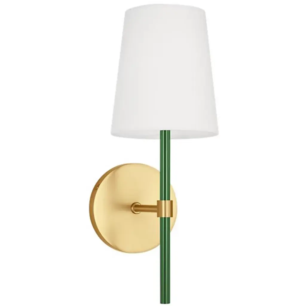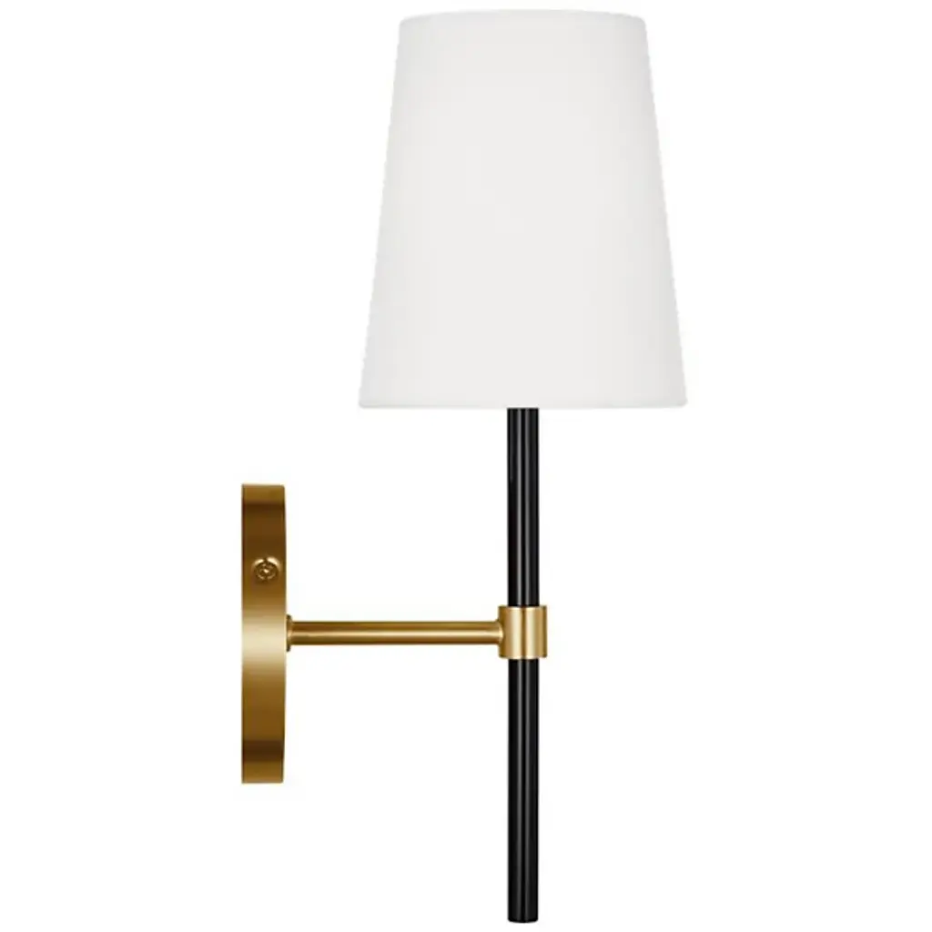 Brighten wall and hallway alike with the well-tailored design of the Monroe Wall Sconce from Visual Comfort Studio, formerly known as kate spade new york, A delightful modern fixture secured by a sleek circular wall plate, it seats a vertical cylinder with a glossy surface that rises to place a single bright socket beneath a flared linen shade. This translucent texture blocks the bright glare from the sides, splashing out a bright spot of light below that reflects off the metal structure below.