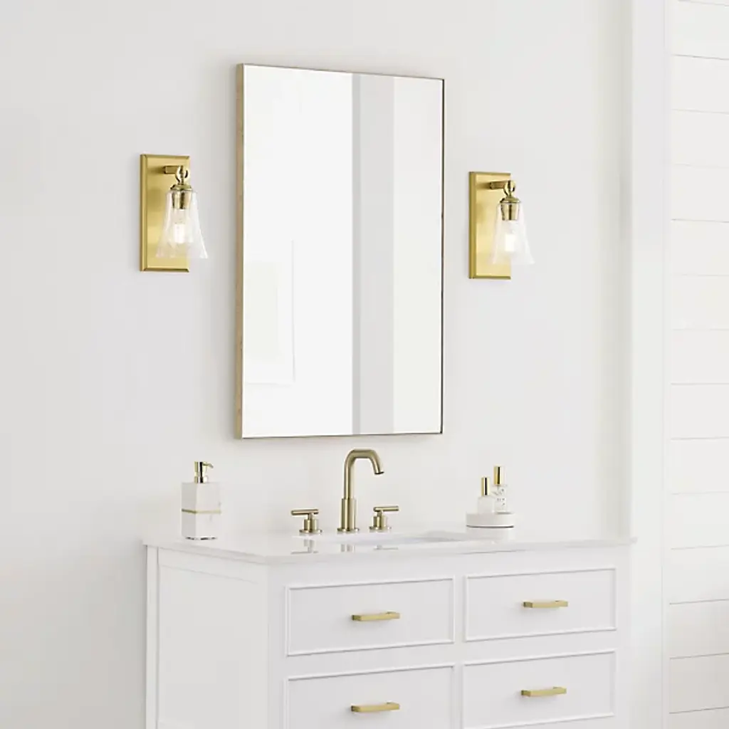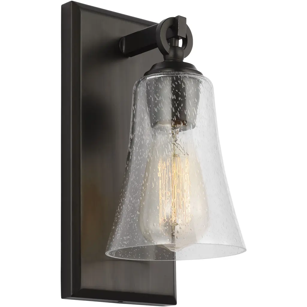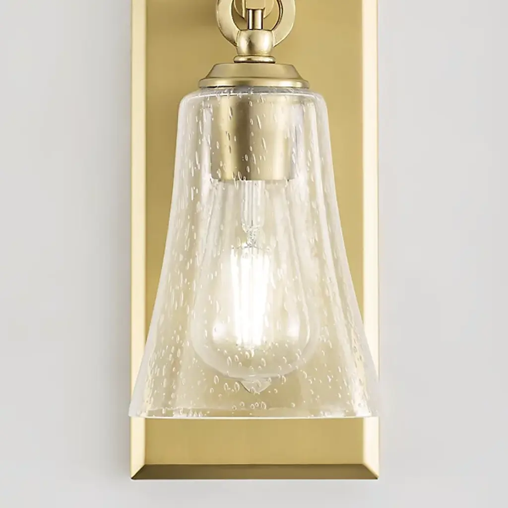 Give your bathroom the decoration it deserves with the Monterro Wall Sconce by Visual Comfort Studio, formerly known as Sean Lavin, Its simple, yet stylish silhouette features a tapered, bell-shaped glass shade which hangs from a Steel support stem via cast ring-and-hook hardware. A vintage tungsten Edison bulb sits within the shade, shining through the glass for an ambiance that adds depth and character to the surrounding space. Anchored by a tapered rectangular frame whose Chrome finish provides an alluring reflective luster.