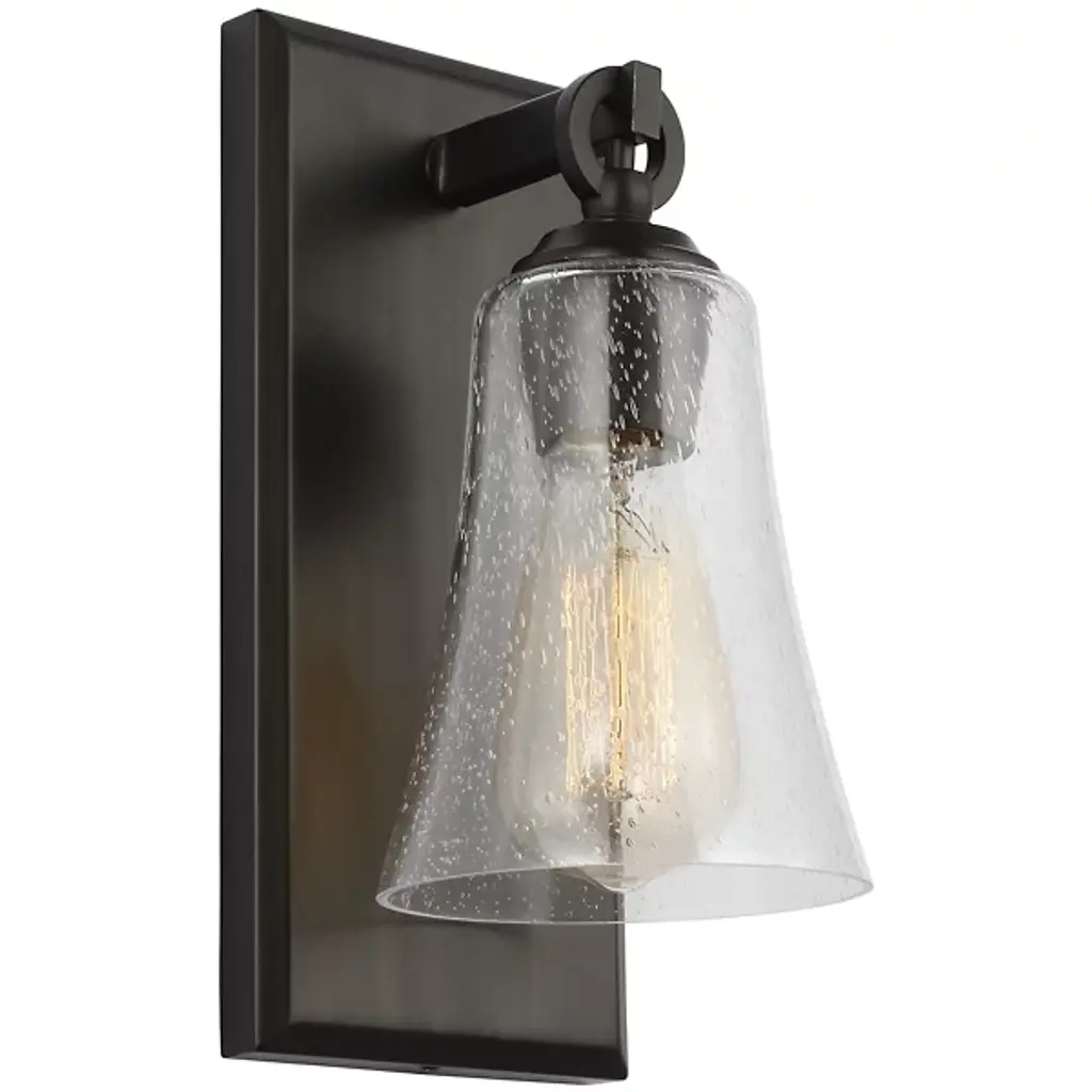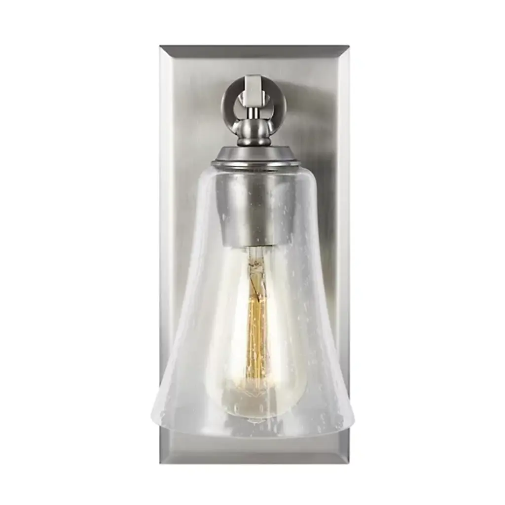 Give your bathroom the decoration it deserves with the Monterro Wall Sconce by Visual Comfort Studio, formerly known as Sean Lavin, Its simple, yet stylish silhouette features a tapered, bell-shaped glass shade which hangs from a Steel support stem via cast ring-and-hook hardware. A vintage tungsten Edison bulb sits within the shade, shining through the glass for an ambiance that adds depth and character to the surrounding space. Anchored by a tapered rectangular frame whose Chrome finish provides an alluring reflective luster.