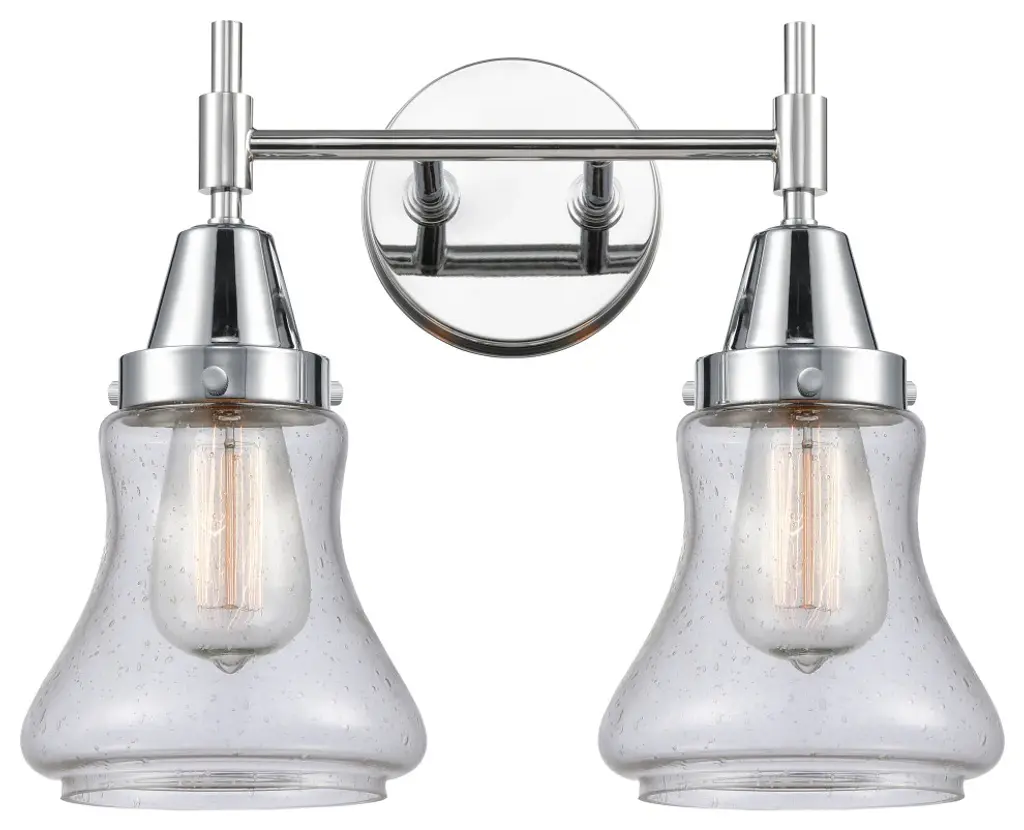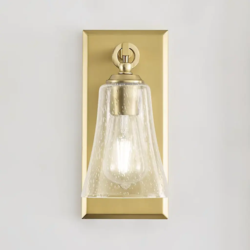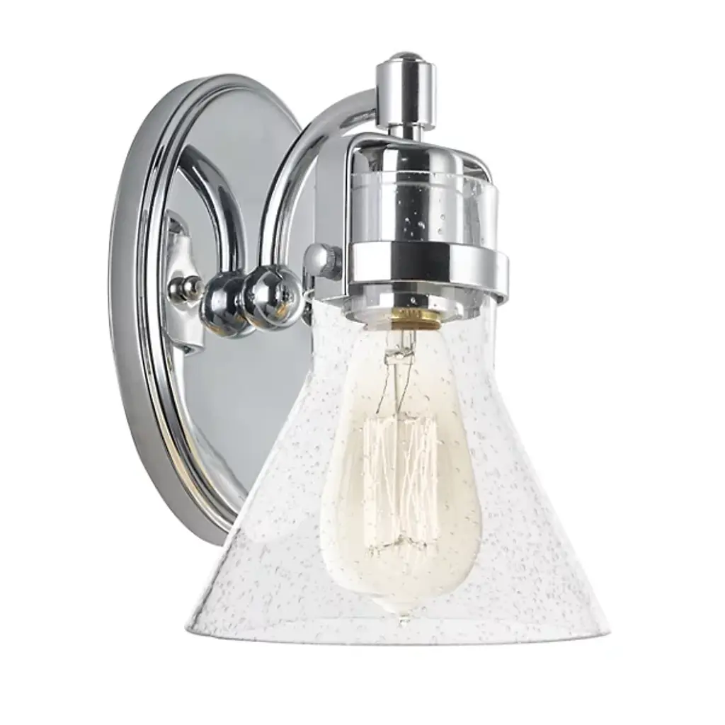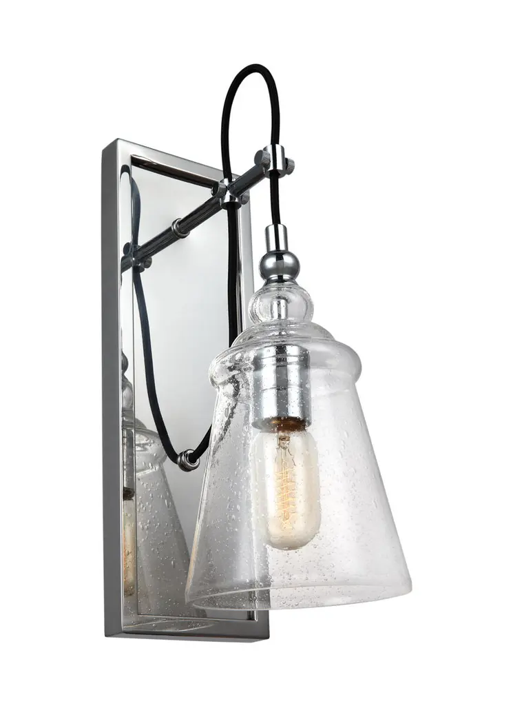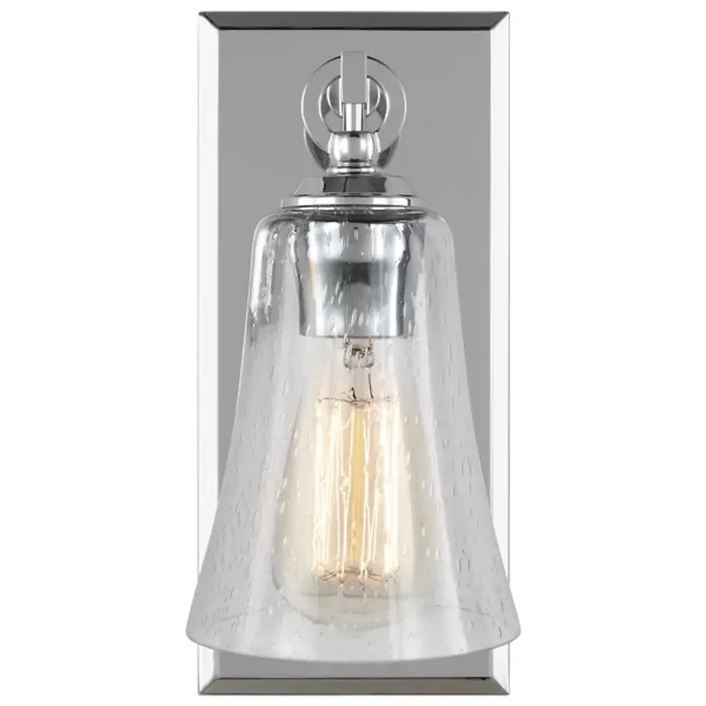 Give your bathroom the decoration it deserves with the Monterro Wall Sconce by Visual Comfort Studio, formerly known as Sean Lavin, Its simple, yet stylish silhouette features a tapered, bell-shaped glass shade which hangs from a Steel support stem via cast ring-and-hook hardware. A vintage tungsten Edison bulb sits within the shade, shining through the glass for an ambiance that adds depth and character to the surrounding space. Anchored by a tapered rectangular frame whose Chrome finish provides an alluring reflective luster.