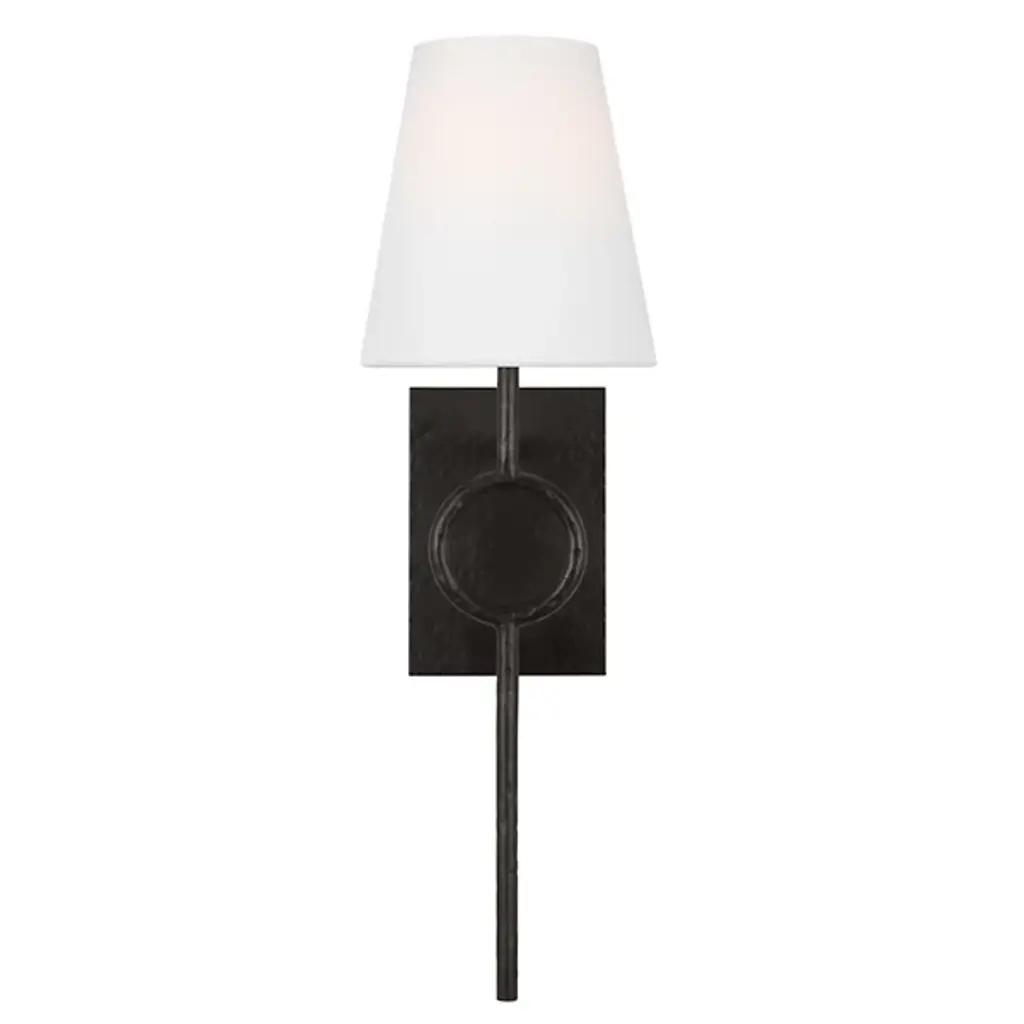 Give your living space a charming transitional note with the Montour Wall Sconce by Visual Comfort Studio. This wall sconce is the creation of designer Thom Filicia. Your sconce features a linear framework of steel. The Montour Wall Sconce contours into an elegant ring at its center. A geometric backplate keeps this light fixture secured to your wall. A tapered drum shade of white linen tempers the light emitted by an LED lamp for eye comfort.