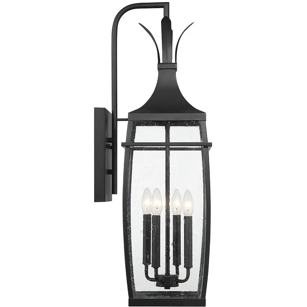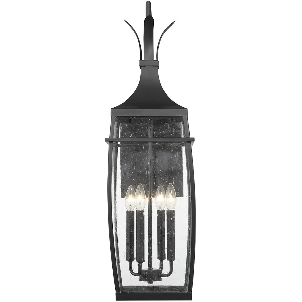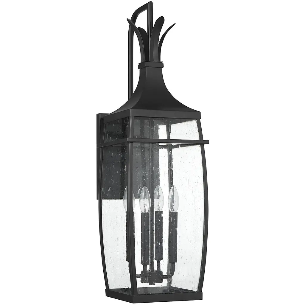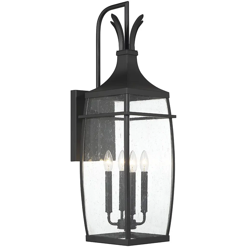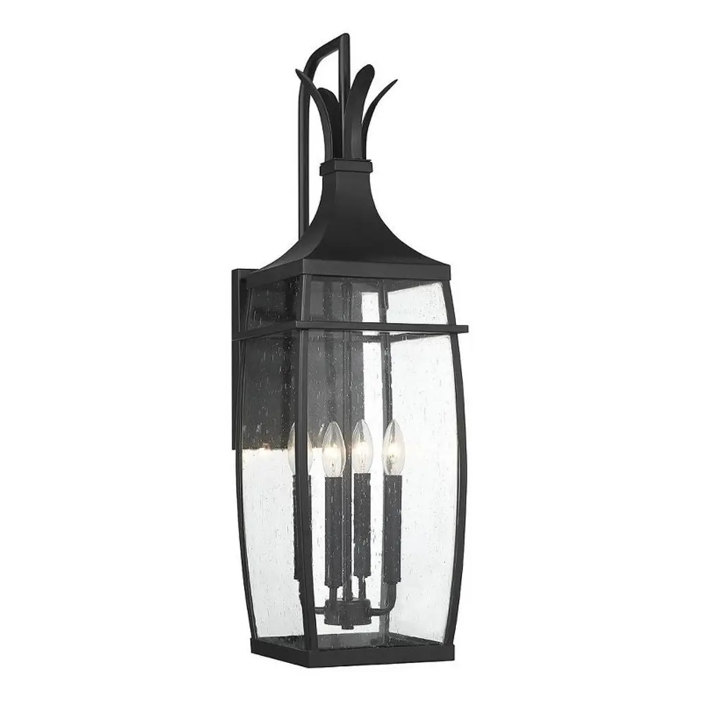 A hint of nature-inspired detailing decorates the top of this Savoy House Montpelier 4-light outdoor wall light. Its slightly curved structure features panes of clear seeded glass and is finished in a classic matte black. Montpelier is 32" in height, 9.5" in width and extends 12" from the wall. It uses 4 candelabra size bulbs with a max of 40 watts per bulb (bulbs not included).