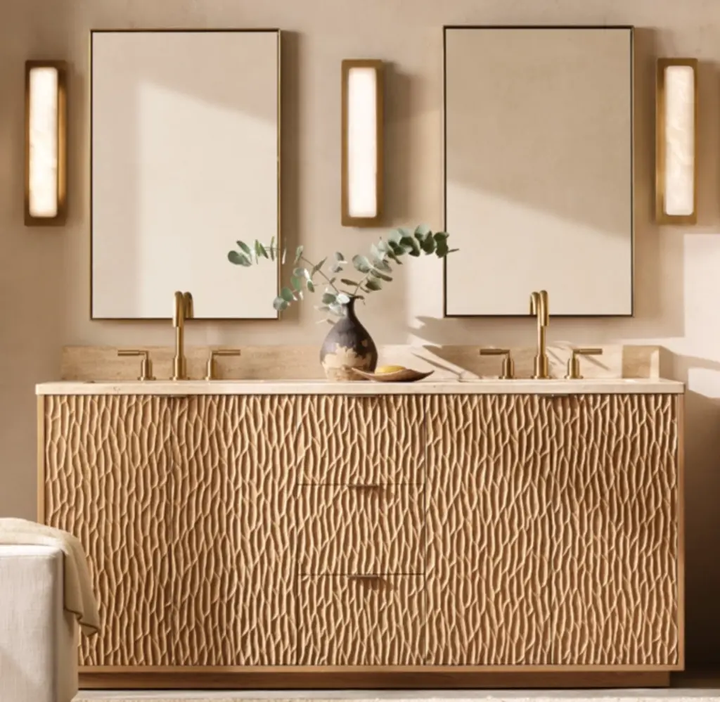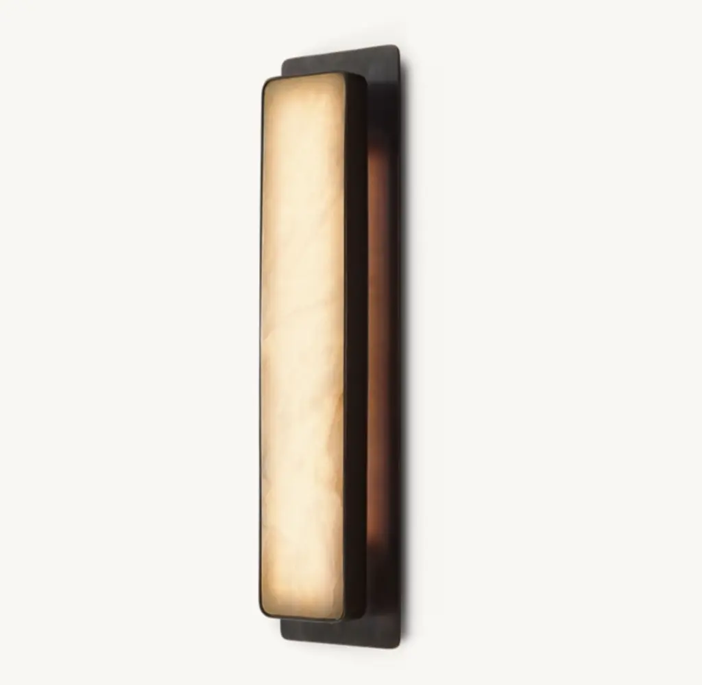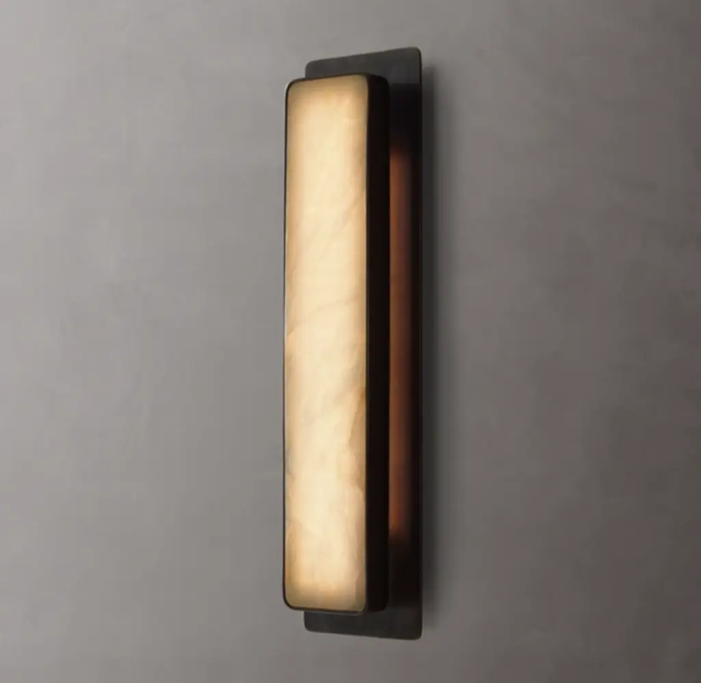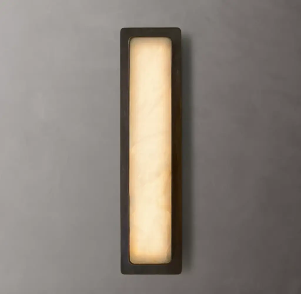 A spare geometric silhouette inlaid with natural alabaster lends our sconce by Ian K. Fowler its luxe postmodern sensibility. The hand-carved panel of translucent stone is encased in a metal frame, casting a warm glow that reveals rich veining and tonal beauty. Casting a soft backlight, Montreux produces a subtle floating effect.