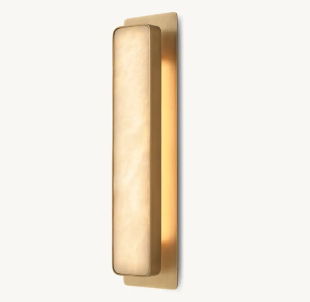 A spare geometric silhouette inlaid with natural alabaster lends our sconce by Ian K. Fowler its luxe postmodern sensibility. The hand-carved panel of translucent stone is encased in a metal frame, casting a warm glow that reveals rich veining and tonal beauty. Casting a soft backlight, Montreux produces a subtle floating effect.