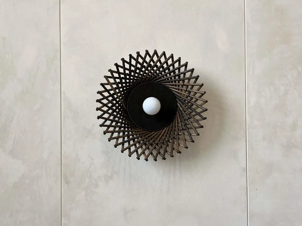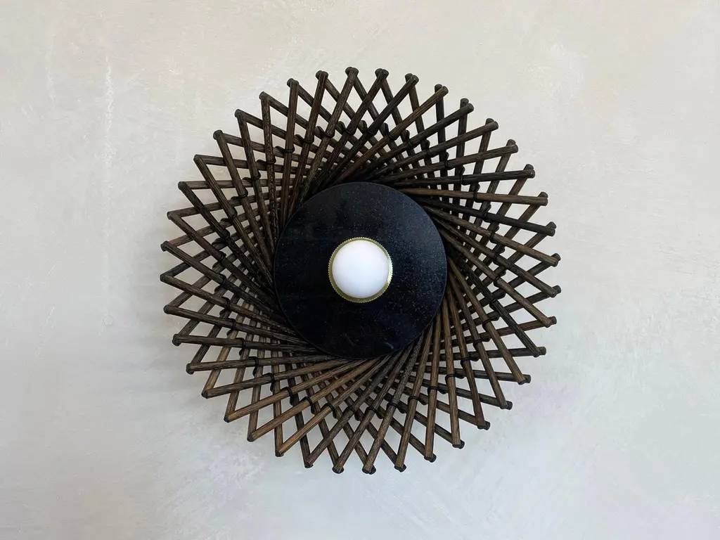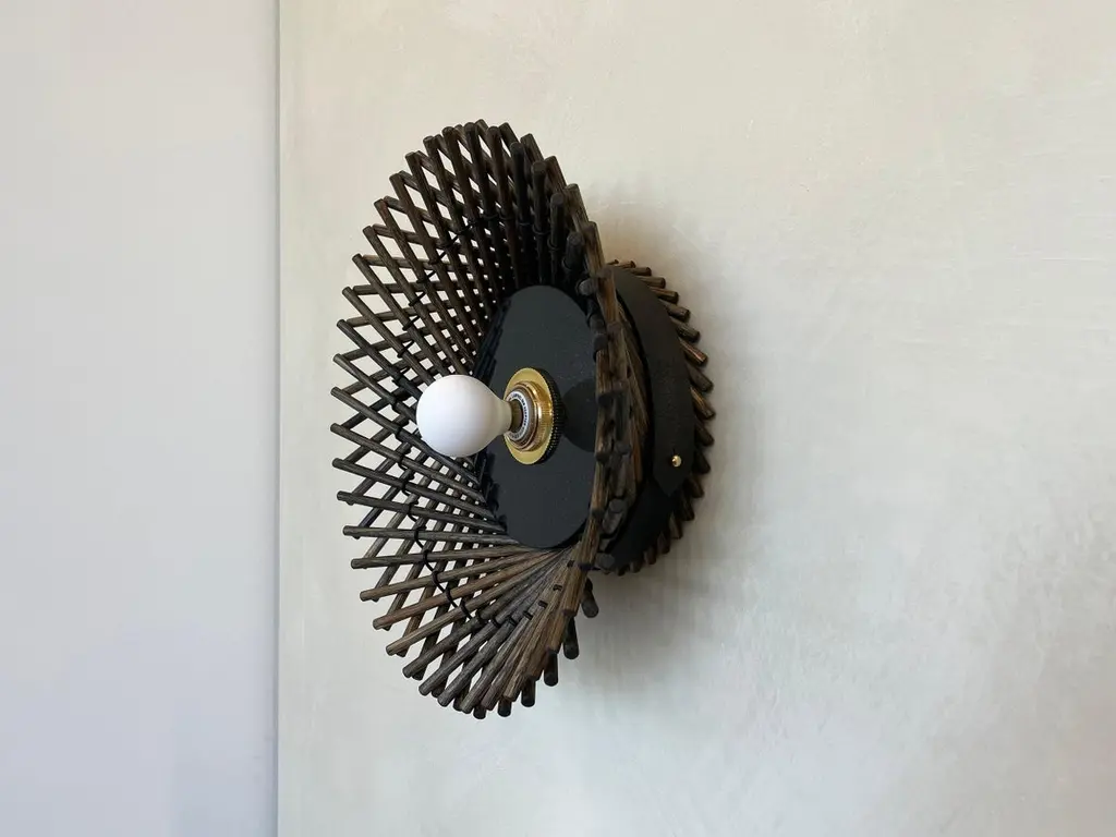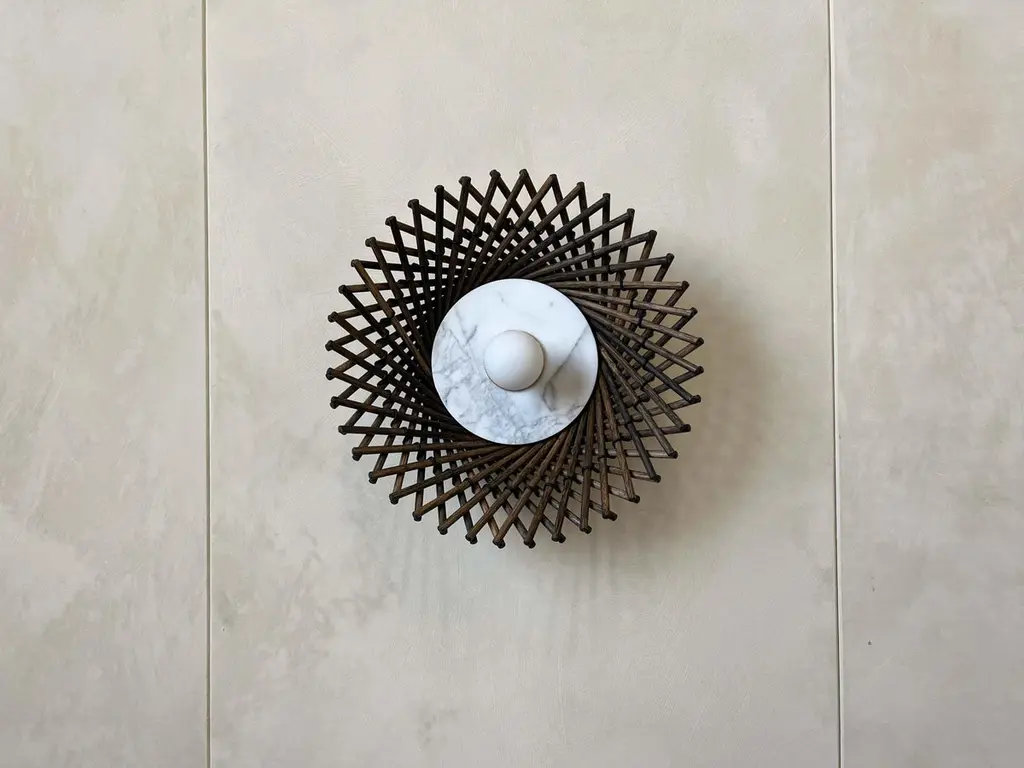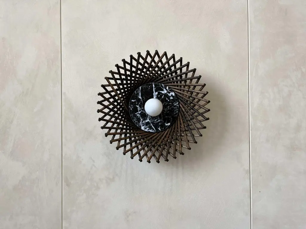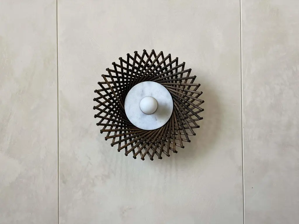 Mooda Oxidized Oak sconce 6 by INDO-Dimensions: Ø 30.5 x 12.7 cmMaterials: Oxidized Oak, Venetian Calacatta MarbleAll our lamps can be wired according to each country. If sold to the USA it will be wired for the USA for instance.ELECTRICALLAMPING100-250V Rated E26 Metal SocketDIMMINGLeading Edge OR Trailing EdgeFits all standard J-BoxesBULBTALA SPHERE IIG24 Matte Glass LED Bulb110-120V 6W95CRI 480Lm 2700KAlso available in other dimensions and materials. Ø options: 40.6 cm.Material options:WOODMapleOak FINISHBleachedNaturalOxidizedSTONEMugla WhiteMadurai BlackCrema MarfilNero Marquina Venetian CalacattaLEATHERVachetta NaturalVinegaroon BlackMETALMatte BlackBrushed BrassEach piece is carefully handcrafted by our team using natural materials and traditional processes. Slight variations may occur. INDO- is an award winning interdisciplinary design studio based in Providence, RI. Founded in 2018 by Urvi Sharma and Manan Narang - both grew up in New Delhi and met at the Rhode Island School of Design - INDO- is a product of experiencing both places and cultures. Using a blend of craft and narrative in our creative process, we aim to share the rich cultural and historical identity we bring with us as Indian designers in the rapidly changing landscape of American design. With a focus on re-contextualizing traditional techniques from different disciplines of art and craft into our work, INDO- creates contemporary objects that celebrate the handmade and acknowledge the people and places that inspired them.