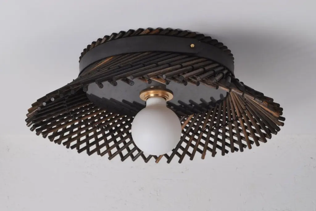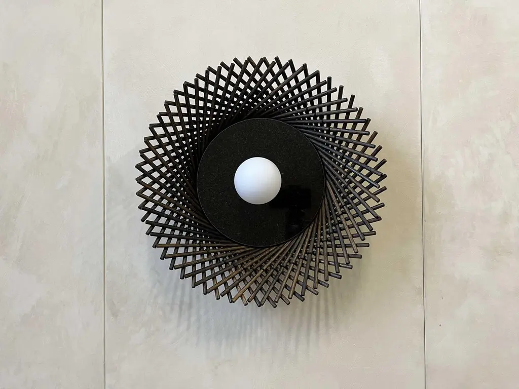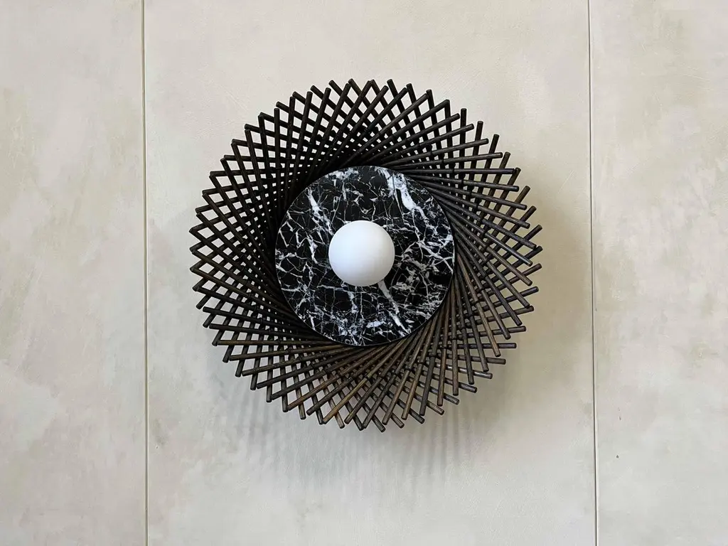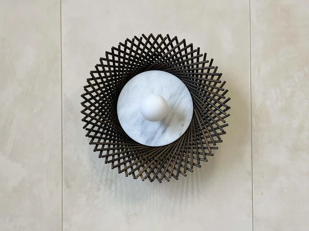 Mooda Oxidized Oak sconce 6 by INDO-Dimensions: Ø 40.6 x D 15.2 cmMaterials: Oxidized Oak, Venetian Calacatta Marble All our lamps can be wired according to each country. If sold to the USA it will be wired for the USA for instance.ELECTRICALLAMPING100-250V Rated E26 Metal SocketDIMMINGLeading Edge OR Trailing EdgeFits all standard J-BoxesBULBTALA SPHERE IIG24 Matte Glass LED Bulb110-120V 6W95CRI 480Lm 2700KAlso available in other dimensions and materials. Please contact us.Dimension options: Ø 30.5 x 12.7 cm.Material options:WOODMapleOak FINISHBleachedNaturalOxidizedSTONEMugla WhiteMadurai BlackCrema MarfilNero Marquina Venetian CalacattaLEATHERVachetta NaturalVinegaroon BlackMETALMatte BlackBrushed BrassEach piece is carefully handcrafted by our team using natural materials and traditional processes. Slight variations may occur. INDO- is an award winning interdisciplinary design studio based in Providence, RI. Founded in 2018 by Urvi Sharma and Manan Narang - both grew up in New Delhi and met at the Rhode Island School of Design - INDO- is a product of experiencing both places and cultures. Using a blend of craft and narrative in our creative process, we aim to share the rich cultural and historical identity we bring with us as Indian designers in the rapidly changing landscape of American design. With a focus on re-contextualizing traditional techniques from different disciplines of art and craft into our work, INDO- creates contemporary objects that celebrate the handmade and acknowledge the people and places that inspired them.