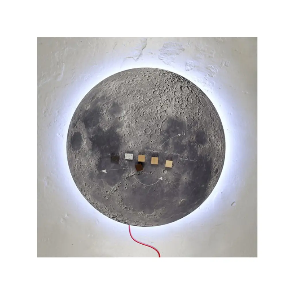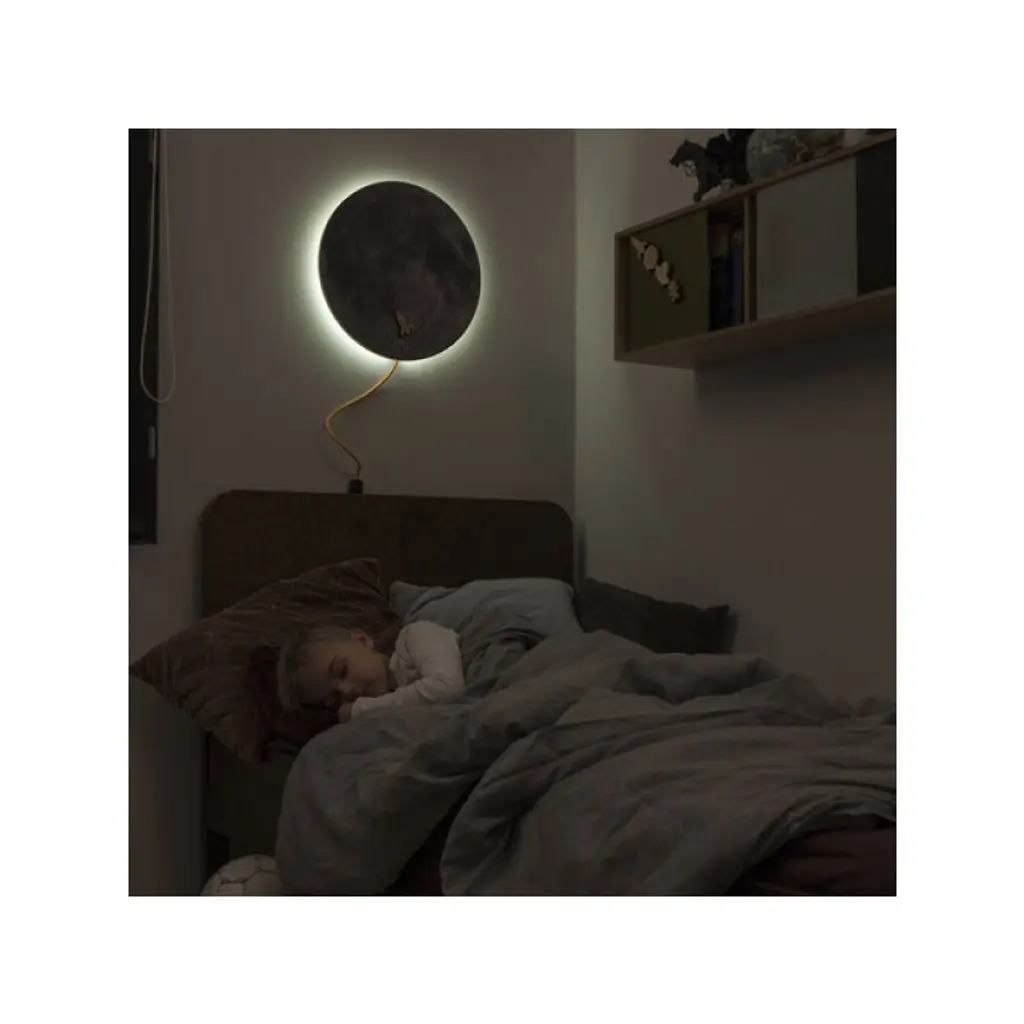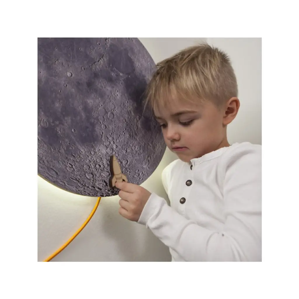 The Moon noteboard by Kotonadesign is a fun wall lamp, magnetic memory board and chalkboard at the same time. The package includes a rocket-shaped magnet, which dims the light by about 70% when attached to the board. When the rocket is removed, the light becomes bright again. The Moon noteboard is the perfect mood light for example in the children's room.