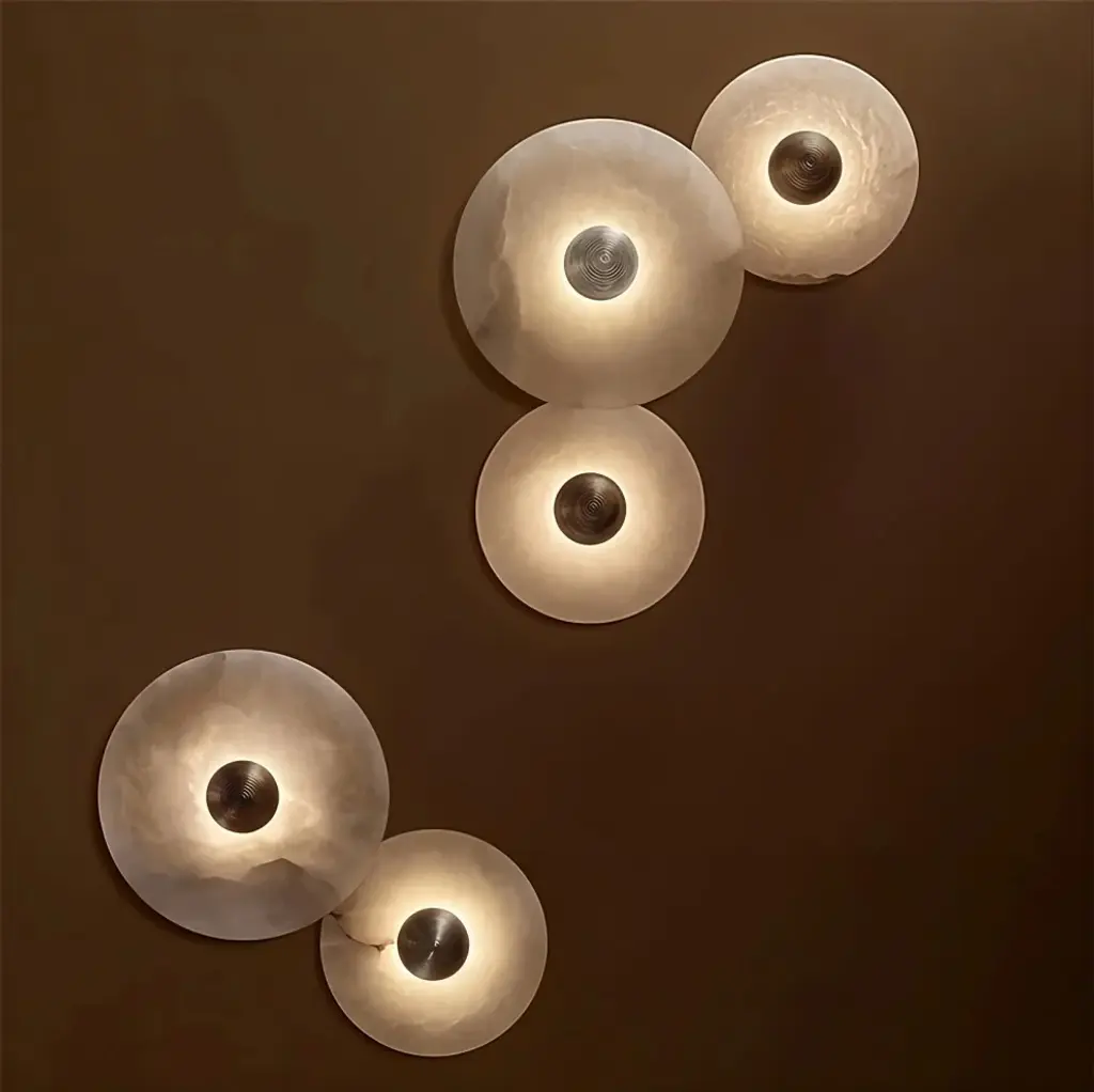 These beautiful wall sconces are handmade from natural marble. The warm, earthy tones of the marble will complement any room. Hung alone or in combinations, these sconces are the perfect way to add some natural beauty to your home. Marble sconces are all-natural marble imported from Spain. The natural patterns of sedimentary rock include, but are not limited to, snow patterns, ink patterns, flame patterns, ice cracks, etc. The texture of each sconce is unique. Material: Natural Marble, IronLight Source: LED Chips (Installed)Power: 3WSconce Diameter: 8"Dimmable: NoColor Temperature: Warm (3500K)Voltage: 110-240VWarranty: 2 YearsApplication: Living Room, Dining Room, Bedroom, Hotel, Bar etc.