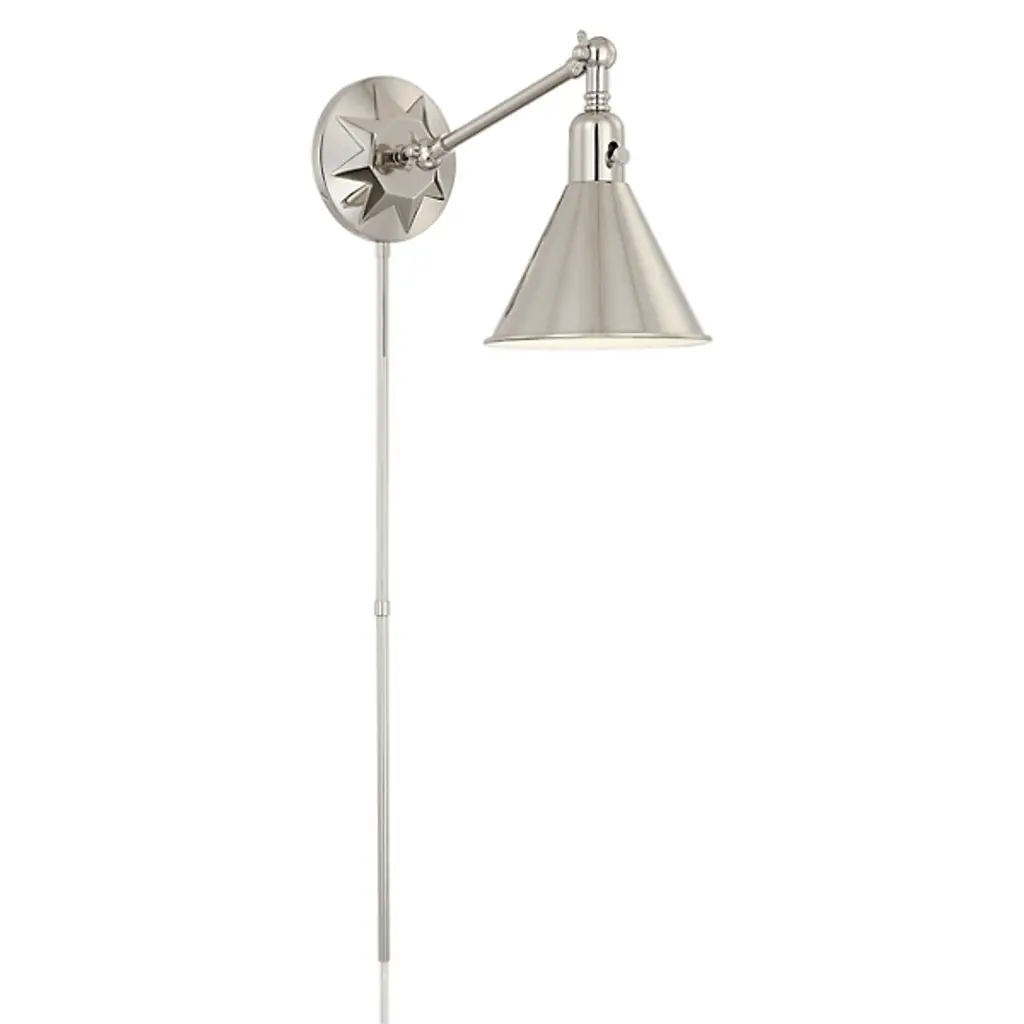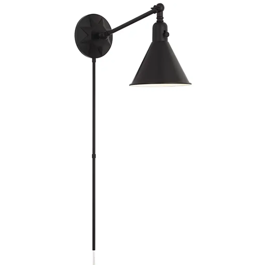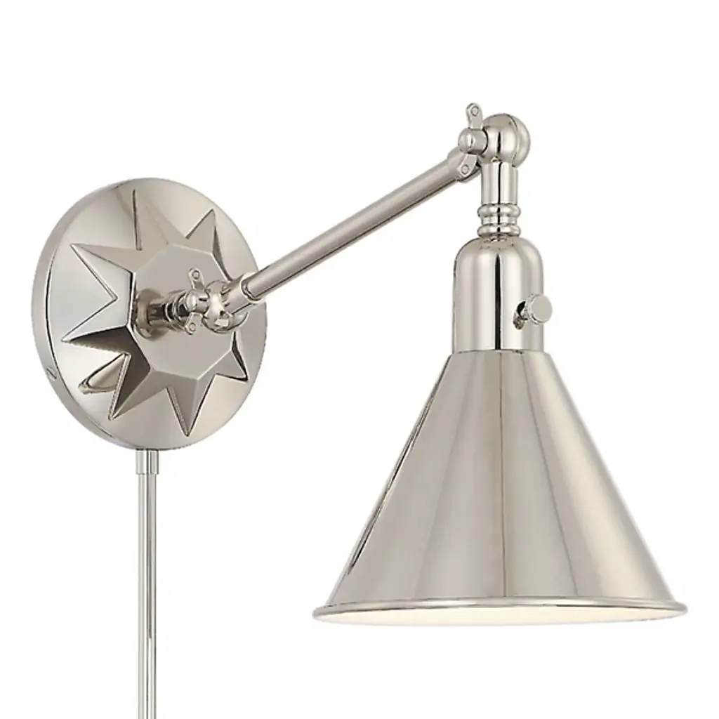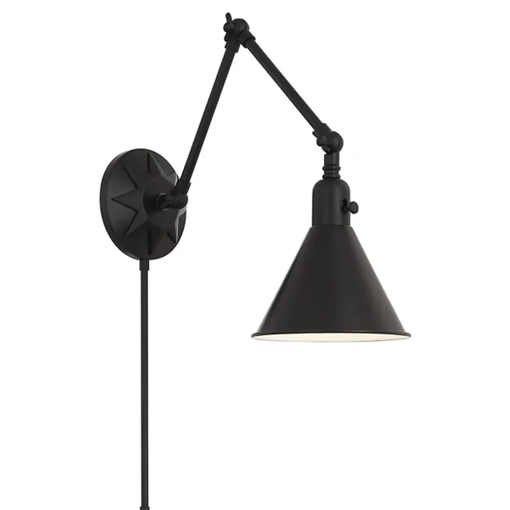Illumination with a sense of direction. The Morgan Adjustable Wall Sconce by Crystorama features a conical shade that imparts a stylish look while serving the practical purpose of directing its light precisely where it's needed. The arm of this sconce pivots at each end, allowing easy repositioning, and the onboard power switch makes it practical for use for task and ambient lighting alike.