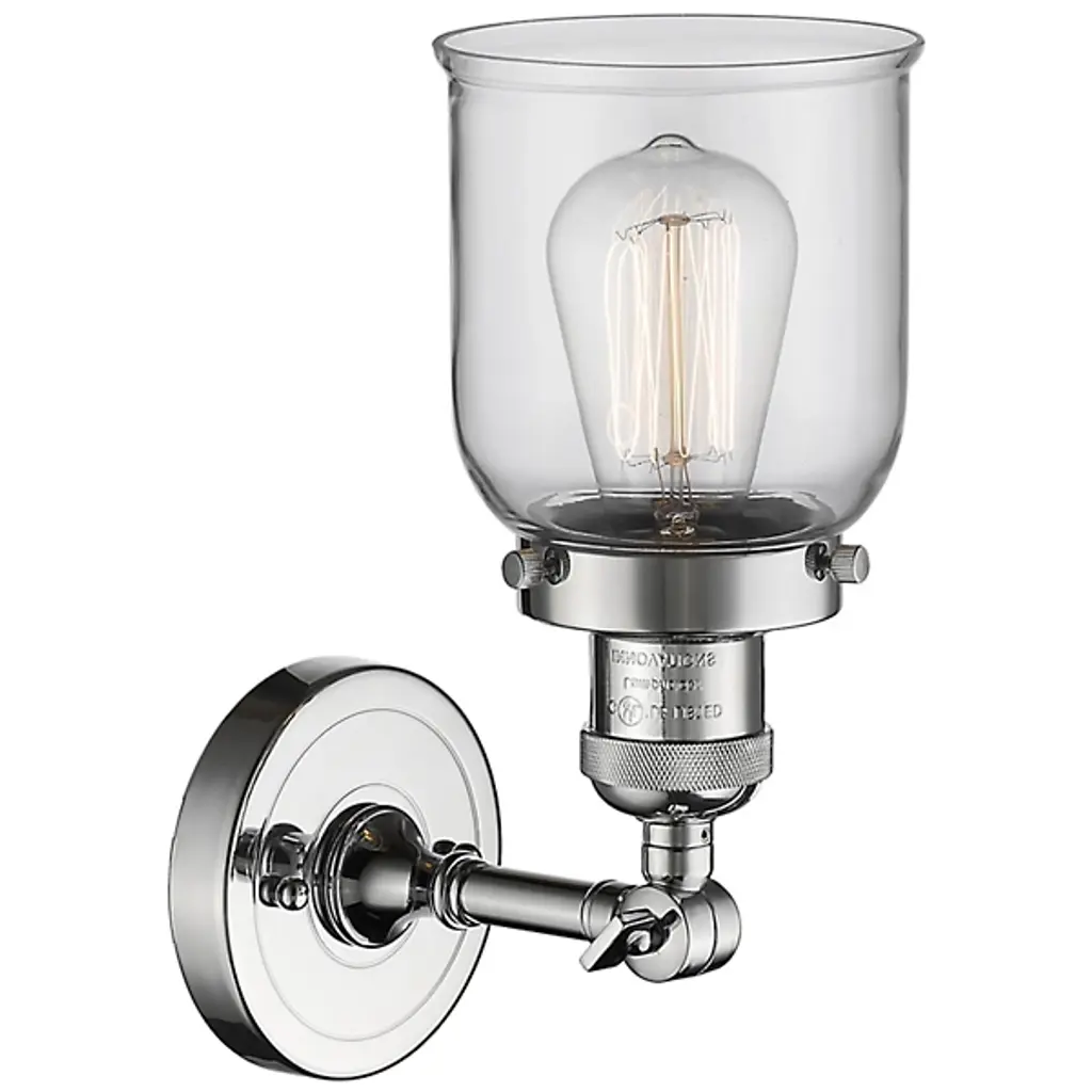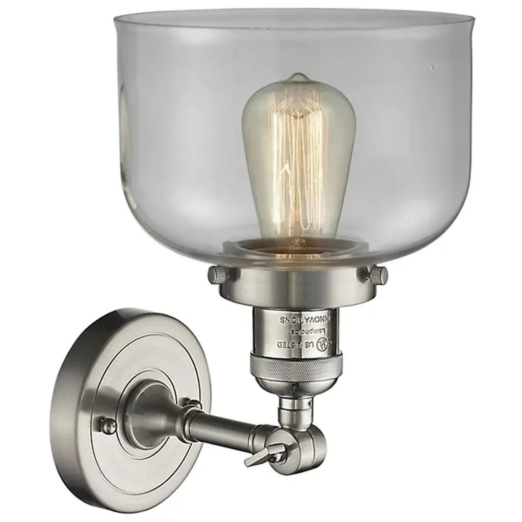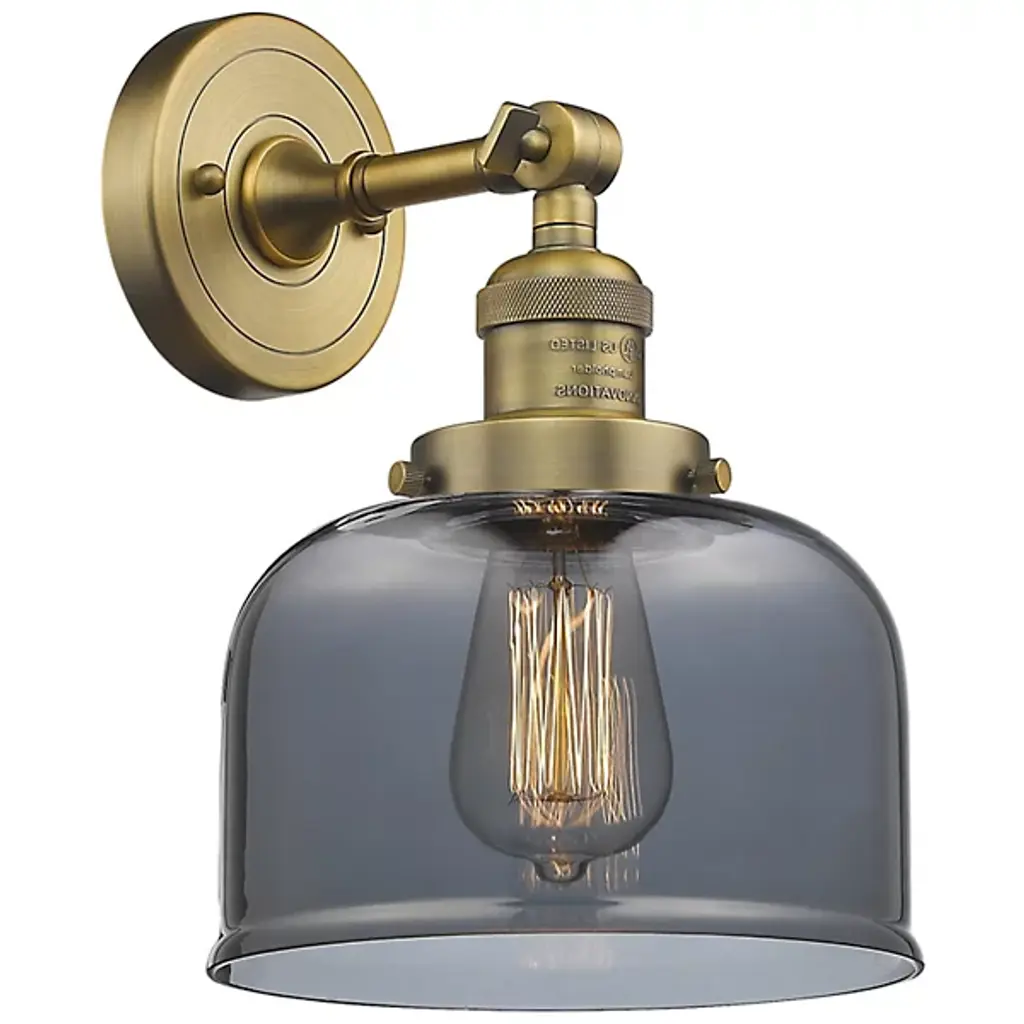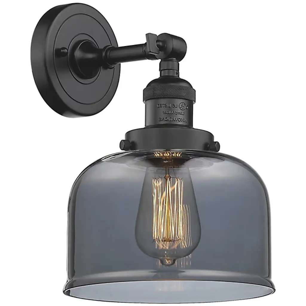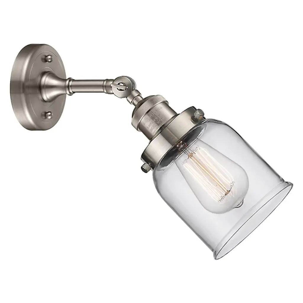 The Moriah Wall Sconce by Alder & Ore is an adjustable, handsome way to add a little extra light to spaces. Anchored by a round wall plate, a 180-degree swivel connects to an engraved cast cup, supporting a single, visible bulb within a bell-shaped glass shade. Minimal grommet details add to the industrial feel of this piece and a uniform finish dresses up the metal elements of this sconce, making it a charming choice to brighten your rooms.