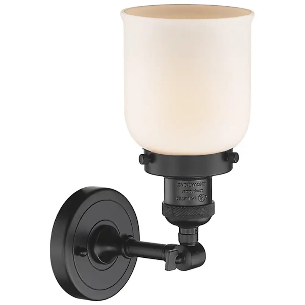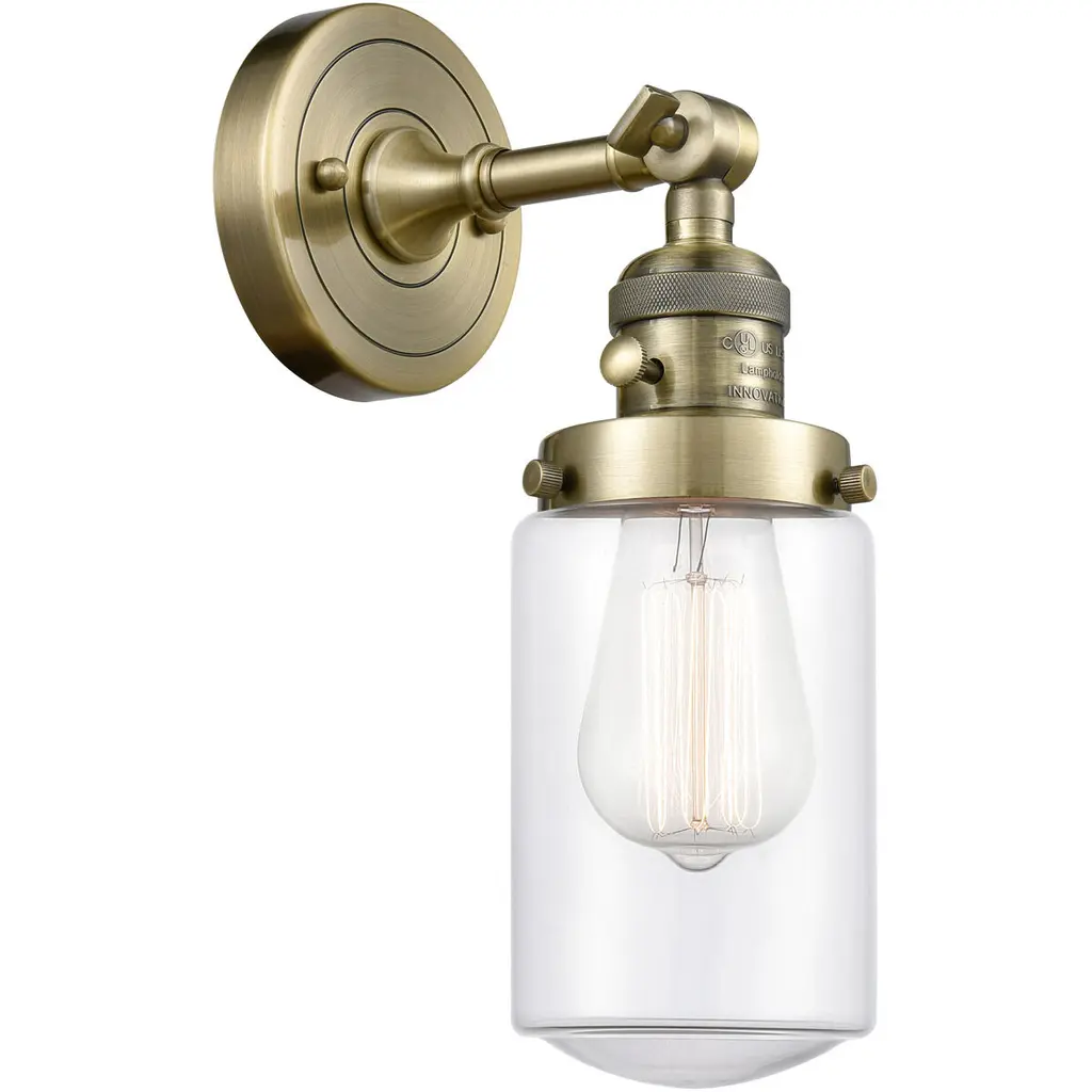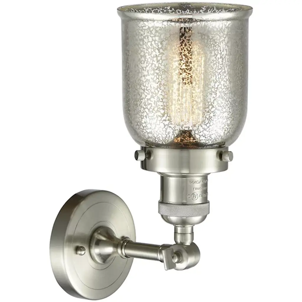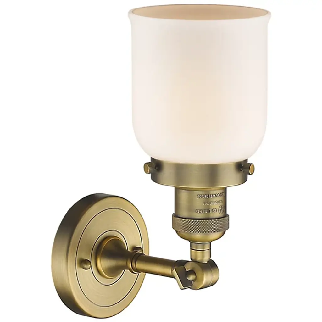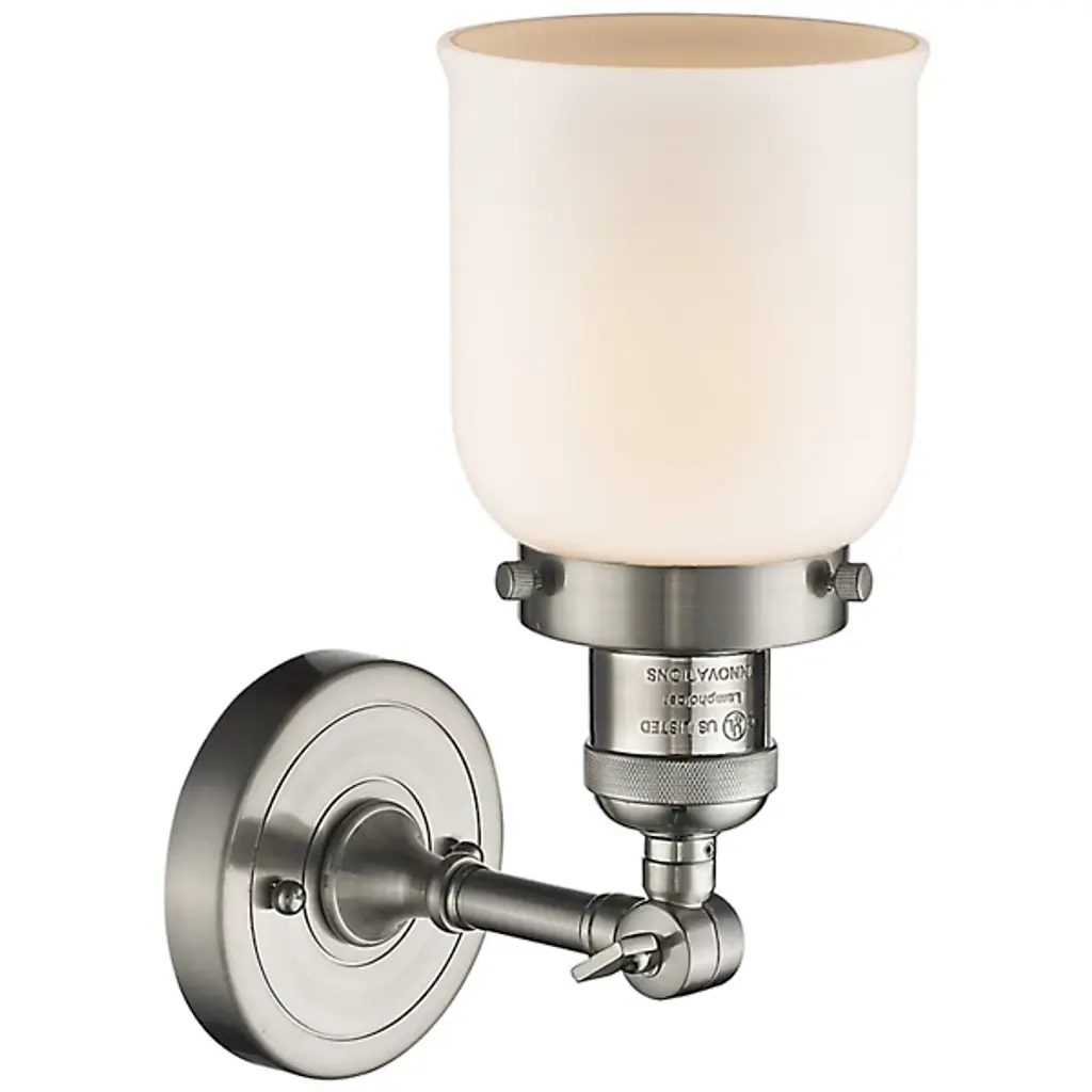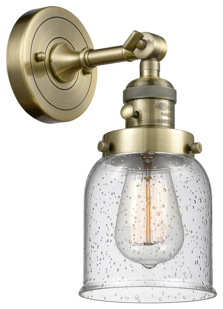 The Moriah Wall Sconce by Alder & Ore is an adjustable, handsome way to add a little extra light to spaces. Anchored by a round wall plate, a 180-degree swivel connects to an engraved cast cup, supporting a single, visible bulb within a bell-shaped glass shade. Minimal grommet details add to the industrial feel of this piece and a uniform finish dresses up the metal elements of this sconce, making it a charming choice to brighten your rooms.