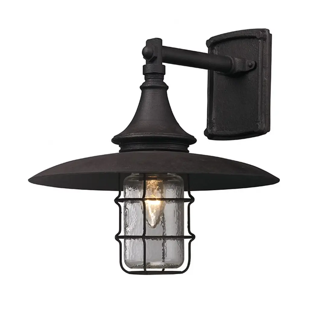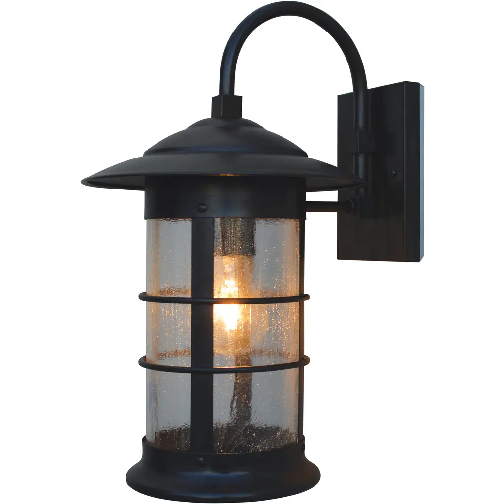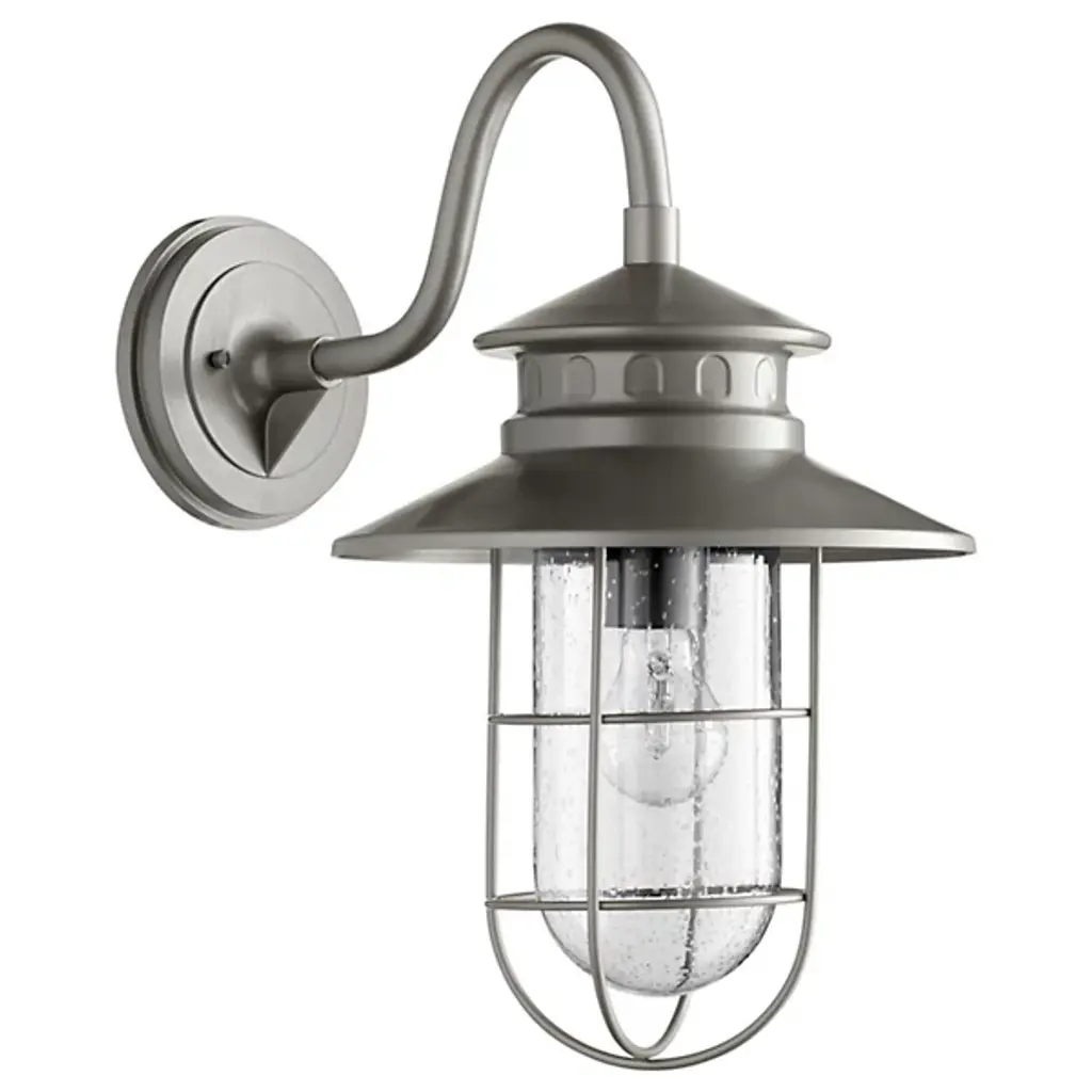 Give your home a traditional coastal flare with the Moriarty Outdoor Wall Sconce from Quorum International. The Moriarty takes the portside lantern and refines it with fine modern trimmings. A soft question-mark curving arm presents its rugged metal construction. An evocative hood flares out in layers and vented accents, creating an arching caged framework. Its light welcomes guests in with a warmth and texture made up of from the combination of vintage bulbs and clear seeded glass.