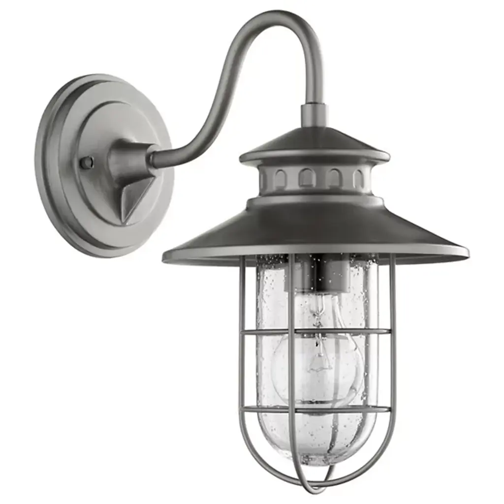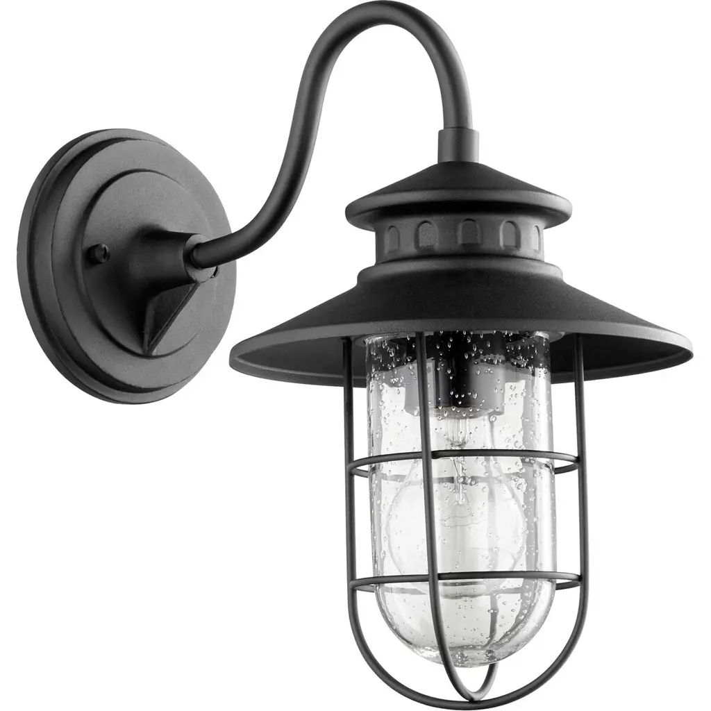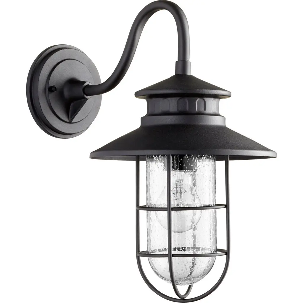 Give your home a traditional coastal flare with the Moriarty Outdoor Wall Sconce from Quorum International. The Moriarty takes the portside lantern and refines it with fine modern trimmings. A soft question-mark curving arm presents its rugged metal construction. An evocative hood flares out in layers and vented accents, creating an arching caged framework. Its light welcomes guests in with a warmth and texture made up of from the combination of vintage bulbs and clear seeded glass.