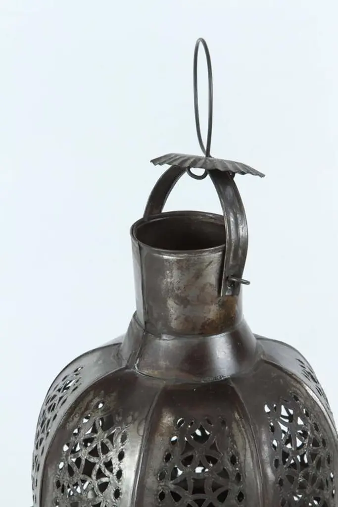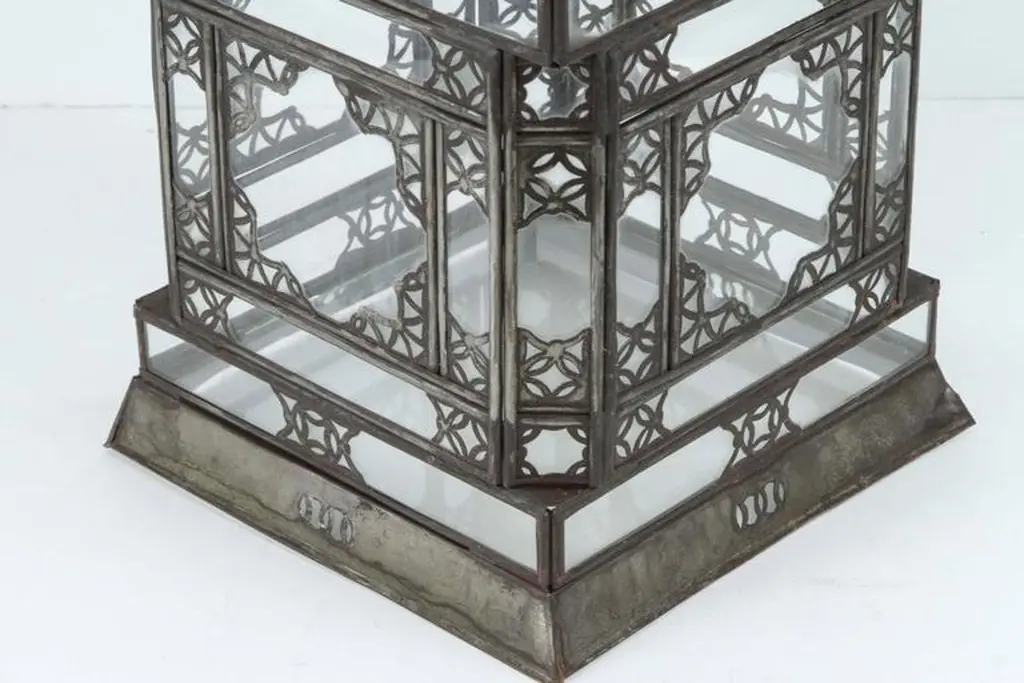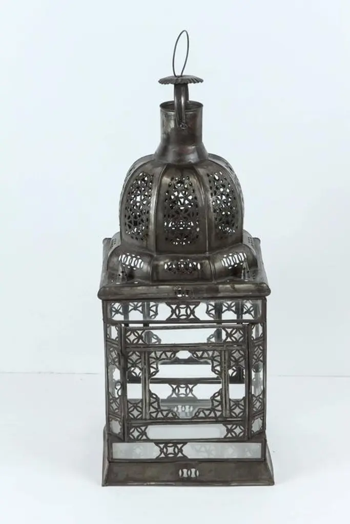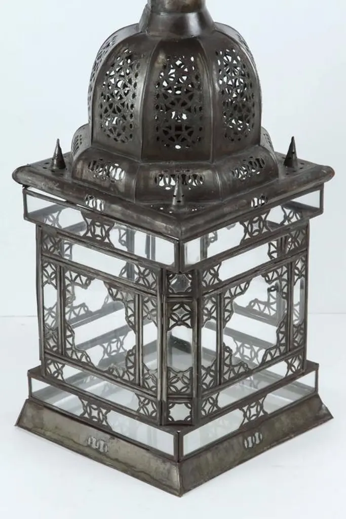 Moroccan Moorish clear glass candle lantern with filigree designs, handcrafted in Morocco. Rust patina color finish.Hurricane candle lamp with clear glass bottom, great to use as a table lantern or hanging pendant or wall sconce.The lantern has a small door to access the inside.Many of our customers place oil candles or tea lights inside the main section making a romantic and enjoyable decorative accent for entertaining friends and family.In a convenient portable size, may be suspended from loops or installed on any surface, as a sconce on a wall bracket or as a hurricane candle lantern.Could also be used hanging and rewired as a Moroccan pendant or wall sconce.Square with glass decorated with Moorish filigree stars designs hand-cut.Multiple available, please contact us if you need more than one.Dimensions:20" H x 9" x 9" square.For indoor use or covered area only.About the Moroccan lanterns:The metal and glass hand-crafted lantern from Morocco is a captivating pieces of artistry that combines the rich cultural heritage and exquisite craftsmanship of the region. Its design reflects the traditional Moroccan style, which is renowned for its intricate detailing and vibrant aesthetic. This vintage Moroccan lantern is meticulously handcrafted using a combination of metal and glass, resulting in a stunning blend of materials that enhances its overall beauty. The framework of the Moorish lantern is skillfully constructed from metal which provides a sturdy foundation and intricate patterns. The metalwork adorning the Moroccan light fixture features intricate filigree patterns, geometric motifs, and delicate scrollwork, all meticulously hand-cut by skilled Moroccan artisans in Marrakech.These ornate Moorish designs create mesmerizing shadows when the Moroccan hanging lantern is illuminated, casting enchanting patterns that dance across the surroundings. The glass components of the Moroccan lantern add a touch of elegance and brilliance to its appearance.Clear and multicolor glass panels are carefully inserted into the metal framework.These panels may showcase traditional Moroccan geometric Islamic designs. When the Moroccan lantern is lit from within, the glow emanating through the colorful glass panels transforms the surrounding space into a warm and inviting atmosphere.The interplay of light and shadow created by the intricate metalwork and the translucent glass adds depth and allure to the lantern's overall charm. The craftsmanship of this Moroccan light fixture is a testament to the dedication and skill of the artisans who meticulously handcraft each piece. The attention to detail, the artistic flair, and the fusion of metal and glass make this Moroccan lantern a true work of art, capturing the essence of Moroccan culture and heritage.Whether displayed as a centerpiece or hung from a hook, this metal and glass handcrafted lantern from Morocco effortlessly evokes a sense of enchantment, transporting you to the vibrant streets and magical ambiance of Moroccan nights.