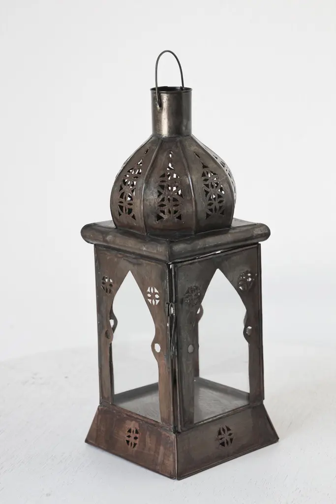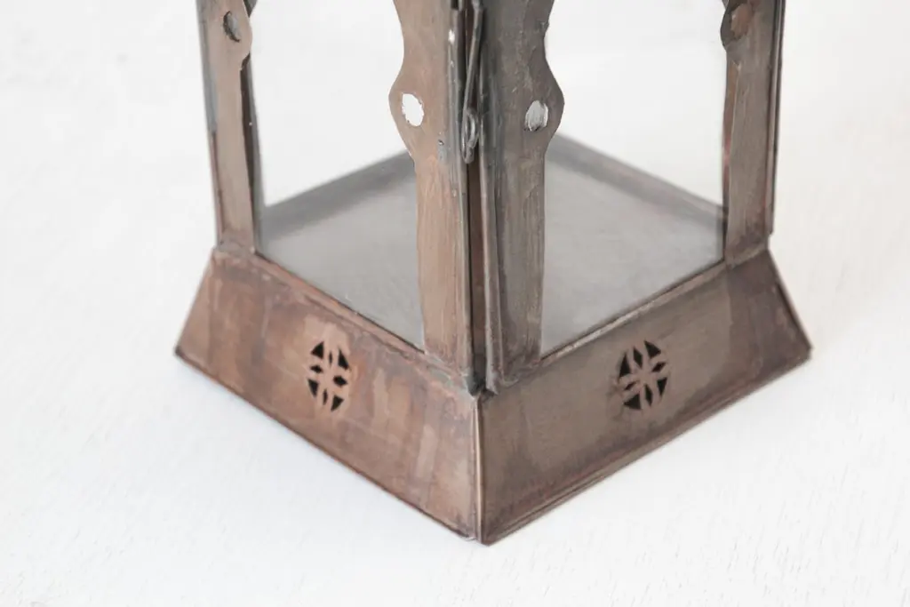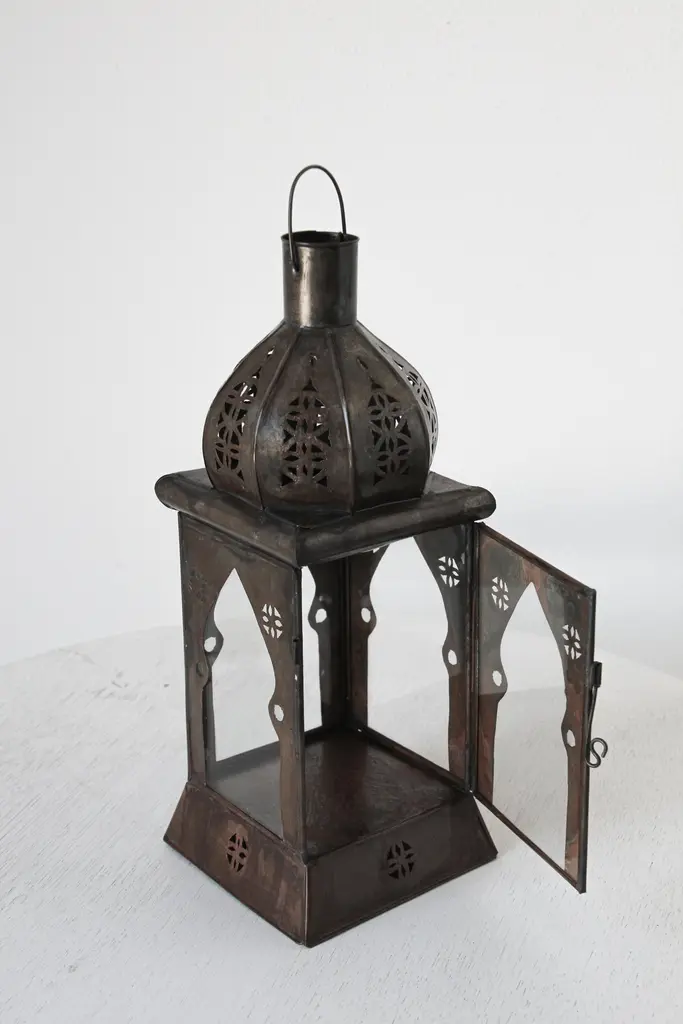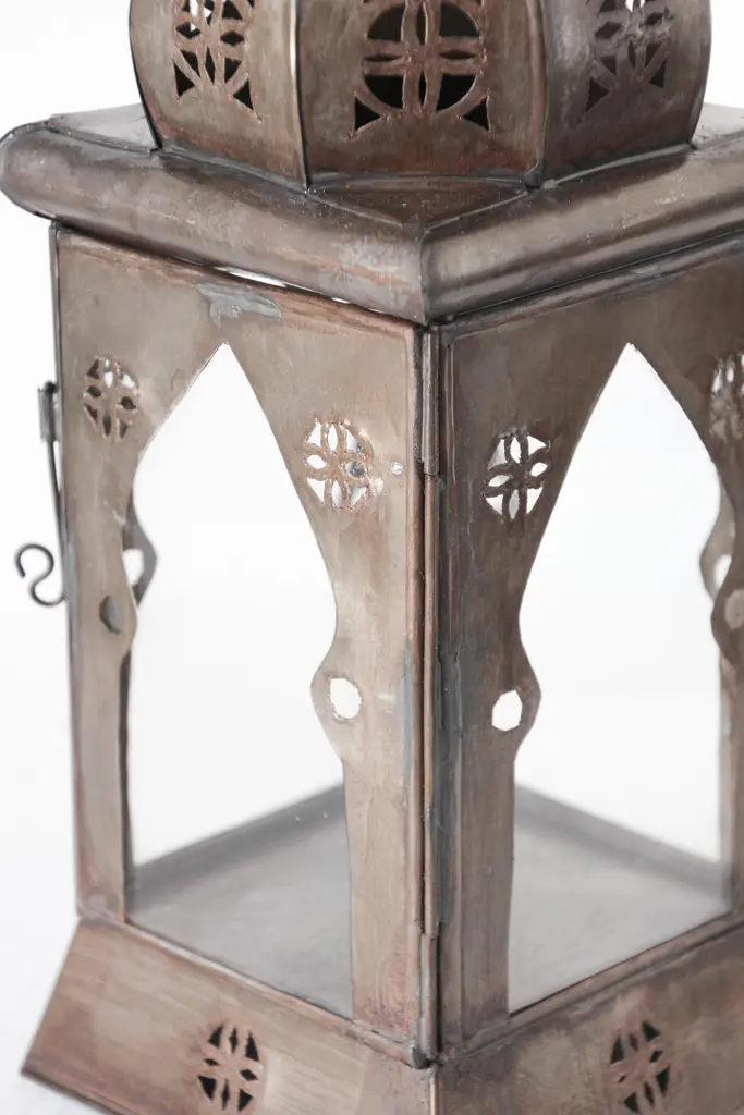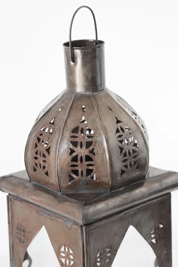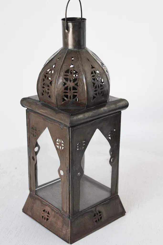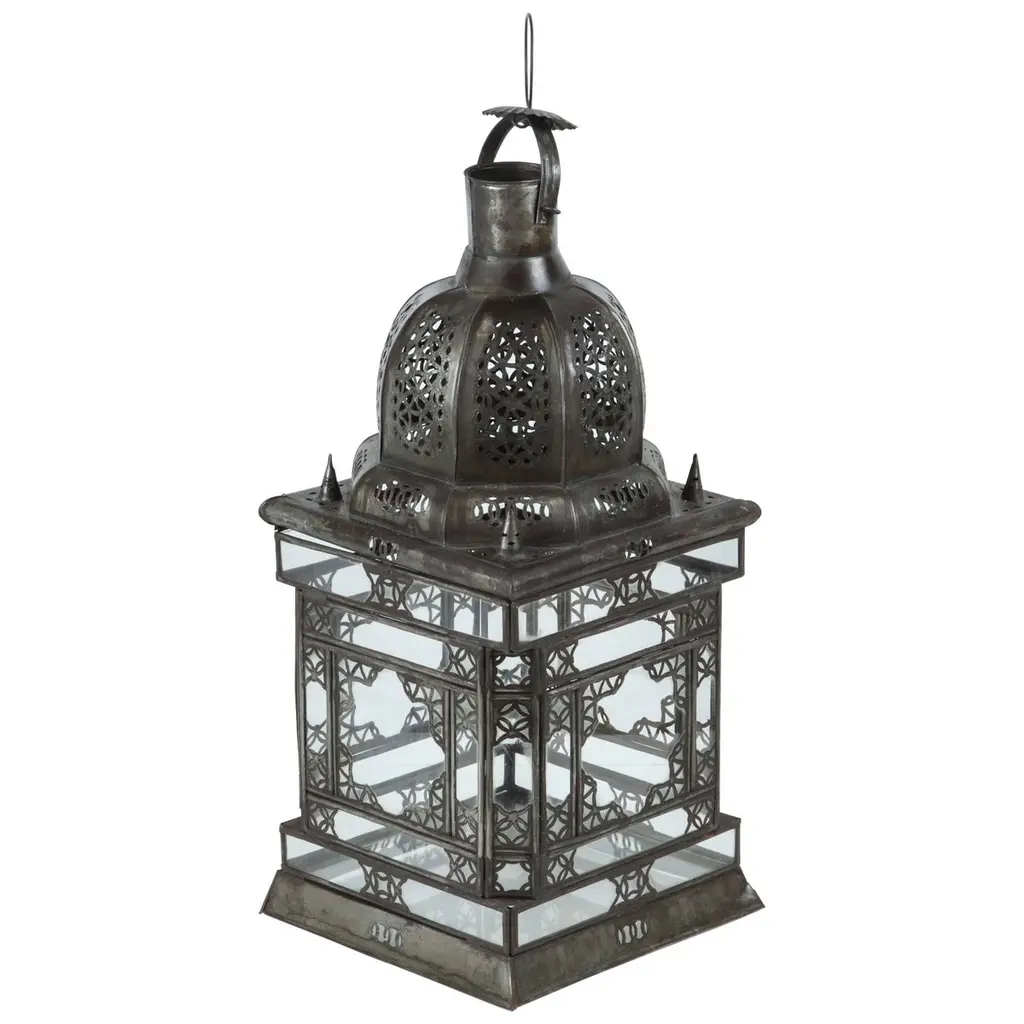 Small handcrafted Moroccan clear glass lantern adorned with open metal work Moorish filigree design.Hurricane tole candle lamp with open metal work design and clear glass.For indoor or covered area use only.Many of our customers place oil candles or tea lights inside the main section making a romantic and enjoyable decorative accent for entertaining friends and family.In a convenient portable size, may be suspended from loops or installed on any surface, as a sconce on a wall bracket or as a hurricane candle lantern.There is a small door to access the inside, could be rewired as a Moroccan pendant or wall sconce.DimensionsHeight: 15 in. (38.1 cm)Width: 5.5 in. (13.97 cm)Depth: 5.5 in. (13.97 cm)Multiple availableHandcrafted in Marrakech by local artisans.About the Moroccan lanterns:The metal and glass hand-crafted lantern from Morocco is a captivating pieces of artistry that combines the rich cultural heritage and exquisite craftsmanship of the region. Its design reflects the traditional Moroccan style, which is renowned for its intricate detailing and vibrant aesthetic. This vintage Moroccan lantern is meticulously handcrafted using a combination of metal and glass, resulting in a stunning blend of materials that enhances its overall beauty. The framework of the Moorish lantern is skillfully constructed from metal which provides a sturdy foundation and intricate patterns. The metalwork adorning the Moroccan light fixture features intricate filigree patterns, geometric motifs, and delicate scrollwork, all meticulously hand-cut by skilled Moroccan artisans in Marrakech.These ornate Moorish designs create mesmerizing shadows when the Moroccan hanging lantern is illuminated, casting enchanting patterns that dance across the surroundings. The glass components of the Moroccan lantern add a touch of elegance and brilliance to its appearance.Clear and multicolor glass panels are carefully inserted into the metal framework.These panels may showcase traditional Moroccan geometric Islamic designs. When the Moroccan lantern is lit from within, the glow emanating through the colorful glass panels transforms the surrounding space into a warm and inviting atmosphere.The interplay of light and shadow created by the intricate metalwork and the translucent glass adds depth and allure to the lantern's overall charm. The craftsmanship of this Moroccan light fixture is a testament to the dedication and skill of the artisans who meticulously handcraft each piece. The attention to detail, the artistic flair, and the fusion of metal and glass make this Moroccan lantern a true work of art, capturing the essence of Moroccan culture and heritage.Whether displayed as a centerpiece or hung from a hook, this metal and glass handcrafted lantern from Morocco effortlessly evokes a sense of enchantment, transporting you to the vibrant streets and magical ambiance of Moroccan nights.