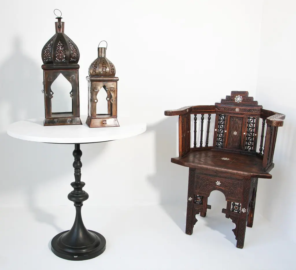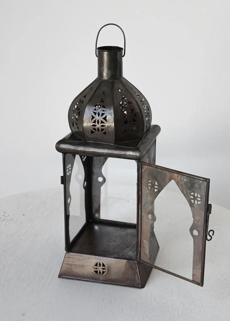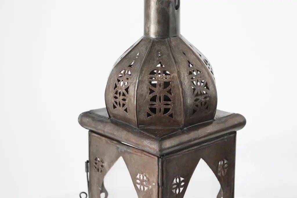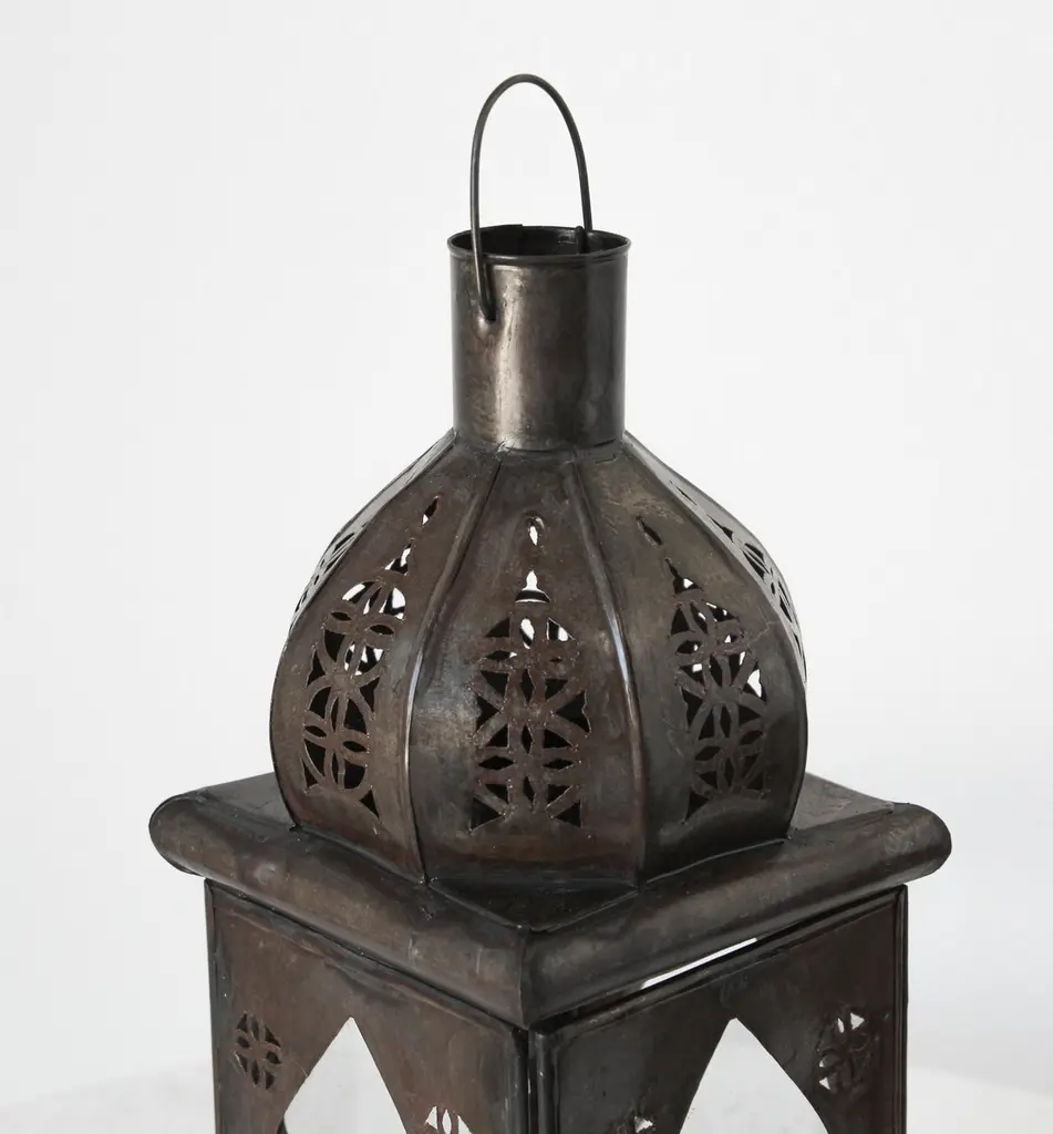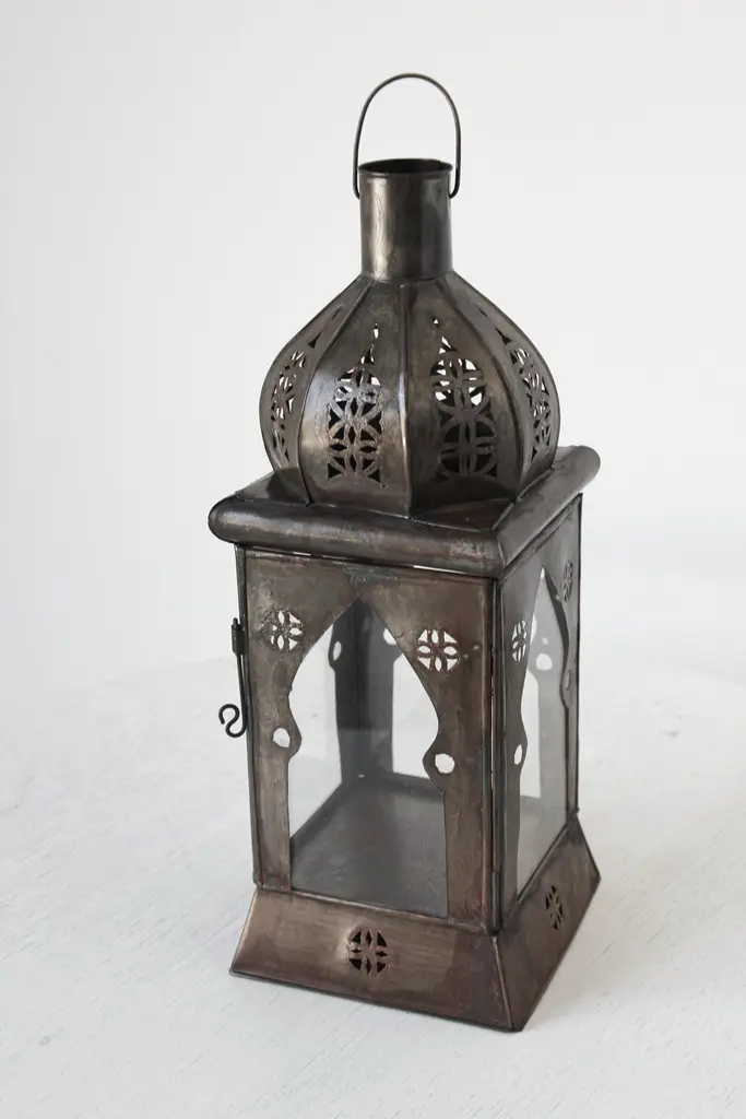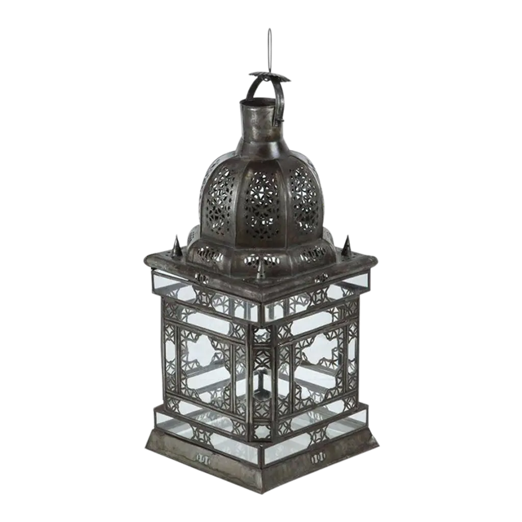 Small handcrafted Moroccan clear glass lantern adorned with open metal work Moorish filigree design.Hurricane tole candle lamp with open metal work design and clear glass.For indoor or covered area use only.Many of our customers place oil candles or tea lights inside the main section making a romantic and enjoyable decorative accent for entertaining friends and family.In a convenient portable size, may be suspended from loops or installed on any surface, as a sconce on a wall bracket or as a hurricane candle lantern.There is a small door to access the inside, could be rewired as a Moroccan pendant or wall sconce.DimensionsHeight: 15 in. (38.1 cm)Width: 5.5 in. (13.97 cm)Depth: 5.5 in. (13.97 cm)Multiple availableHandcrafted in Marrakech by local artisans.About the Moroccan lanterns:The metal and glass hand-crafted lantern from Morocco is a captivating pieces of artistry that combines the rich cultural heritage and exquisite craftsmanship of the region. Its design reflects the traditional Moroccan style, which is renowned for its intricate detailing and vibrant aesthetic. This vintage Moroccan lantern is meticulously handcrafted using a combination of metal and glass, resulting in a stunning blend of materials that enhances its overall beauty. The framework of the Moorish lantern is skillfully constructed from metal which provides a sturdy foundation and intricate patterns. The metalwork adorning the Moroccan light fixture features intricate filigree patterns, geometric motifs, and delicate scrollwork, all meticulously hand-cut by skilled Moroccan artisans in Marrakech.These ornate Moorish designs create mesmerizing shadows when the Moroccan hanging lantern is illuminated, casting enchanting patterns that dance across the surroundings. The glass components of the Moroccan lantern add a touch of elegance and brilliance to its appearance.Clear and multicolor glass panels are carefully inserted into the metal framework.These panels may showcase traditional Moroccan geometric Islamic designs. When the Moroccan lantern is lit from within, the glow emanating through the colorful glass panels transforms the surrounding space into a warm and inviting atmosphere.The interplay of light and shadow created by the intricate metalwork and the translucent glass adds depth and allure to the lantern's overall charm. The craftsmanship of this Moroccan light fixture is a testament to the dedication and skill of the artisans who meticulously handcraft each piece. The attention to detail, the artistic flair, and the fusion of metal and glass make this Moroccan lantern a true work of art, capturing the essence of Moroccan culture and heritage.Whether displayed as a centerpiece or hung from a hook, this metal and glass handcrafted lantern from Morocco effortlessly evokes a sense of enchantment, transporting you to the vibrant streets and magical ambiance of Moroccan nights.