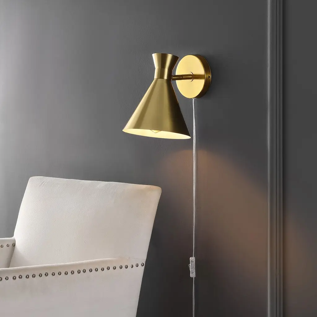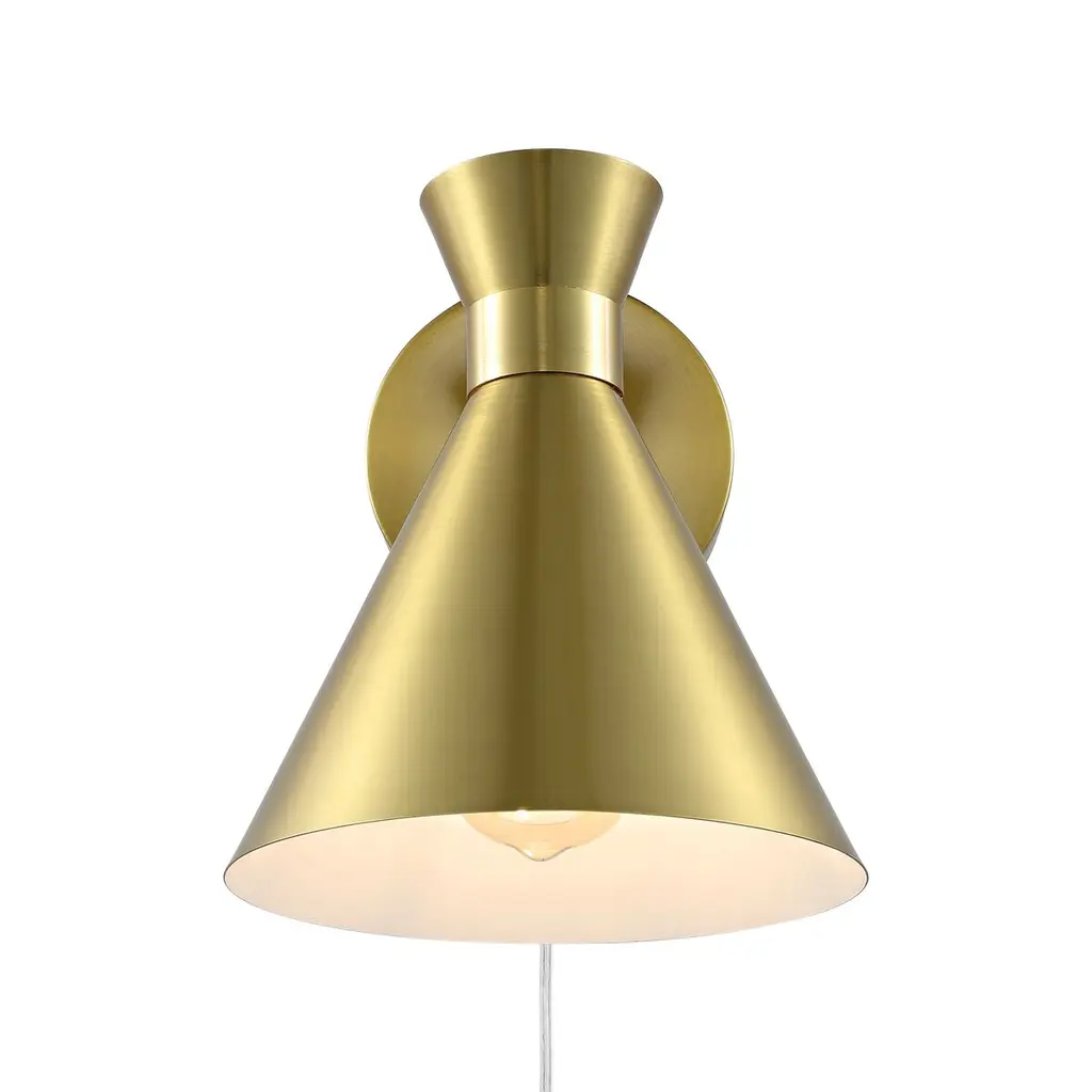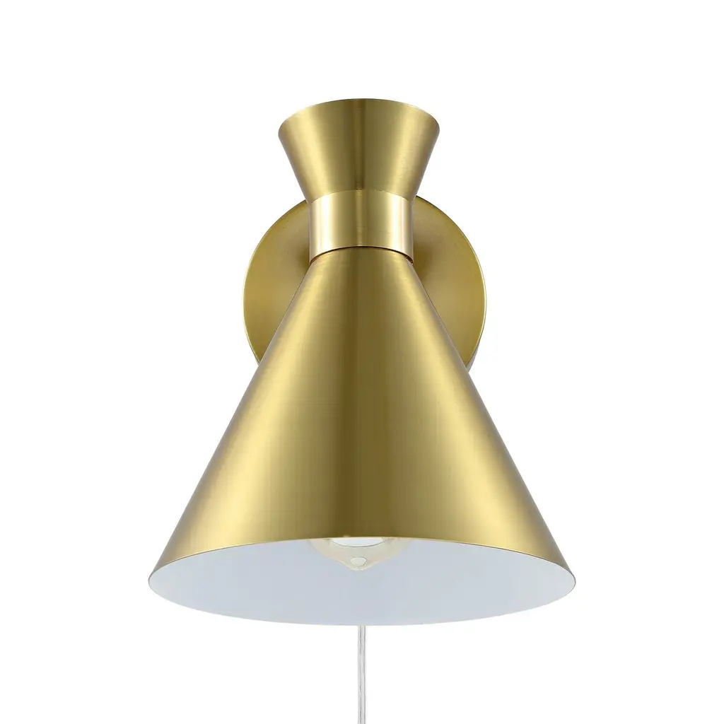 Strike an impact with our chic and stylish Morris wall sconce. The mid-century charm of our wall sconce is accentuated with a stunning mix of finishes. A double cone shade extends from a round back plate to attain a sleek geometric appeal. Bringing added style and definition to our modern wall sconce, it casts focused light downwards, making it a perfect complement to a stylish reading nook, bedroom, or home office.
