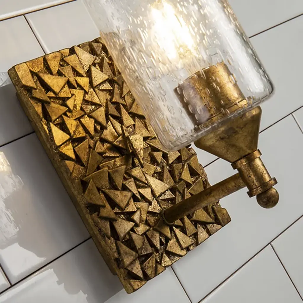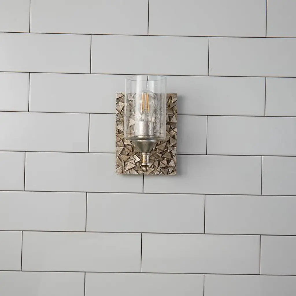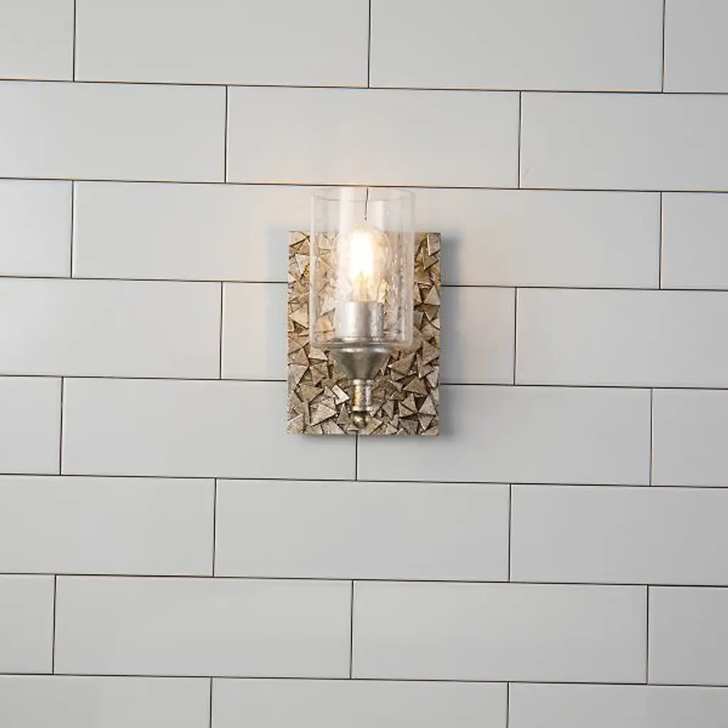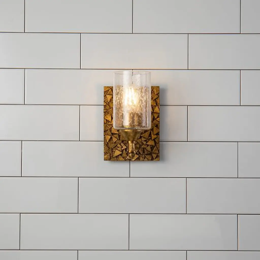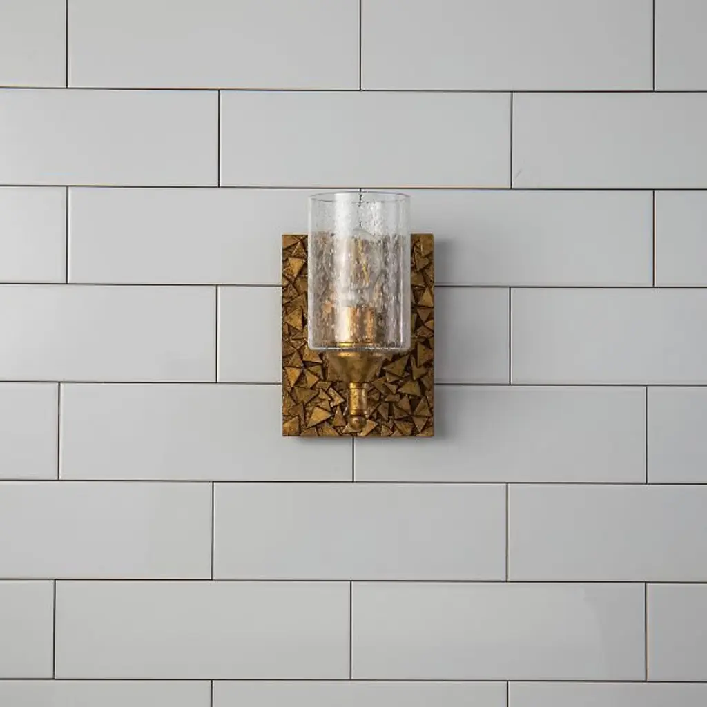 The Mosaic Wall Sconce by Lucas McKearn creates a charming design featuring an ornate rectangular backplate, a curved arm, and clear seeded glass. It makes a bold statement with its elegant style and dramatic art-inspired design. This sconce creates a vintage-like, industrial aesthetic, allowing your rustic wall light to be flexible enough to work in a bathroom or home office.